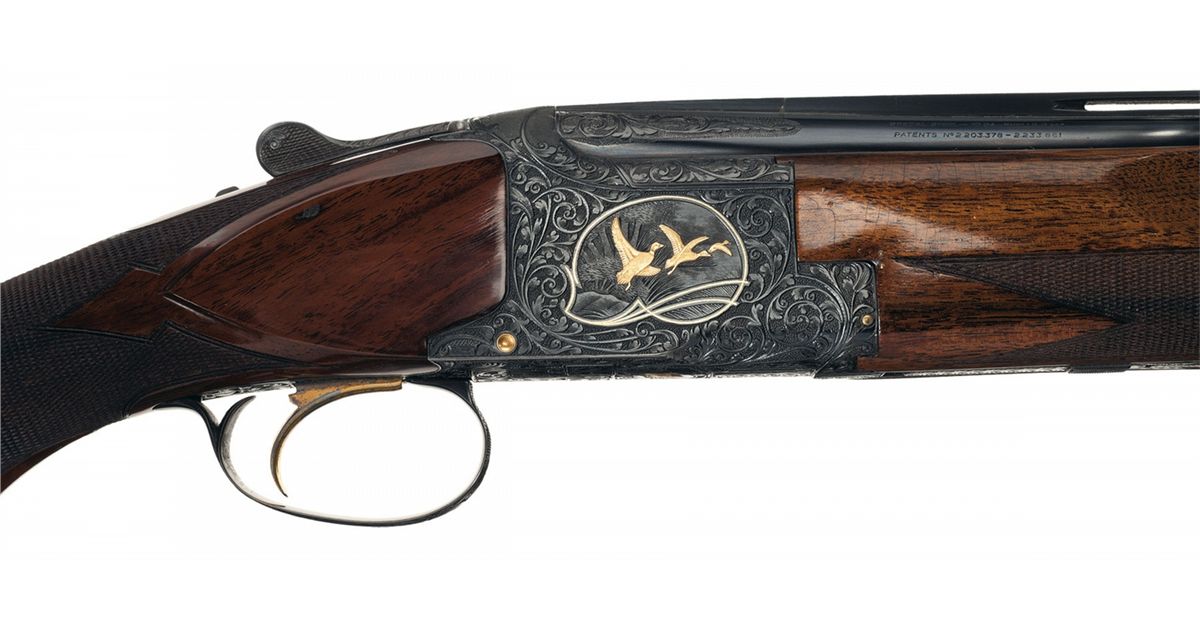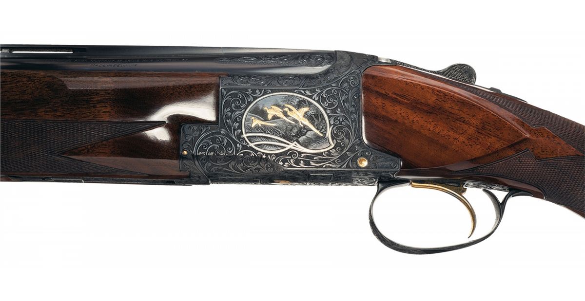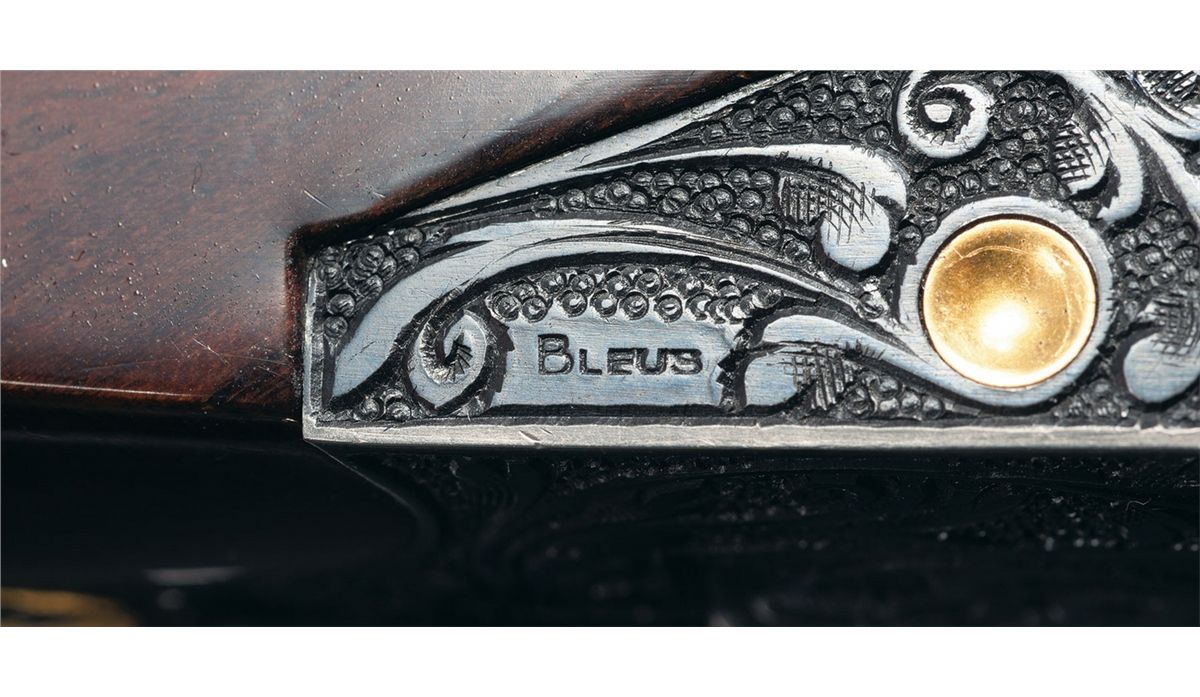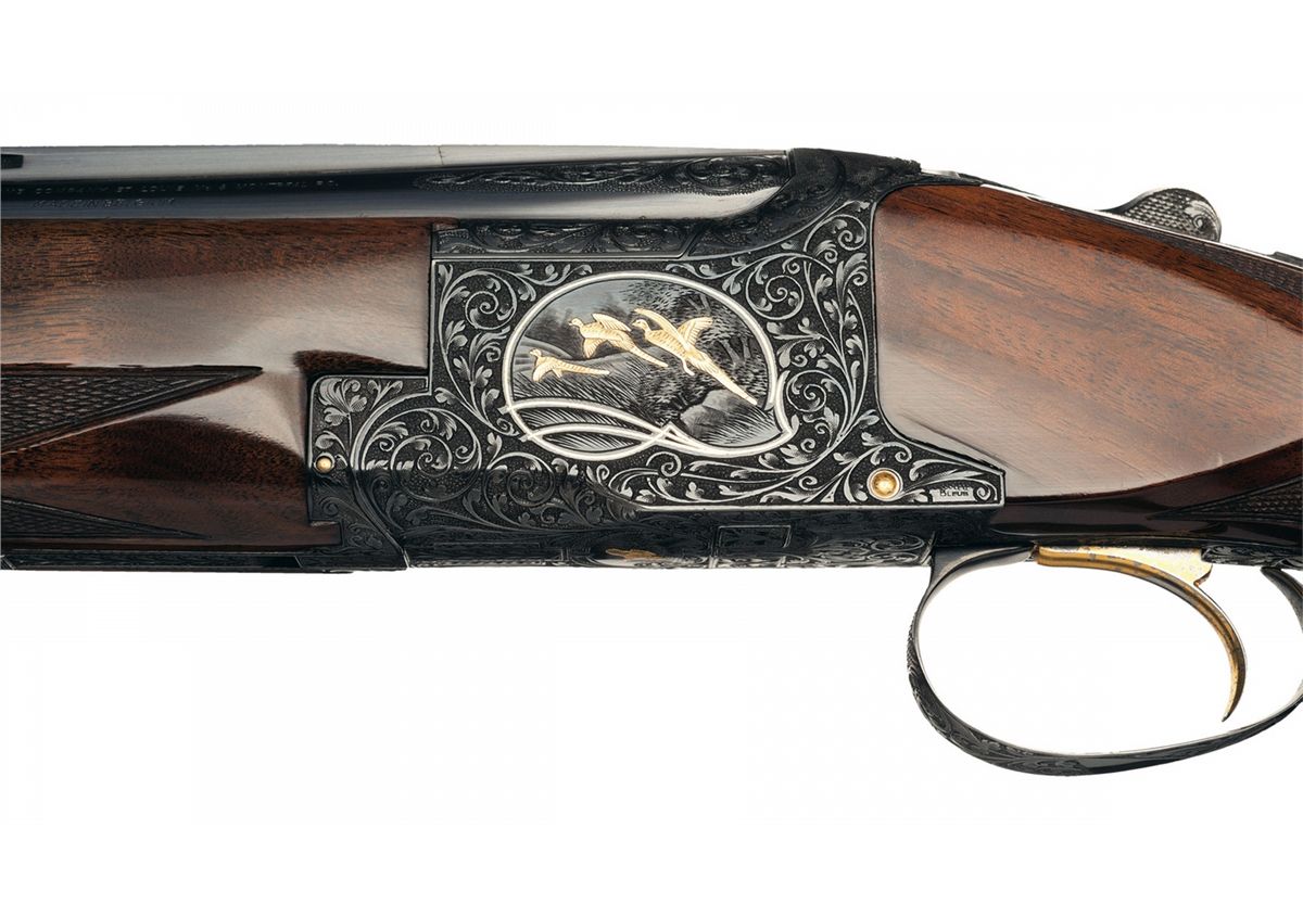 Manufactured in 1967. Dual ivory beads on the matte vent rib, choked skeet/skeet with 2 3/4 inch chambers and ejectors. The top breech end sides of the top barrel featured floral scroll engraving with a punch dot background. The receiver, trigger guard, break lever and forearm hardware also feature floral scroll engraving with a punch dot background. In addition the left side of the receiver has three gold inlaid pheasants with a gold in laid wire border, the right side has three gold inlaid ducks with the same border and the bottom has a gold inlaid quail. The lower rear sides of the receiver is signed "BLEUS". The shotgun comes with a titanium three gauge set in 410, 28, and 20 gauge barrel tubes. Gold washed single trigger, tang mounted safety/selector with gold "S", "O" and "U". Mounted with an extra fancy high gloss walnut checkered forearm and pistol grip stock with a vented Browning recoil pad and gold initial oval. Complete in a John Hall takedown plastic combination locking case with brown lining, with compartments for the shotgun and all the tubes. Length of pull is 14 5/8 inches.