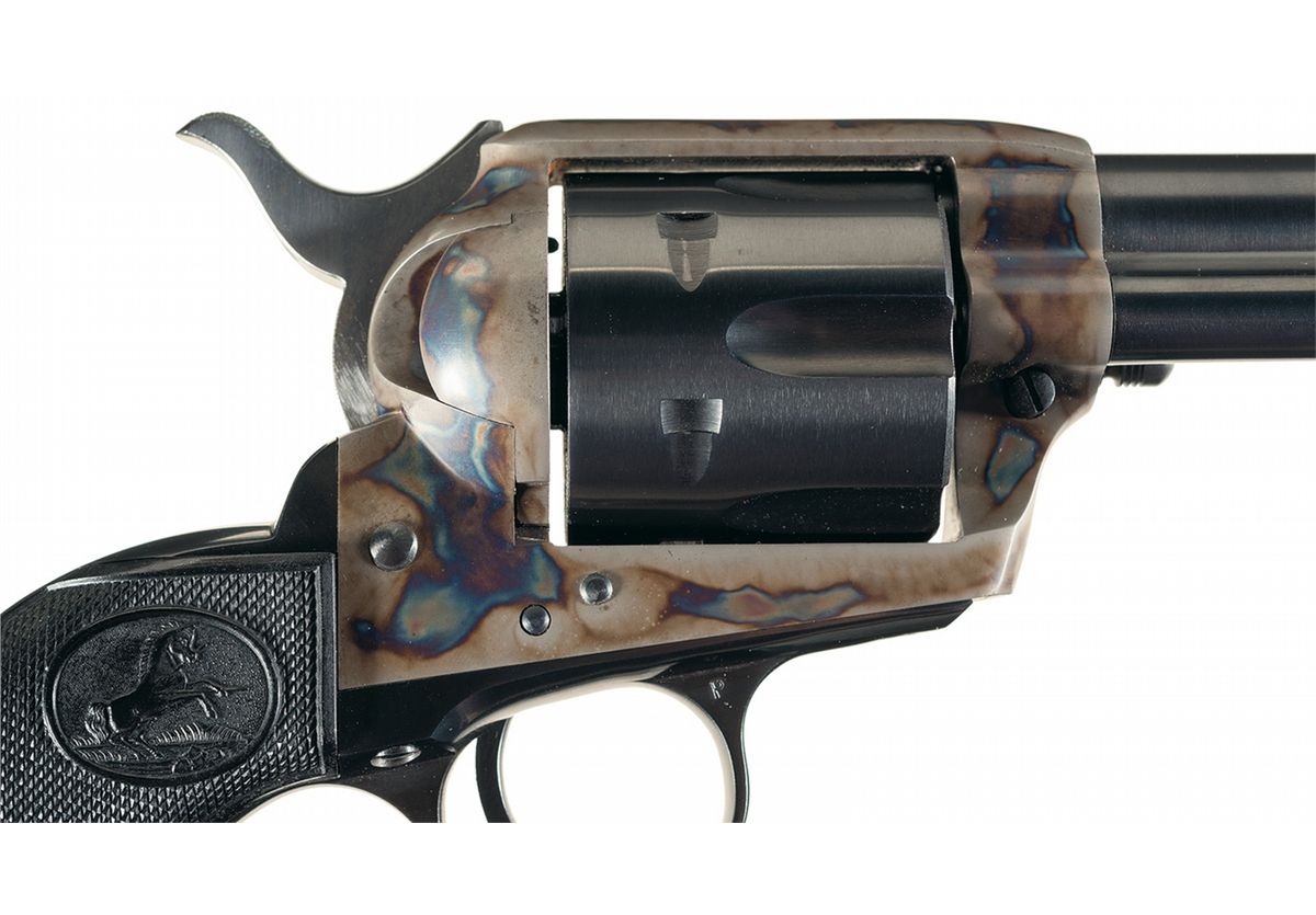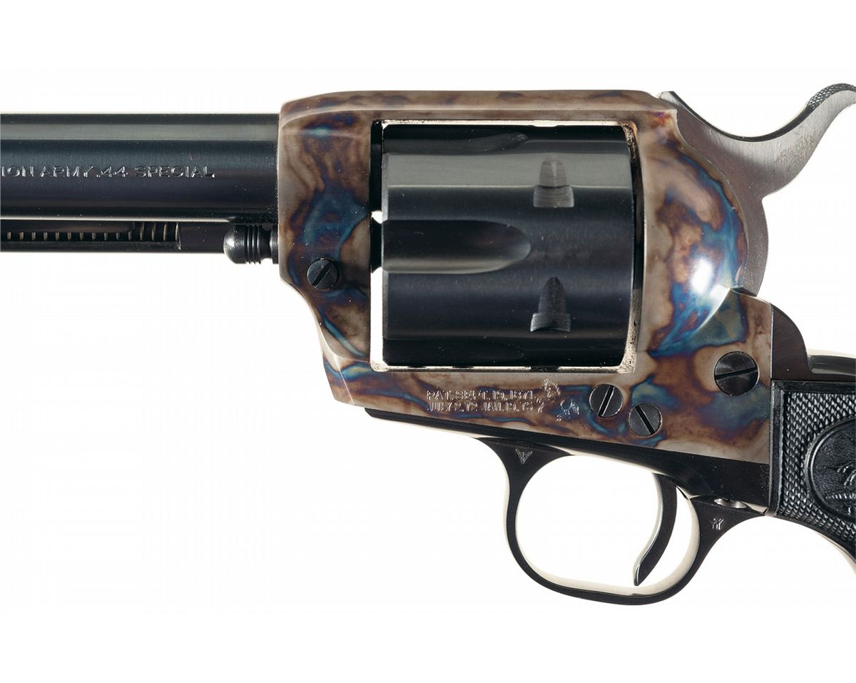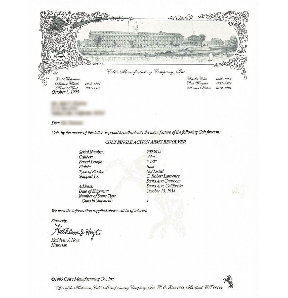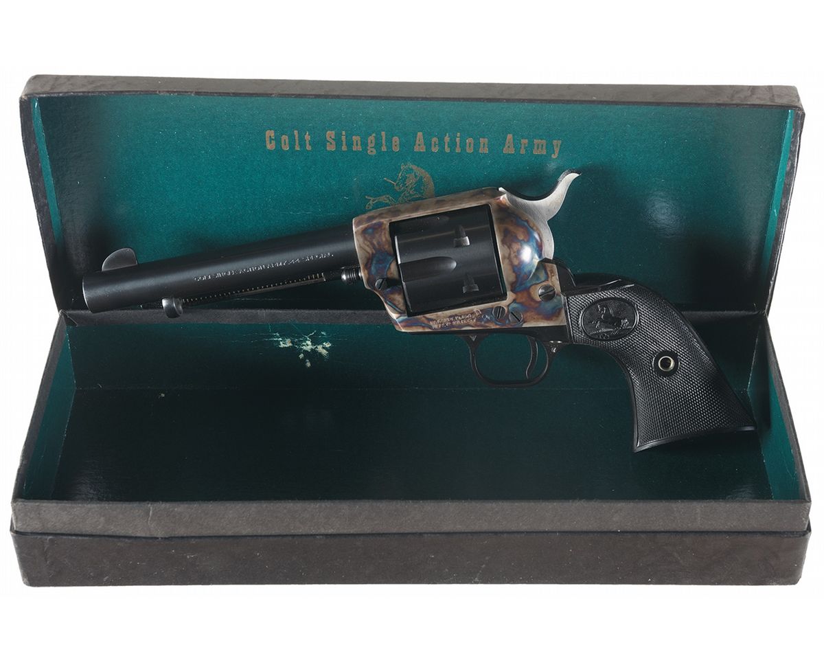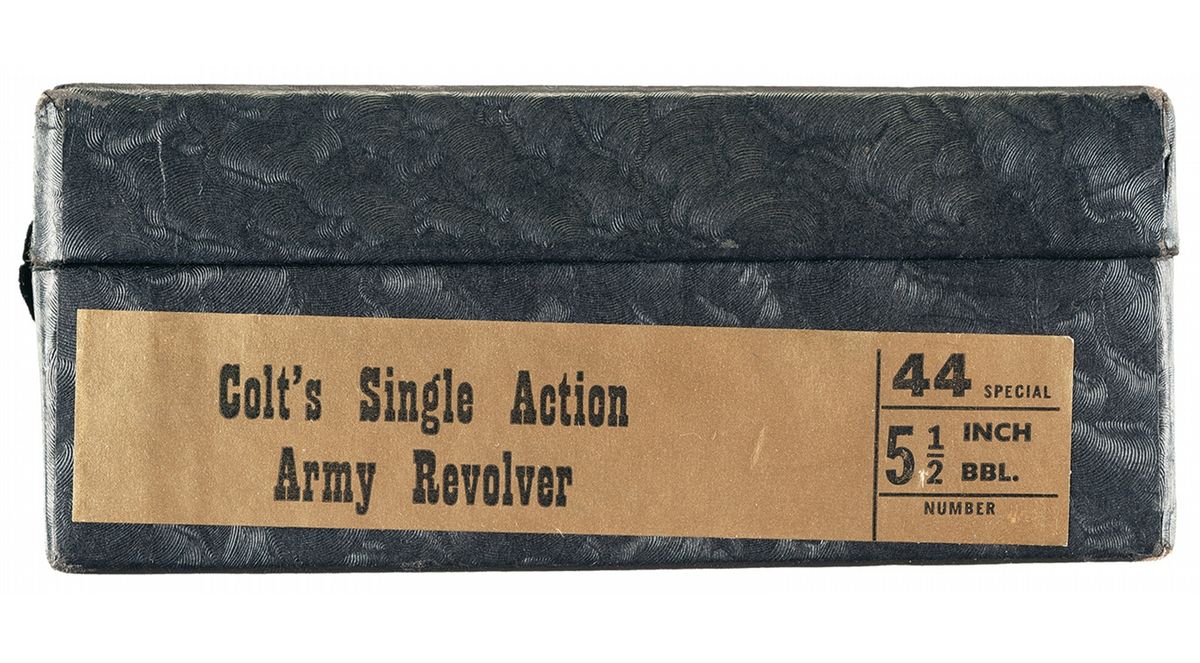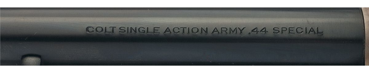 This is an outstanding example of an early Second Generation Single Action Army in scarce 44 special caliber. Manufactured in 1958, this revolver is 1 of only about 2,075 Second Generation Single Action Army revolvers chambered in the 44 Special caliber. According to Colt expert and researcher Don Wilkerson the 44 Special was introduced in early 1958 and ended in 1966 with only the 5 1/2 and 7 1/2 inch barrels available in the caliber. Wilkerson states that "the .44 Special revolvers are by far the rarest caliber." Collectors began buying these Second Generation revolvers and storing them as future collectors items. According to consignor notes a gun shop in Southern California, the Santa Anna Gunroom decided to purchase one example of every caliber, barrel length and finish to form a collection of dozens of Single Action Army revolvers. This revolver was one they purchased and stored for their personal collection. The barrel has the standard one-line address on top, "COLT SINGLE ACTION ARMY .44 SPECIAL" on the left and two-line, three patent dates on the left side of the frame followed by the Rampant Colt. Matching numbers, blade front and frame notch rear sights, blue with casehardened finish and fitted with checkered hard rubber grips with the Rampant Colt in an oval at the top. The accompanying factory letter verifies the caliber, barrel length, blue finish with grips as "Not Listed" and that it was shipped as 1 to Santa Anna Gunroom, Santa Anna, California on October 13, 1958. Comes with the original black hinged lid box numbered to the gun. In the box is the original waxed paper, Colt warranty card, manual, "Handling the Handgun" pamphlet and cleaning brush.