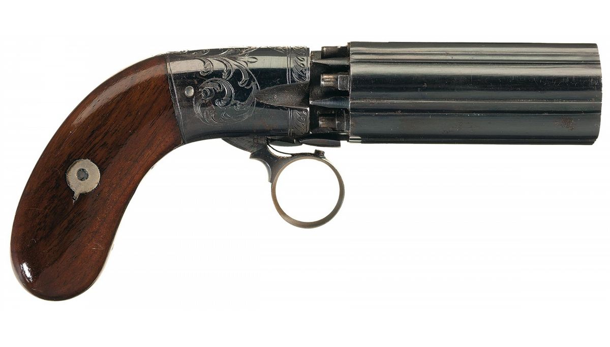 Manufactured from the late 1830 to the 1850s. The face of the barrel cluster is marked with the number "2" and the top of the frame is marked "BLUNT & SYMS/NEW YORK." High polish blue finish on the open scroll engraved frame and 6-shot fluted barrel and fitted with bag shaped high gloss piano finished grips featuring German silver screw escutcheons. The pistol is in a partitioned wooden case lined in multicolored fabric holding the following accessories: double face eagle powder flask, key, two cavity iron bullet mold, mushroom head ramrod/cleaning rod, combination tool and Hicks' percussion cap tin with caps.