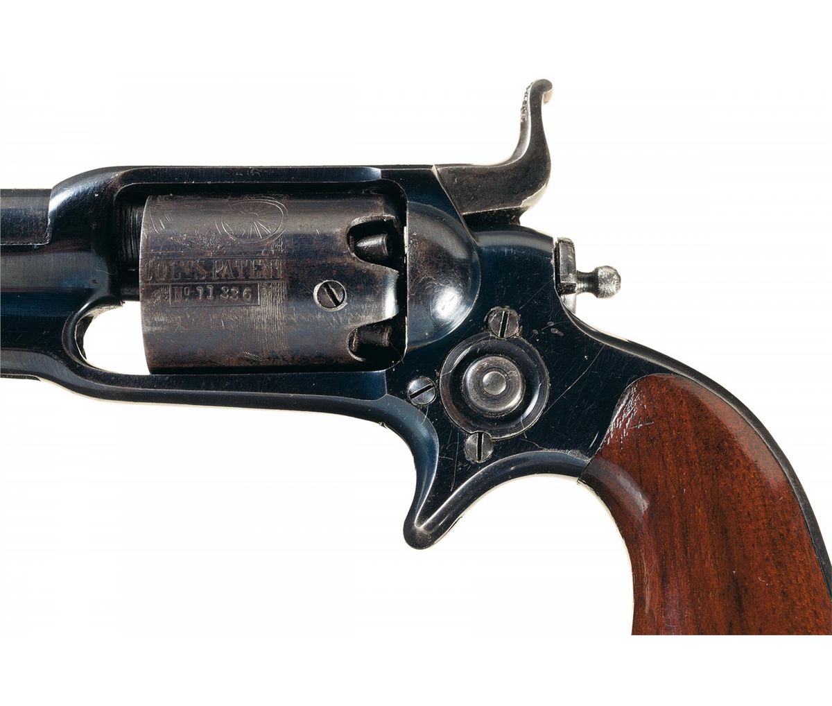 This is an excellent example of a Colt Model 1855 7th Model Sidehammer Pocket revolver that was manufactured in 1867. This model is found in the serial number range of 11,075 to 14,000 with a total production of approximately 2,925. The Model 7 has a round loading lever with a Navy type latch and catch. The top of the barrel is roll-stamped "ADDRESS COL. COLT/NEW-YORK U.S.A." near the breech. The cylinder is roll-engraved with the Stagecoach Holdup scene and "COLT'S PATENT". The matching serial number, "11336" is marked on the underside of the barrel, the cylinder and on the butt. The revolver has a high polish blue finish on the barrel, frame and five-shot cylinder, the loading lever, hammer and cylinder pin are casehardened and it is fitted with a smooth one-piece varnished walnut grip. The revolver comes in a mahogany American style case with purple velvet lining and five compartments. In the case is a blue iron double cavity bullet mold with "31PKT" stamped on the right block and "COLT'S/PATENT" stamped on the iron sprue cutter, a Pocket Model powder flask with detailed embossed eagle and crossed revolvers on both sides of the body, a gold plated brass top with fixed charger and niter blue spring, a blue L-shaped nipple wrench/screwdriver and a sealed tin of 100 Winchester/Goldmarks percussion caps.