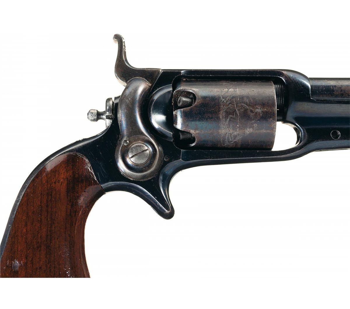 Excellent. The revolver retains 90% plus of the bright original high polish blue finish with wear mostly limited to some minor flaking on the barrel and cylinder and some thinning on the back strap. The cylinder retains at least 95% of the Stagecoach Holdup scene. The hammer and loading lever retain most of the original vivid case colors. The grip is excellent, 95% of the piano finish remains showing some lower edge wear and a small shallow gouge on the lower right rear. The markings are crisp and clear. The action is crisp and functions perfectly. The case is good with some minor cracks in the lid but the exterior shows minimal handling wear. The velvet lining on the lid is very good with wear limited to some minor compression marks. The lining in the case bottom is good with moderate wear. The lining is dusty and discolored from contact with the revolver and accessories. The bullet mold is very good with 75% of the original blue finish. The powder flask is excellent with 90% plus of the brown lacquer finish on the body and 95% of the gold plated finish on the brass top and charger. The flask body shows only light handling wear. The screwdriver/nipple wrench is excellent with most of the original blue finish. The cap tin has not been opened and is excellent, however is not original to the case. This is an outstanding example of a Colt Model 1855 7th Model Sidehammer Pocket Revolver with factory case and accessories.