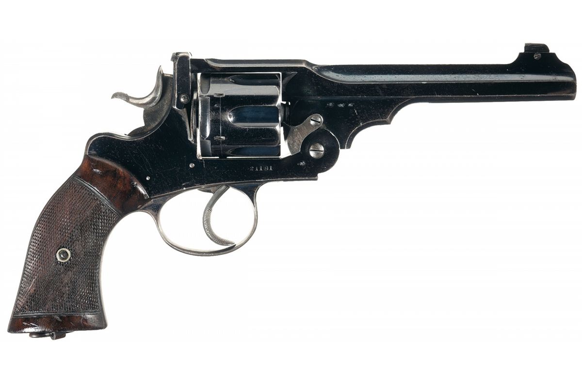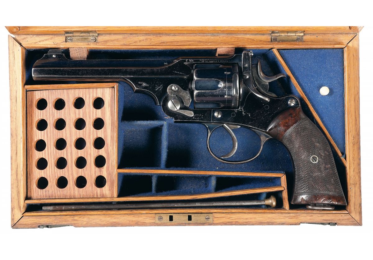 This excellent cased example of a Webley "WG" Target Model Double Action revolver features adjustable target front and rear sights. The top strap is stamped "WG TARGET MODEL" on the left side and the lower left side of the frame is marked "WEBLEY/PATENTS" with the Winged Bullet trademark. The caliber "450/455" and "ENGLAND" export markings are stamped on the left side of the barrel lug. British "crown/V", "crown/CP" and "NP" proof and inspection marks are stamped on the right barrel lug with "crown/V" and "crown/CP" inspection marks stamped on each cylinder chamber at the rear. A double arrow "Sold Out Service" mark is stamped on the left side of the barrel lug and a British Government "Broad Arrow" property mark is stamped on the left side of the top strap. The full serial number is on the right side of the frame with the partial serial number "181" stamped on the bottom of the barrel lug and "81" stamped on the bottom of the barrel latch. The revolver has a high polish commercial blue finish with bright trigger, hammer, cylinder latch and finely checkered two piece grips. The oak British style case has a round brass escutcheon, brass reinforcing screws, blue felt lining and has six compartments including a twenty-round cartridge block. A brass cleaning rod is included in the case.