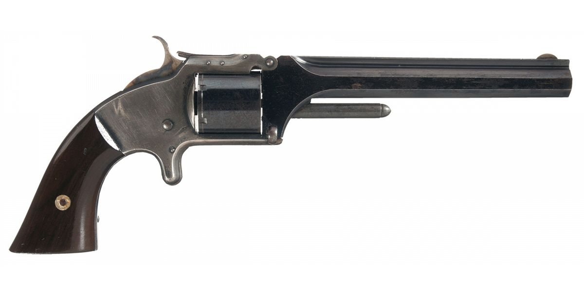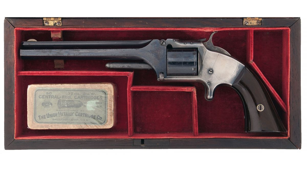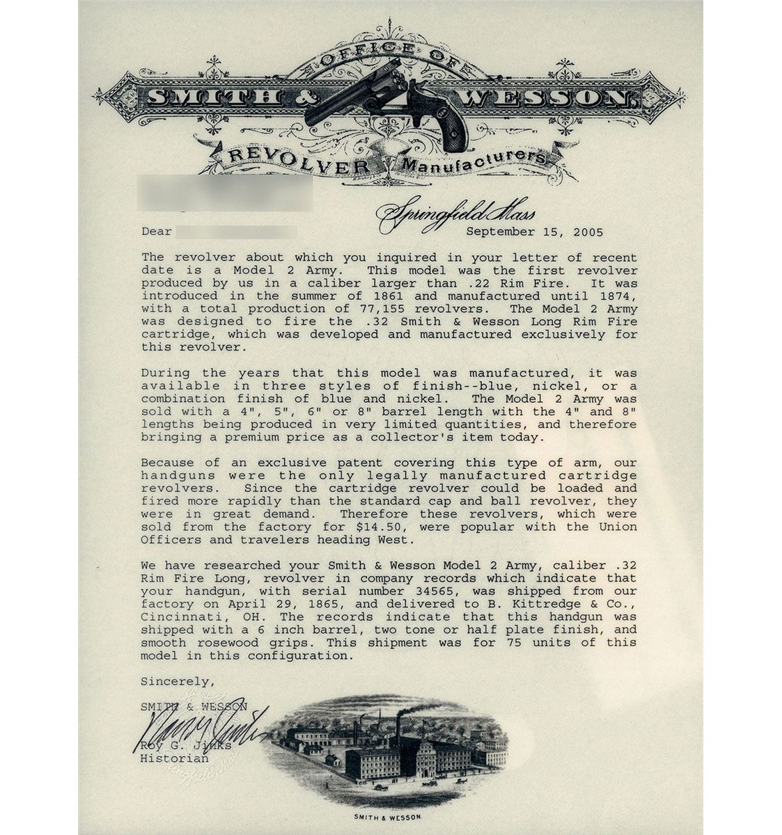 This is a magnificent example of a Smith & Wesson Model 2 Army revolver with original case. The included factory letter confirms the barrel length, two-tone blue and silver finish and rosewood grips. The revolver was part of a 75 unit shipment of this configuration and was shipped on April 29, 1865 to B. Kittredge & Co., Cincinnati, Ohio. Note this revolver was shipped 20 days after Lee surrendered at Appomattox Court House. These revolvers original sold for $14.50 and were popular with Union Officers and travelers heading West. The top of the barrel rib is marked "SMITH & WESSON SPRINGFIELD, MASS." with the 6-shot unfluted cylinder marked with the 1865, 1859 and 1860 patent dates marking. The matching assembly number "XX4" appears on the rear of the barrel lug and front cylinder face with the serial number stamped on the butt. The frame has a spur trigger and three-pin top strap. As stated, the revolver is blue with silver plated frame and fitted with varnished smooth two piece rosewood grips. The right grip panel is numbered to the gun. The original partitioned wooden case is lined in red velvet. The top of the lid has a blank initial plaque. Also with the revolver is a 50 round box of UMC .32 S&W CF cartridges.