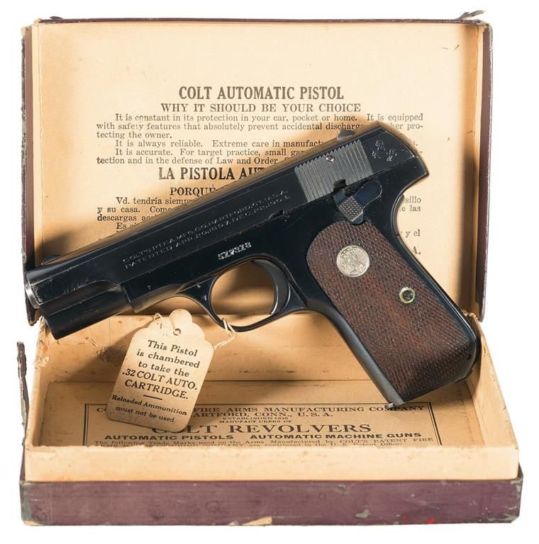 Manufactured in 1921, this model was the second pocket automatic Colt manufactured and another of John Browning's designs. It developed into one of Colt's most successful pistols. The left side of the slide is marked with the two line address/1897 and 1903 patent dates with the Rampant Colt behind the serrations and the right side is marked "COLT AUTOMATIC/CALIBRE 32 RIMLESS SMOKELESS". The serial number is marked on the left side of the frame. Fixed sights, blue finish including the barrel with bright chamber, two tone magazine marked "CAL. 32/COLT" on the bottom and fitted with checkered walnut grips with silver Colt medallions. Complete with the original maroon hinged lid box numbered to the gun, with the blue and white end label, hanging tag and instructions.