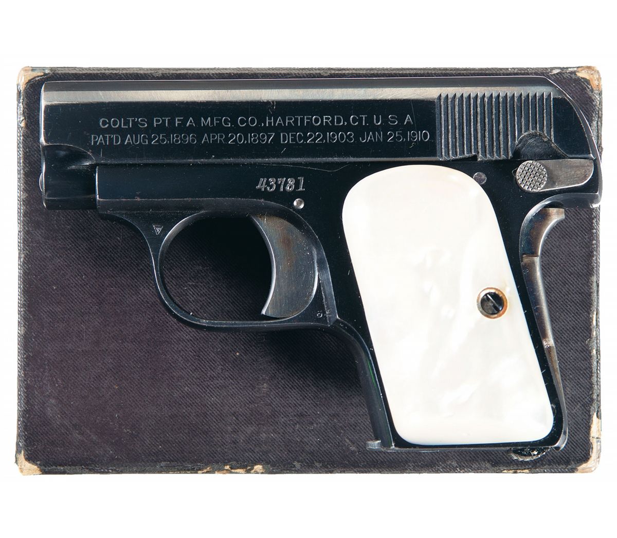 Manufactured in 1911. Blade and notch sights with the two line address and patent dates on the left side of the slide, the Rampant Colt behind the serrations and "COLT AUTOMATIC/CALIBRE 25" under the ejection port on the right side. The serial number is marked on the left side of the frame with the "VP" proof on the left upper front of the trigger guard bow and "5" on the lower left side. Blue finish including the unmarked magazine and casehardened trigger, thumb and grip safeties. Fitted with smooth factory pearl grips. Complete with a factory original black hinged lid box with manual.
