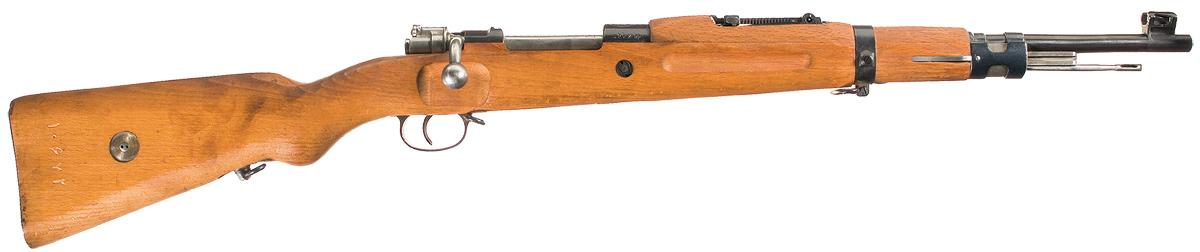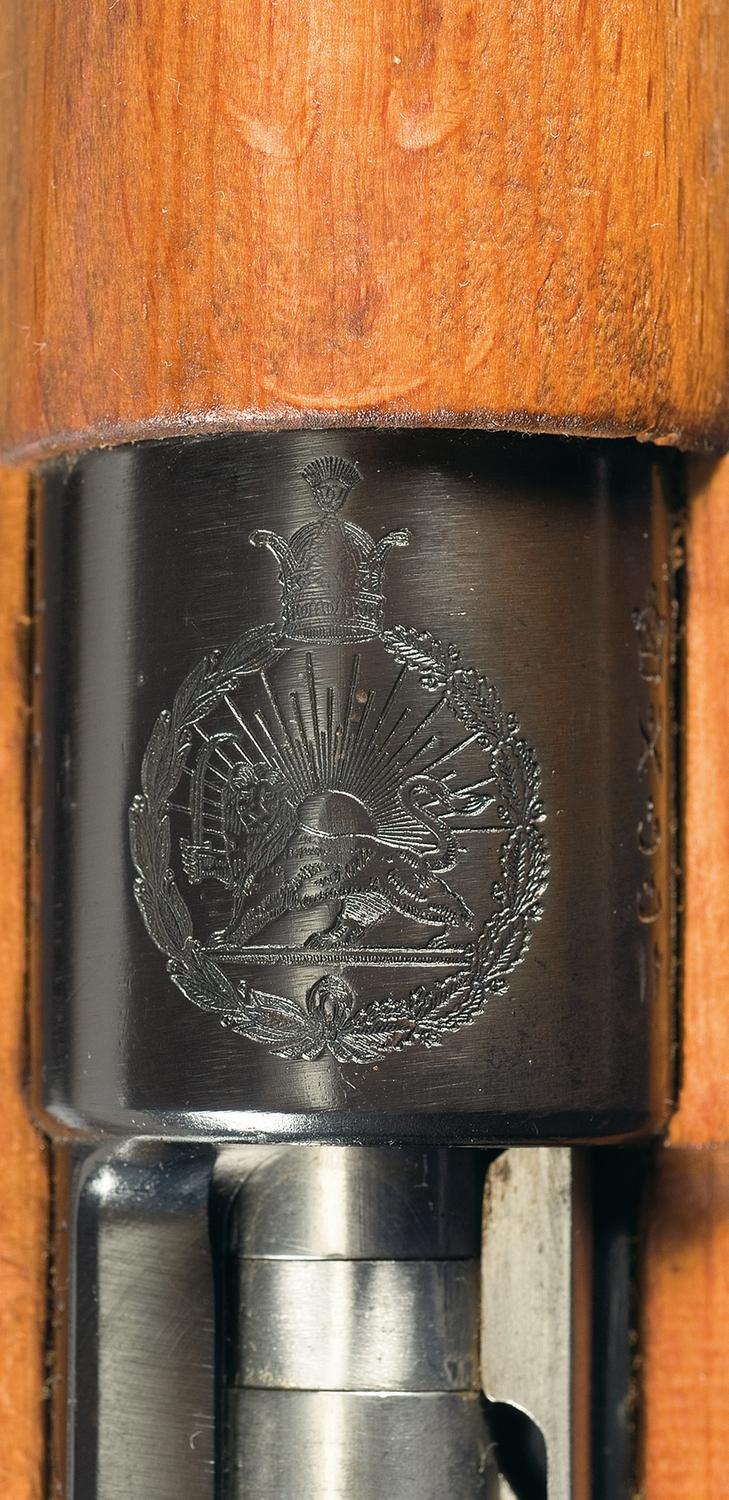 The top of the receiver is marked with the large Persian Crest which depicts the Persian Crown at the top, a standing lion in the middle holding a Scimitar, with the rising sun in the background and an intertwined wreath surrounding it. The receiver markings and serial number are all in Farsi. This rifle also features an unique fixed front sight with ears and a tangent rear sight. The components are the milled "H" pattern front and a rear barrel band with a saddle ring. The stock has swing swivels and is fitted with a blue finished buttplate. The right side of the stock has matching Farsi serial number directly below the blank stock disc.