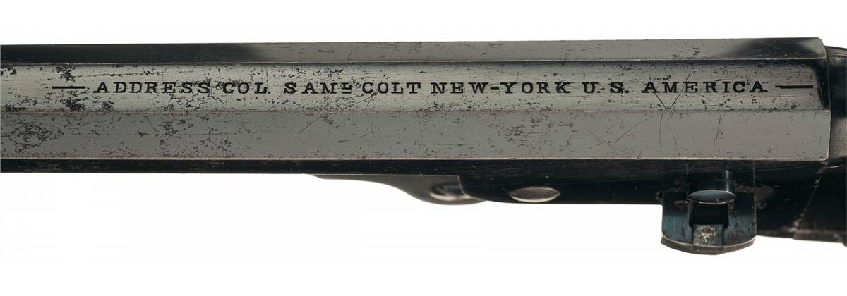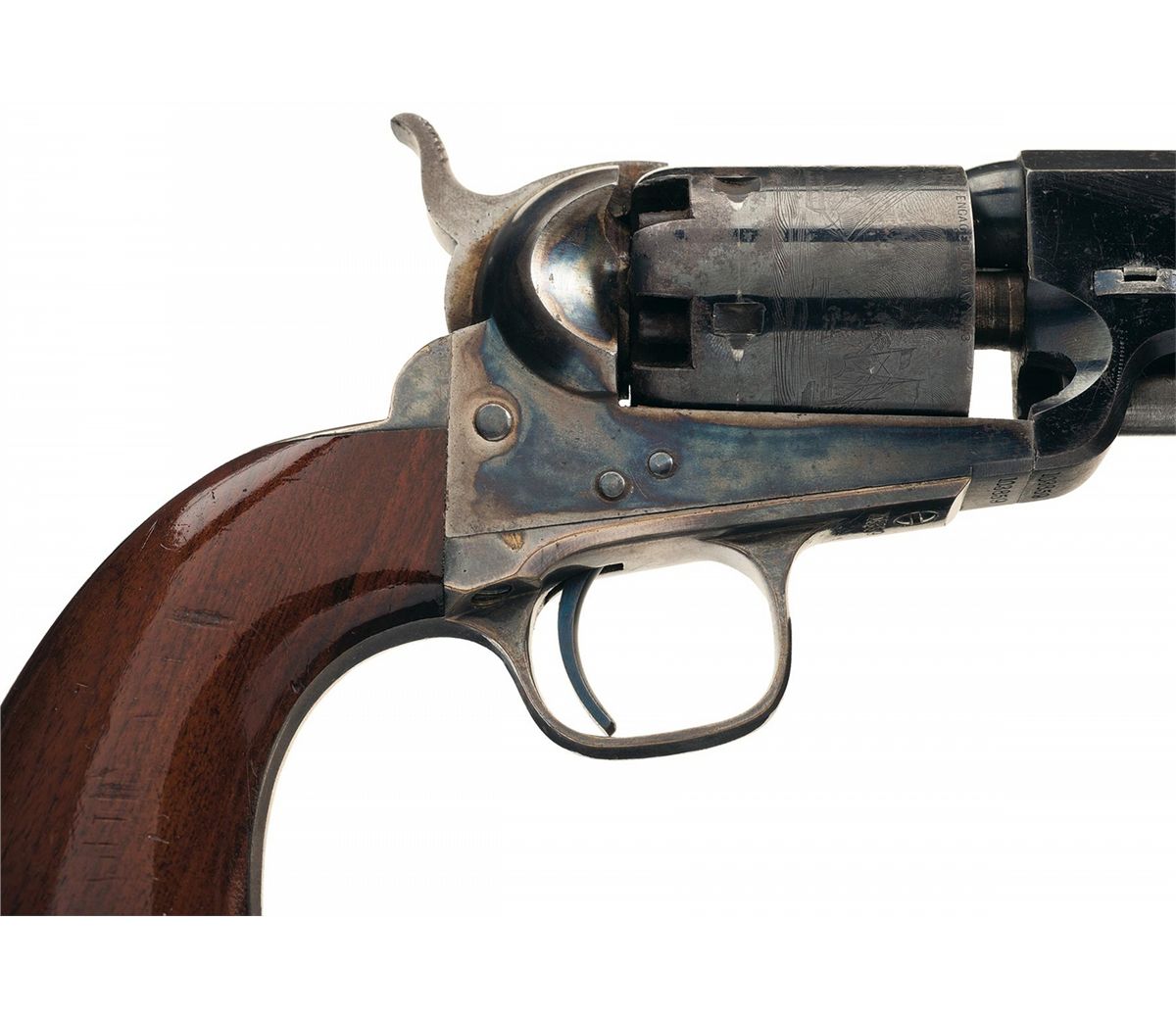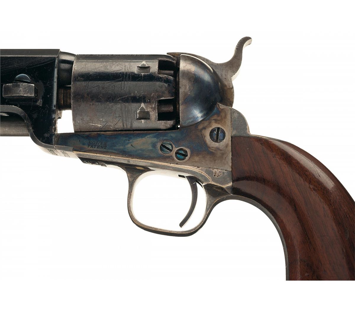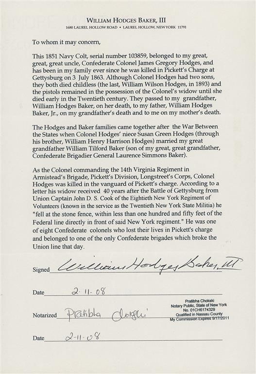 This is an outstanding example of a Colt Model 1851 Navy revolver that was manufactured in 1861. The top barrel flat is marked "--ADDRESS COL SAML COLT NEW-YORK U.S. AMERICA--", the left side of the frame is marked "COLTS/PATENT". The matching serial number is marked on the barrel, frame, trigger guard and back strap. The partial serial number "3859" on the loading lever and "03859" on the wedge. The cylinder is roll engraved with the naval battle scene. Blue finished barrel, casehardened loading lever, frame and hammer and silver plated brass trigger guard and back strap. Fitted with a smooth one piece varnished walnut grip. This revolver comes with a signed and notarized affidavit from William Hodges Baker III stating that this revolver was the personal property of his Great-Great-Great Uncle James Gregory Hodges who was a Colonel for the Confederacy in the Civil War. The Colonel was born December 25, 1828 in Portsmouth, Virginia, and graduated from the University of Pennsylvania. He was a physician and served as Mayor of Portsmouth. In 1856 he was commissioned Colonel of the 3rd Virginia Volunteers, a state militia unit which was mustered to serve in the Confederacy on April 20, 1861. In May of 1861, the Governor of Virginia appointed him command of the newly formed 14th Virginia Infantry. At the Battle of Antietam, the Colonel was listed as the Commander of Armistead's Brigade at Sharpsburg. Commanding the 14th Virginia in Armistead's Brigade, Pickett's Division, Longstreet's Corps, Colonel Hodges was killed leading his men in the Vanguard of Pickett's charge during the battle of Gettysburg on July 3, 1863. According to a letter sent to Colonel Hodges' widow 40 years after the battle from Captain John D.S. Cook of the 18th New York Regiment of Volunteers (known in service as the 20th New York New York State Militia), Colonel Hodges "fell at the stone fence, within less than one hundred and fifty feet of the Federal line directly in front of said New York Regiment". Hodges was one of eight Confederate Colonels who lost their lives in Pickett's charge and he belonged to one of the only Confederate Brigades which broke the Union line that day. The specific burial site of Col. Hodges is currently unknown but was reported to be in the field near where he fell. Hodges remains were probably removed in 1872 and buried in the "Gettysburg Dead" section of Hollywood Cemetery in Richmond, Virginia. A government grave marker for the Colonel exists in Cedar Grove cemetery at Portsmouth, Virginia. The affidavit states that this Colt 1851 Navy serial number 103859 "belonged to my great-great-great uncle Confederate Colonel James Gregory Hodges, and has been in my family ever since he was killed in Pickett's Charge at Gettysburg on 3 July 1863. Although Colonel Hodges had two sons, they both died childless (the last, William Wilson Hodges in 1893) and the pistol remained in the possession of the Colonel's widow until she died in the Twentieth Century. They passed to my grandfather, William Hodges Baker, on her death, to my father, William Hodges Baker Jr., on my grandfather's death and to me on my Mother's death." The affidavit further states that "The Hodges and Baker families came together after the War between the States when Colonel Hodges' niece Susan Green Hodges (through his brother, William Henry Harrison Hodges) married my great grandfather William Tilford Baker (son of my great, great grandfather, Confederate Brigadier General Laurence Simmons Baker). The affidavit is notarized and signed by William Hodges Baker III (a direct descendant of James Gregory Hodges) on 12/11/08. The affidavit affirms that this Colt revolver was owned by Colonel Hodges. The Colonel is immortalized in James F. Crocker's "Colonel James Gregory Hodges, His Life and Character: Address Before Stonewall Camp, Confederate Veterans, Portsmouth, Virginia, June 18th, 1909." Crocker, a Confederate officer who was wounded and taken prisoner in Pickett's charge, praised Hodges' leadership at Pickett's Charge: "Col. Hodges led his regiment in this memorial charge with conspicuous courage and gallantry. He was an able and experienced officer. His devotion to his official duties was never surpassed. His regiment was never in the presence of the enemy without his being in command?He sleeps in the trenches with those who made that charge of Pickett's division immortal." Colonel James Gregory Hodges is listed in the War of the Rebellion, the official records of the Union and Confederate armies. More information on the Hodges family is housed at the Old Dominion University, Norfolk, Virginia, which has the Hodges Family Papers of generations from 1753 to 1981. Most of the collection centers on the Civil War era. Due to the remarkable condition, writer believes this revolver was not with him at the time of death.