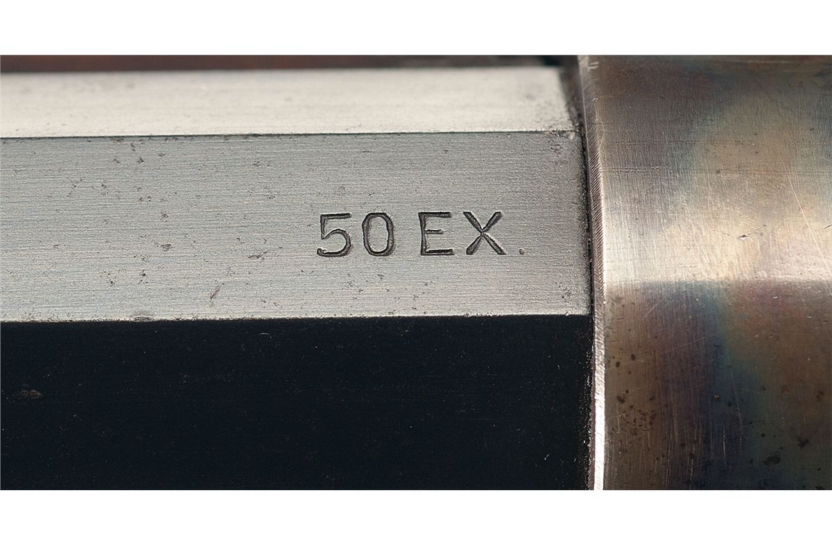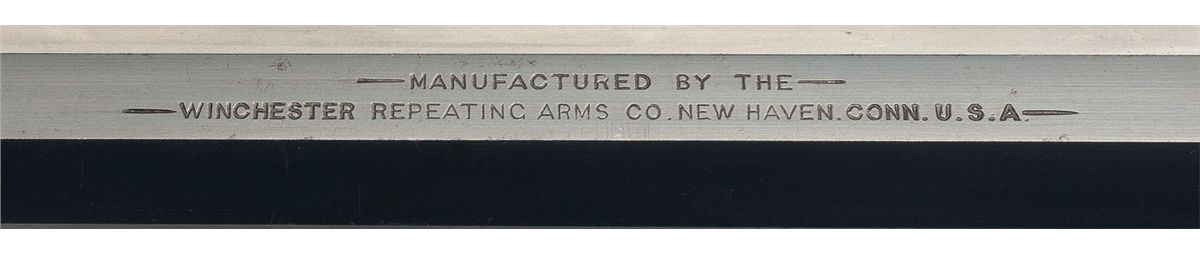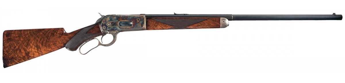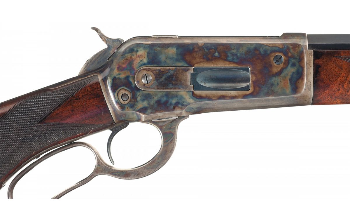Condition: Excellent. The rifle is exceptional and retains 97% of the original blue and 95% plus casehardened finish. The barrel, bolt and loading gate retain nearly all of the blue finish. The case colors on the forearm cap have silvered slightly. The top and sides of the receiver and upper tang have vivid case colors. The case colors on the underside of the receiver and lever show handling wear and have faded to a silver patina. The hammer and sides of the lever show strong case colors. The buttplate has a mottled brown finish with some pitting at the heel. The fancy grain stock and forearm are excellent; nearly all of the original high polish finish is intact and the checkered panels are sharp. The stock and forearm have only a few very minor storage and handling marks. The markings on the barrel and frame are sharp. This is an outstanding example of a scarce and very desirable Special Order Model 1886 Deluxe Express Sporting Rifle.