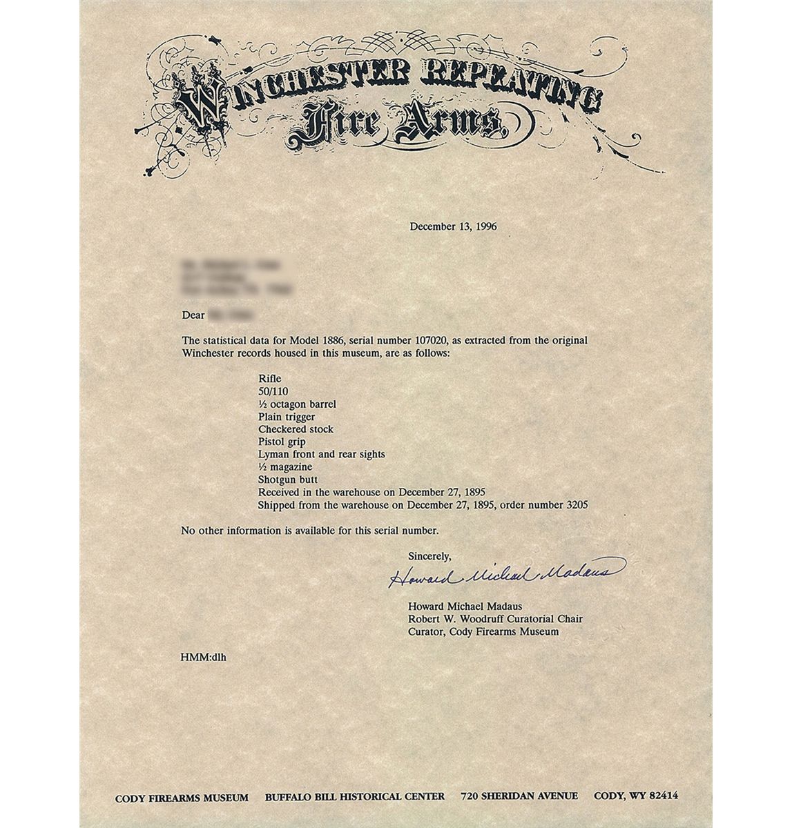 Model 1886 Deluxe Express Sporting Rifle with Cody Firearms Museum letter that states this rifle was shipped from the Winchester Warehouse on December 27, 1895. The letter describes the rifle features as caliber .50/110 with 1/2 octagon barrel, Plain trigger, Checkered stock, Pistol grip, Lyman front and rear sights, 1/2 magazine and shotgun butt. The rifle has a blue barrel, bolt and loading gate. The forearm cap, receiver, hammer, loading lever and steel shotgun buttplate have a color casehardened finish. The highly figured, fancy grain walnut stock and forearm have a highly polished finish. The forearm and pistol grip have the popular Winchester "Style H" checkering. The bottom of the pistol grip has a hard rubber cap embossed with "WINCHESTER REPEATING ARMS CO." The half-round barrel has a dovetail mounted Lyman "Winchester Express" front sight with ivory bead and a rare short range "Winchester Express" rear sight with platinum sighting line and three folding leaves graduated for 50, 100 and 200 yards. The top barrel flat is roll-stamped "-MANUFACTURED BY THE-/WINCHESTER REPEATING ARMS CO. NEW HAVEN CONN. U.S.A.-" in two lines ahead of the rear sight. The caliber "50 EX" is roll-stamped on the top barrel flat between the rear sight and the receiver. The upper receiver tang is roll-stamped "-MODEl 1886-". The lower tang is stamped with the "1884" and "1885" patent dates behind the trigger. The serial number "107020" is stamped in script numerals on the lower tang behind the rear tang screw.