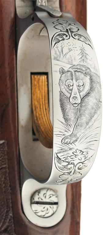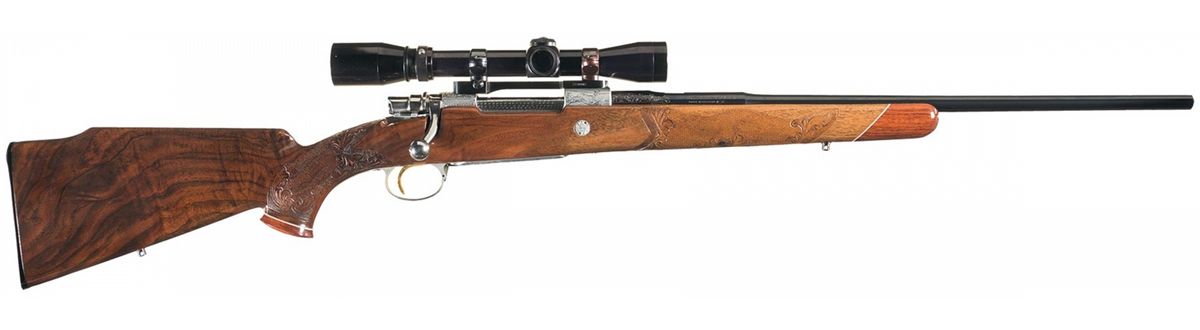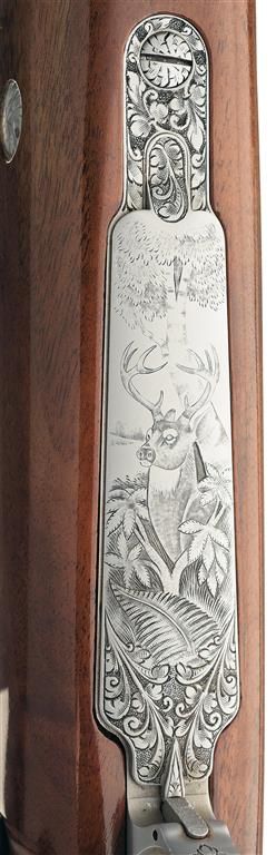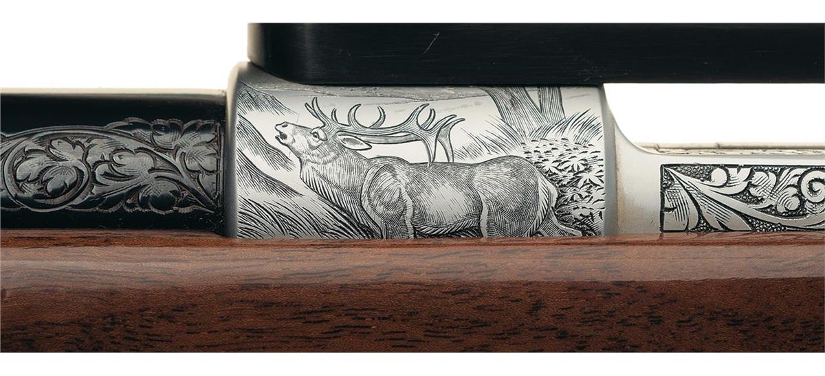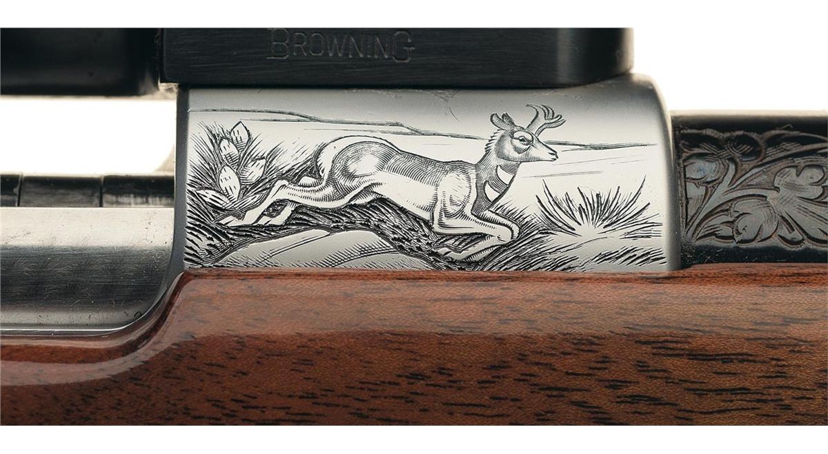 Manufactured in 1970 in Belgium, this rifle features a blue barrel manufactured without sights and French grey finish on the remaining parts. The follower and bolt assembly are polished, the extractor is jeweled and the trigger is gold washed. The front receiver ring is engraved with a bugling elk on the left side, a running prong horn antelope on the right side and the remainder of the action is relief floral vine leaf and punch dot engraved. The serial number is marked on the right side of the barrel and receiver. The hinged floor plate is engraved with a buck in a wooded scene with floral leaf engraving below and on the attaching metal and signed "L. LAMBERT". The trigger guard is engraved with a bear, with a floral leaf pattern above and below and signed "AP". There is a two inch wedge of floral leaf engraving on the breech end of the barrel sides. The screw heads and stock bolts are also engraved with a leaf design. Equipped with a Browning 2-7x scope on a one piece mount. The stock is extra fancy select walnut with a high gloss finish, fine line checkering and floral and punch dot hand carving on the forearm and grip area, contrasting forend and grip cap with a diamond shaped brass inset on the grip cap, raised comb, cheekpiece, plastic Browning buttplate and sling swivel studs.
