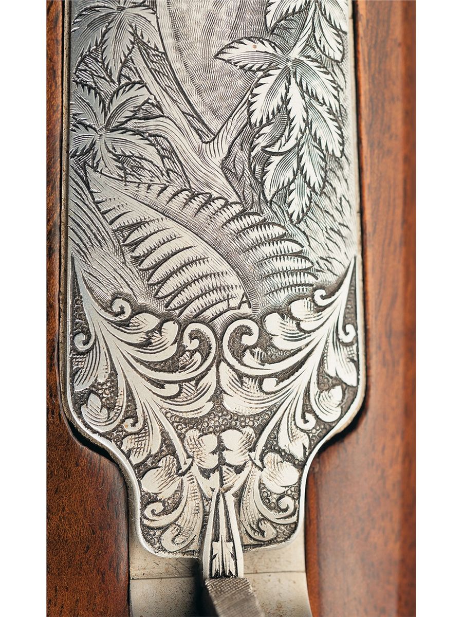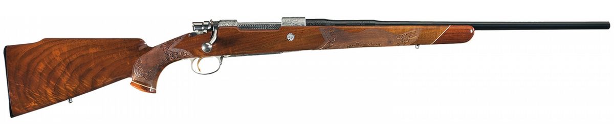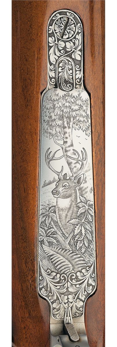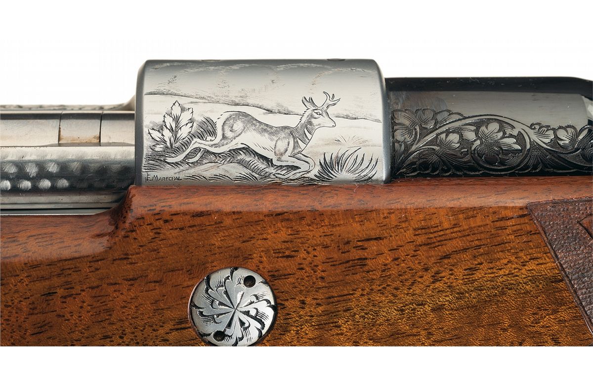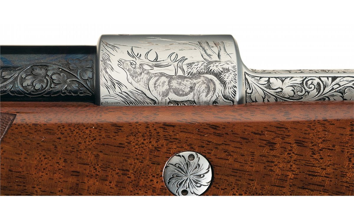 This extensive game scene engraved Belgian rifle features a blue barrel manufactured without provisions for sights and French gray finish on the remaining parts. The breech end of the barrel is decorated with a 2 inch wedge of floral scroll engraving on the sides. Polished bolt, jeweled extractor and gold washed serrated trigger. The front receiver ring is engraved with a bugling elk on the left side, a pronghorn on the right side and the remainder of the action is floral vine leaf and punch dot engraved. "F. MARECHAL" is signed by the pronghorn and elk. The hinged floor plate is engraved with a stag in a woodland scene and the trigger guard is engraved with a bear. The deer scene is signed "LA". The screw heads and stock bolts are also engraved with a leaf design. The stock is extra fancy select walnut with a high gloss finish, fine line checkering and floral and punch dot hand carving on the forearm and grip area, contrasting forend and grip cap with white spacer, diamond shaped brass insert on the grip cap, raised comb, cheekpiece, Browning plastic buttplate and sling swivel studs.
