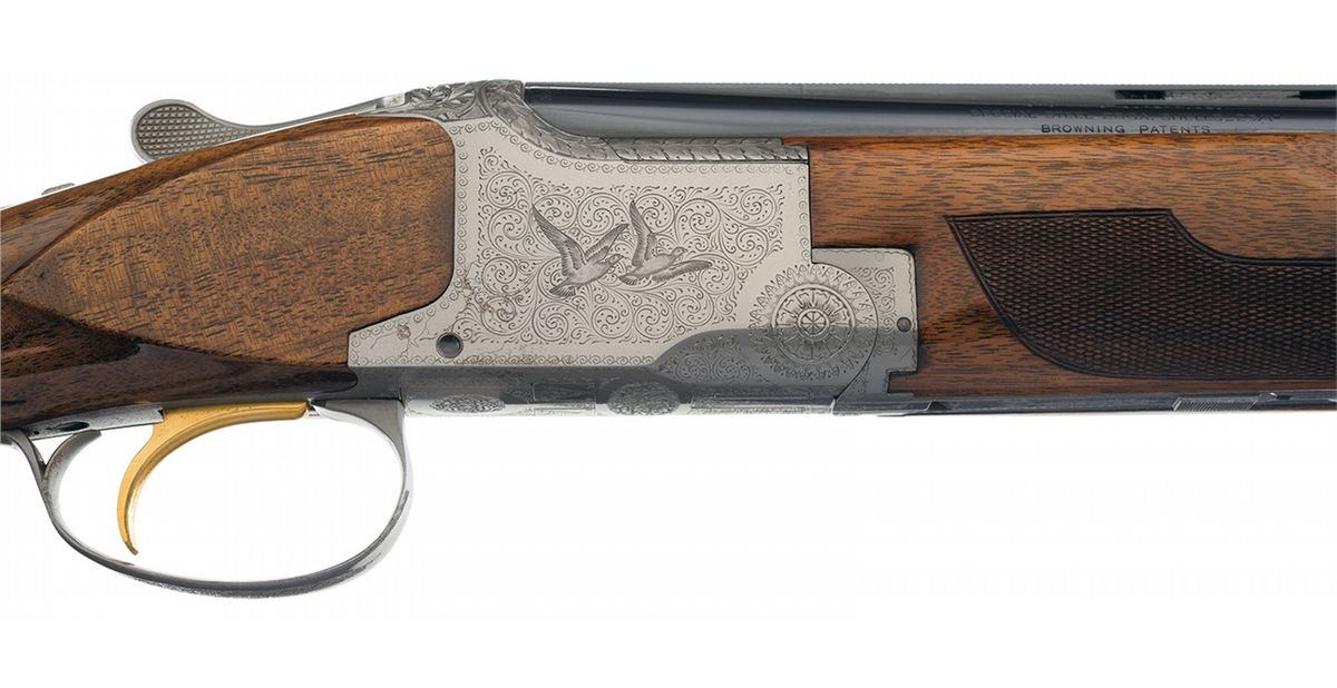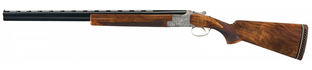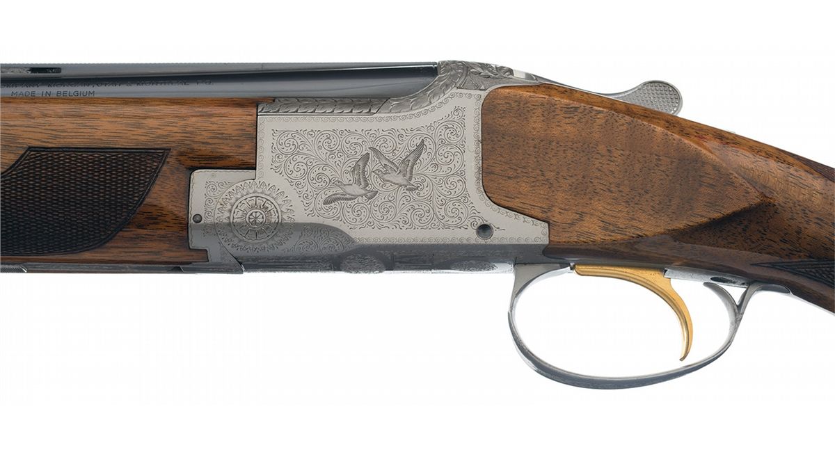 Manufactured in Belgium in 1970. This shotgun features double ivory bead sights on a matte vent rib, 2 3/4 inch chambers, choked skeet/skeet with ejectors. The barrels are blue and the remaining parts are satin gray. The receiver is engraved with fine scroll patterns with two pigeons in flight on each side and rose bouquets on the bottom. The top of the receiver is engraved with an oak leaf and acorn pattern, with a leaf design on the upper edge. Gold washed trigger, tang mounted safety/selector and mounted with a high gloss checkered, extra fancy walnut forearm and pistol grip stock with a Browning vented recoil pad. 2 3/4 inch chambers, bore diameter: O- .544 U- .542, bore constriction: O- .002 U- .001, length of pull: 14 5/16 inches, drop at comb: 1 3/8 inches, drop at heel: 2 inches, weight: 6lbs 14oz.