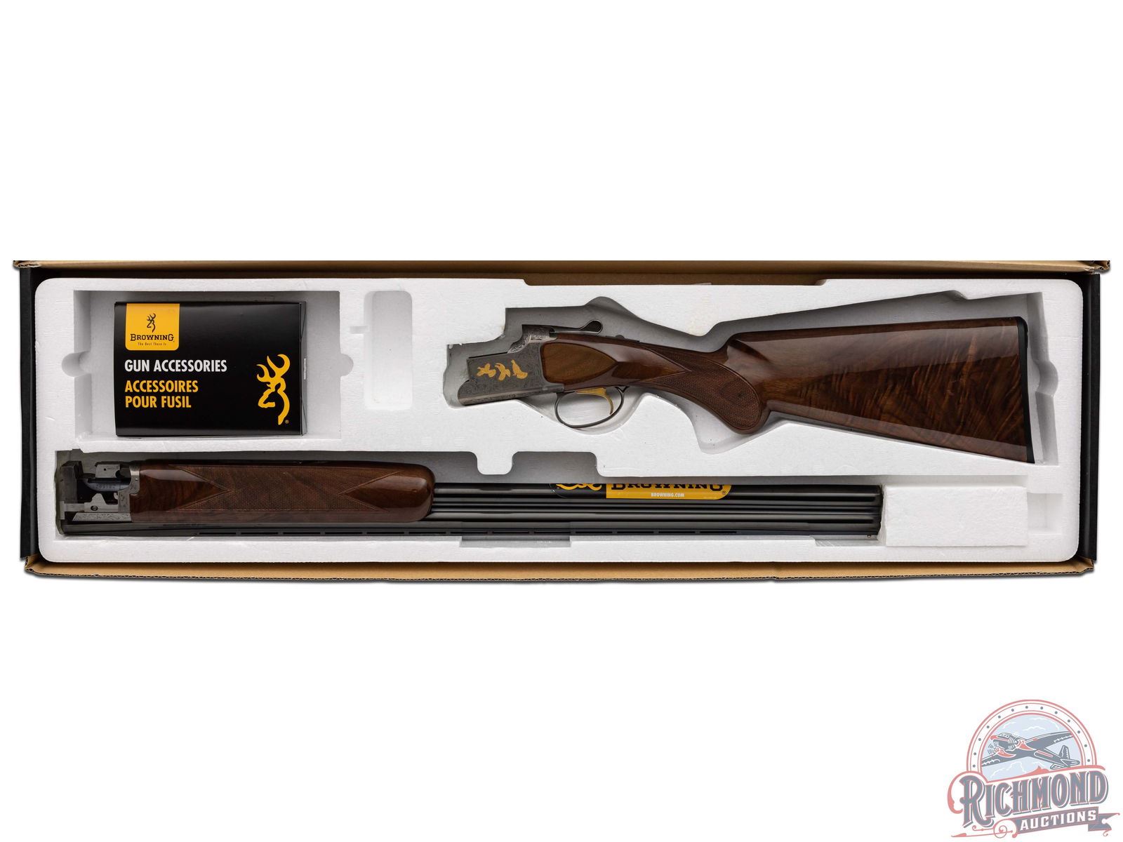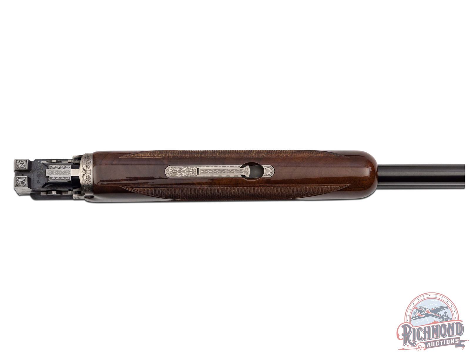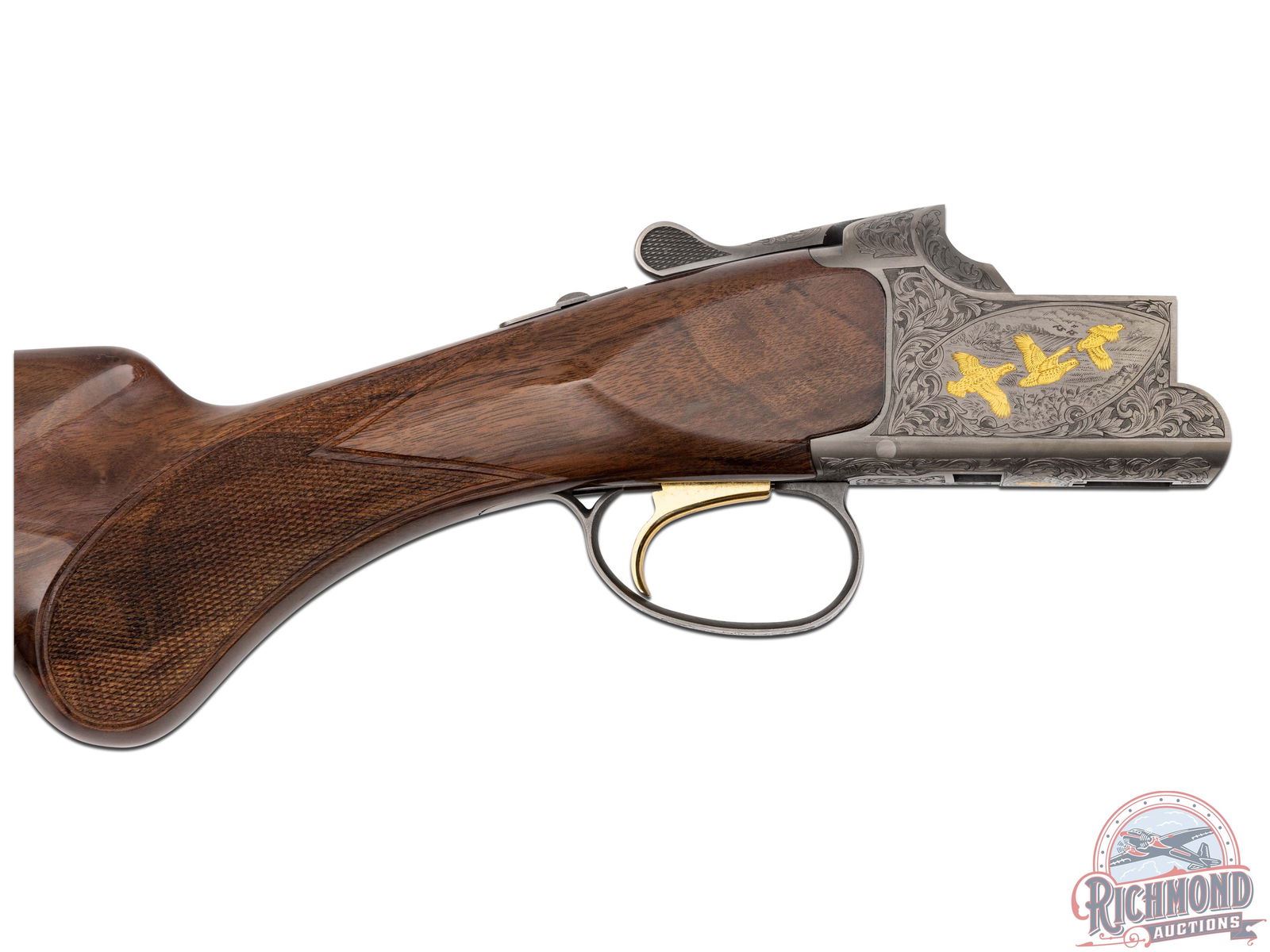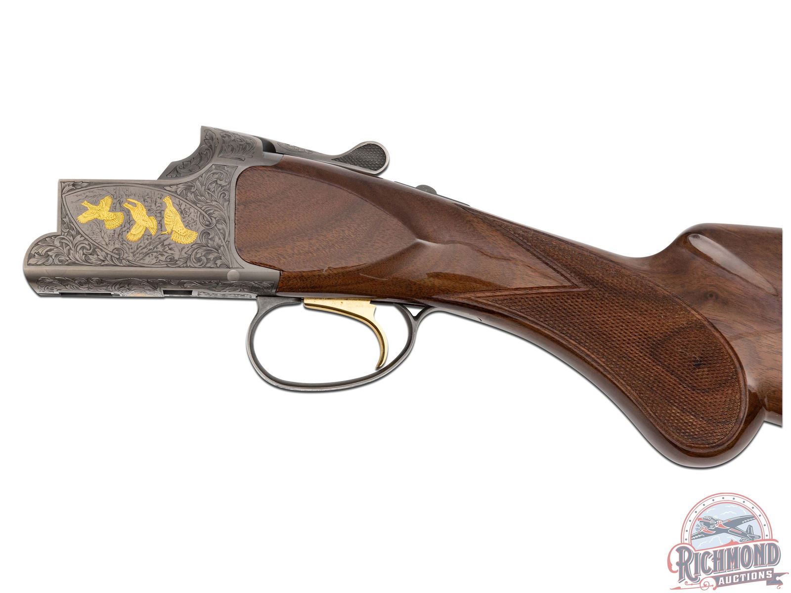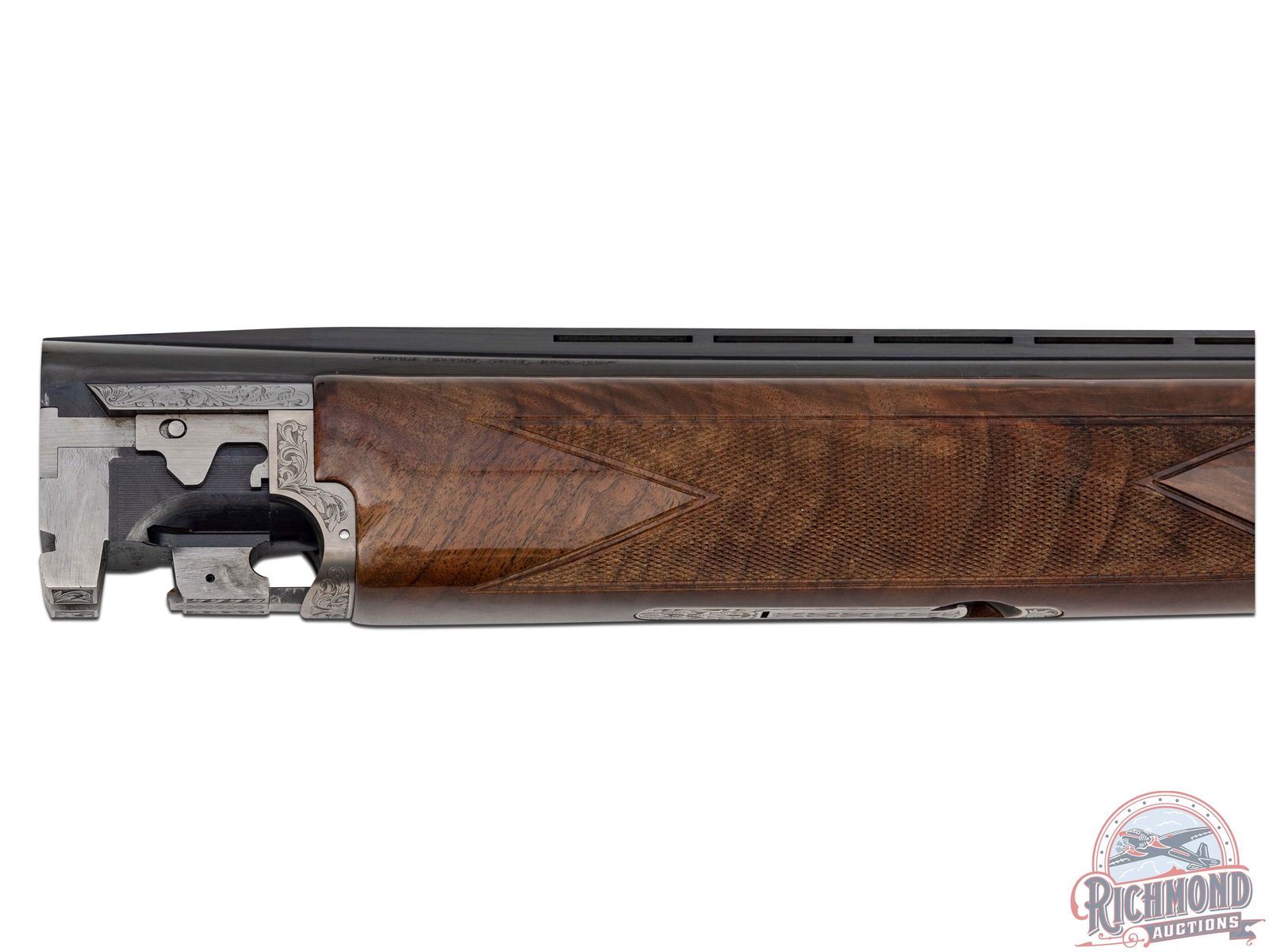 Manufactured in 2012. O/U with standard markings on the barrel. Matching serials on the frame, barrel and forearm. 28" barrels with full vent rib and steel bead front sight. Grade 7 engraved receiver with gold inlay grouse on either side. Pointer dog inlaid in gold on the underside. Factory gloss finished walnut stock and forearm. Fine checkered pistol grip wrist and forearm. Original black plastic butt plate. Single gold washed trigger with a tang safety/selector. 2-3/4" chamber. Invector choke tubes (full and modified tubes installed) with improved cylinder included (only chokes included). Weight: 7lbs. Wall thickness at 9 inches from breech .0505/.0505". Bore diameter is 9" from the breech. .659/.659". Includes lock, manual, choke tube wrench and serial matching box. LOP: 14-1/4". DAC: 1-1/4". DAH: 2-1/4". CALIBER: 16 GA. S/N: 23159ZY131. FFL STATUS: Modern.