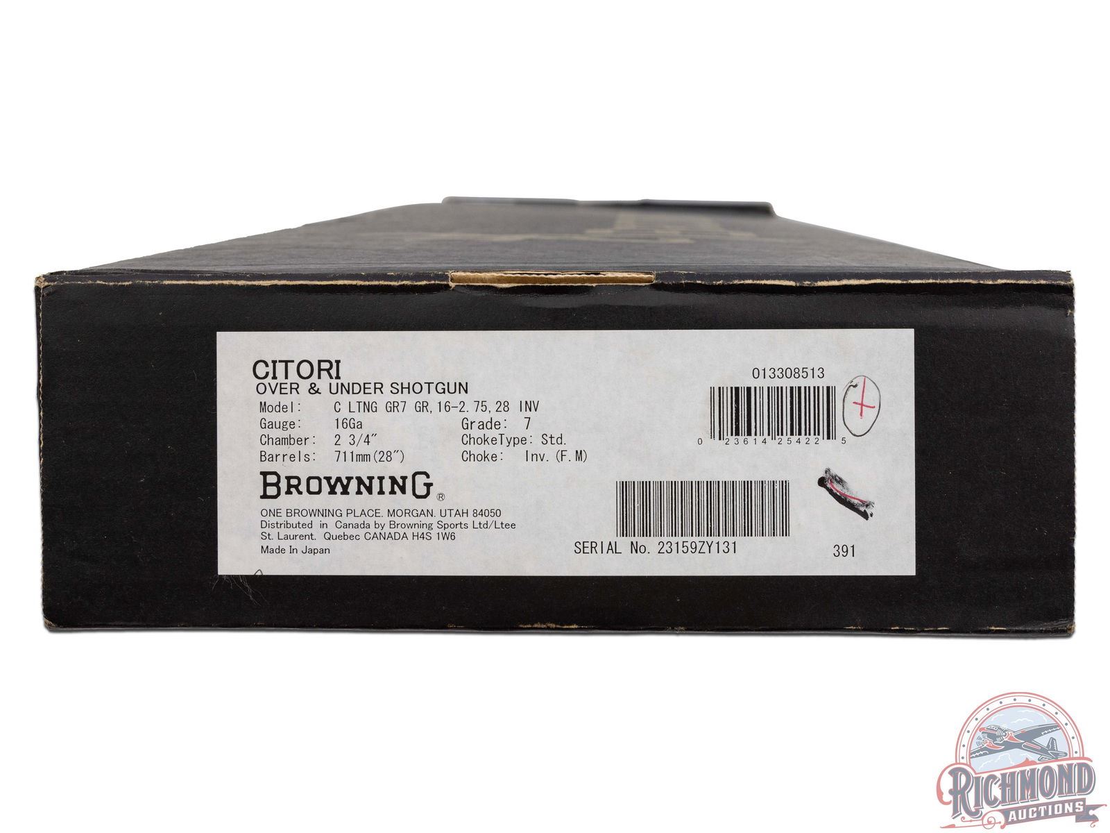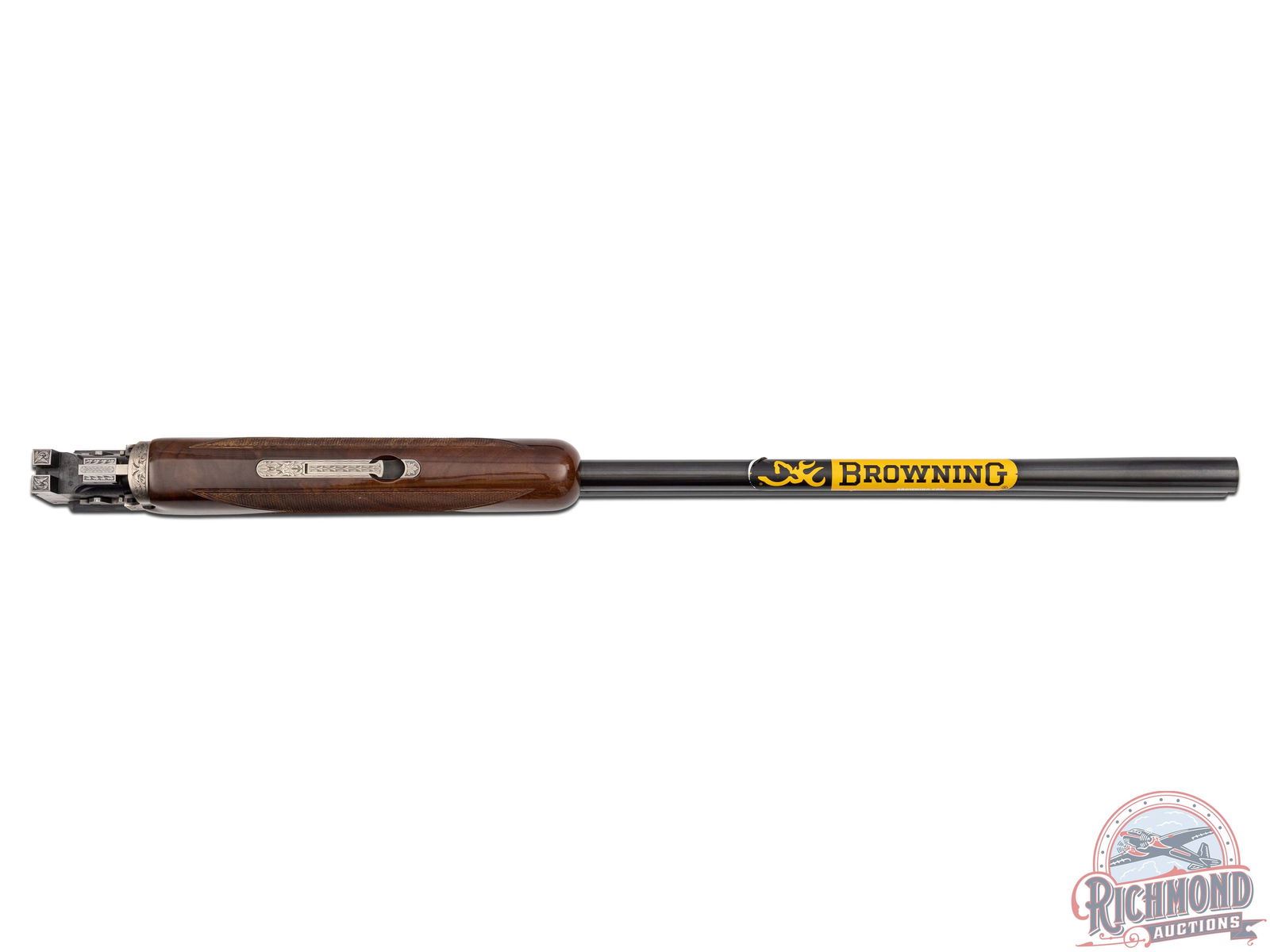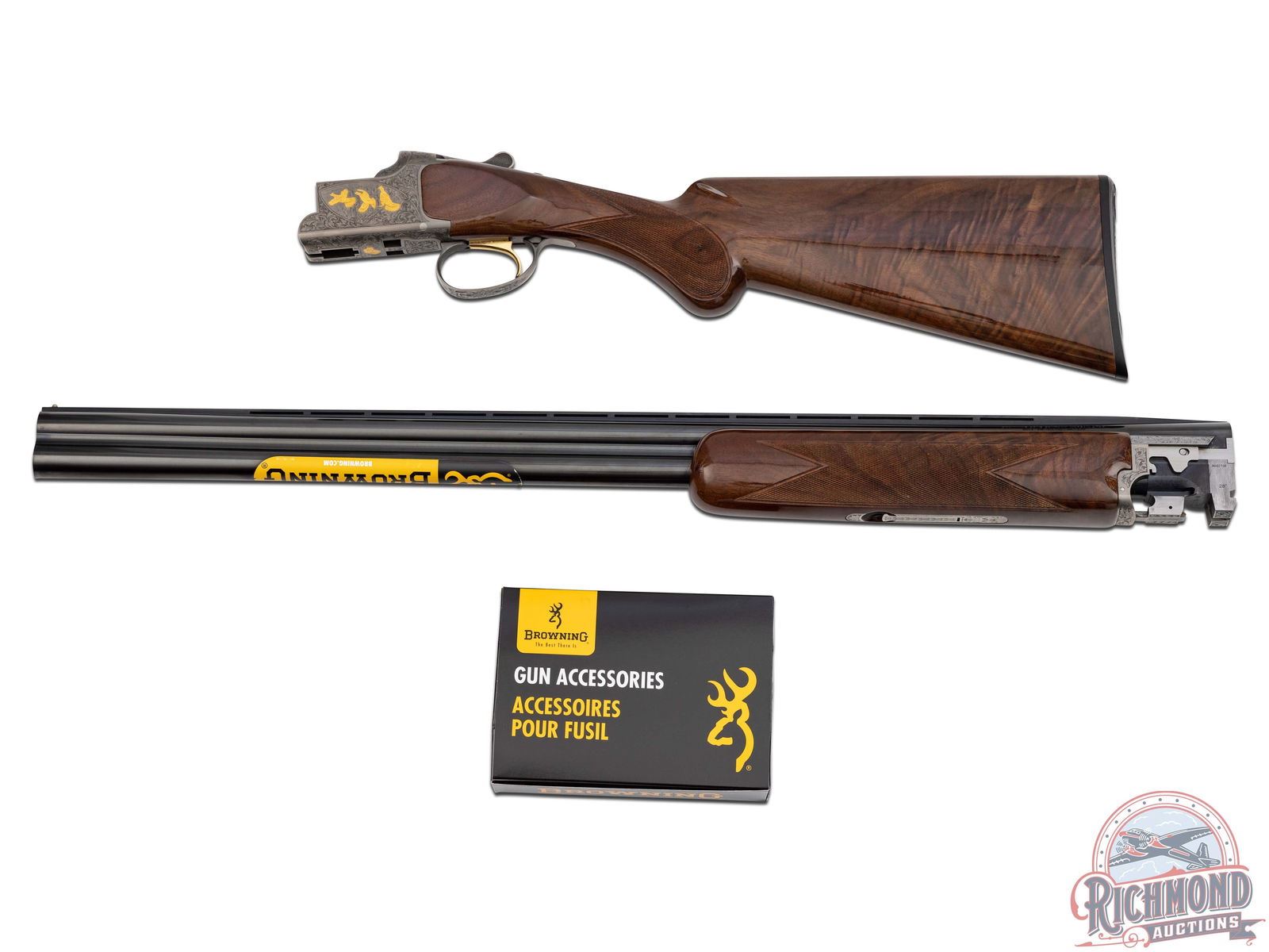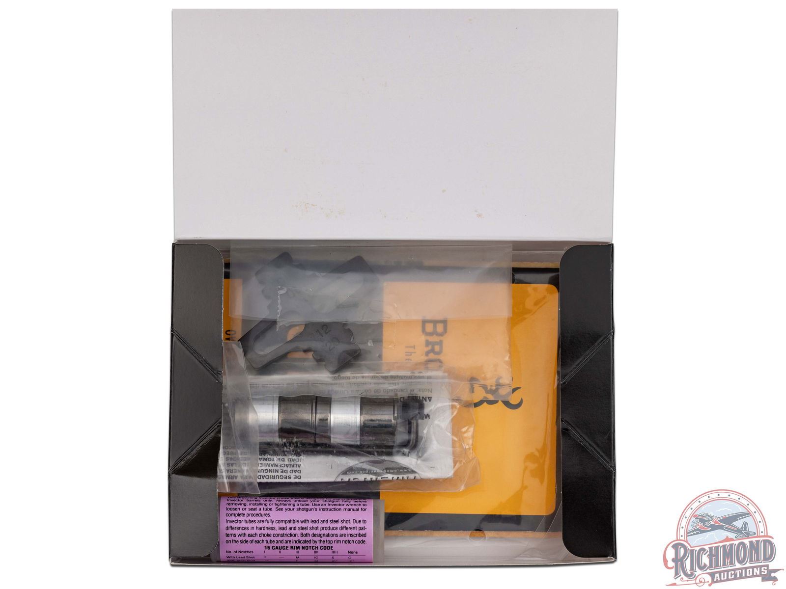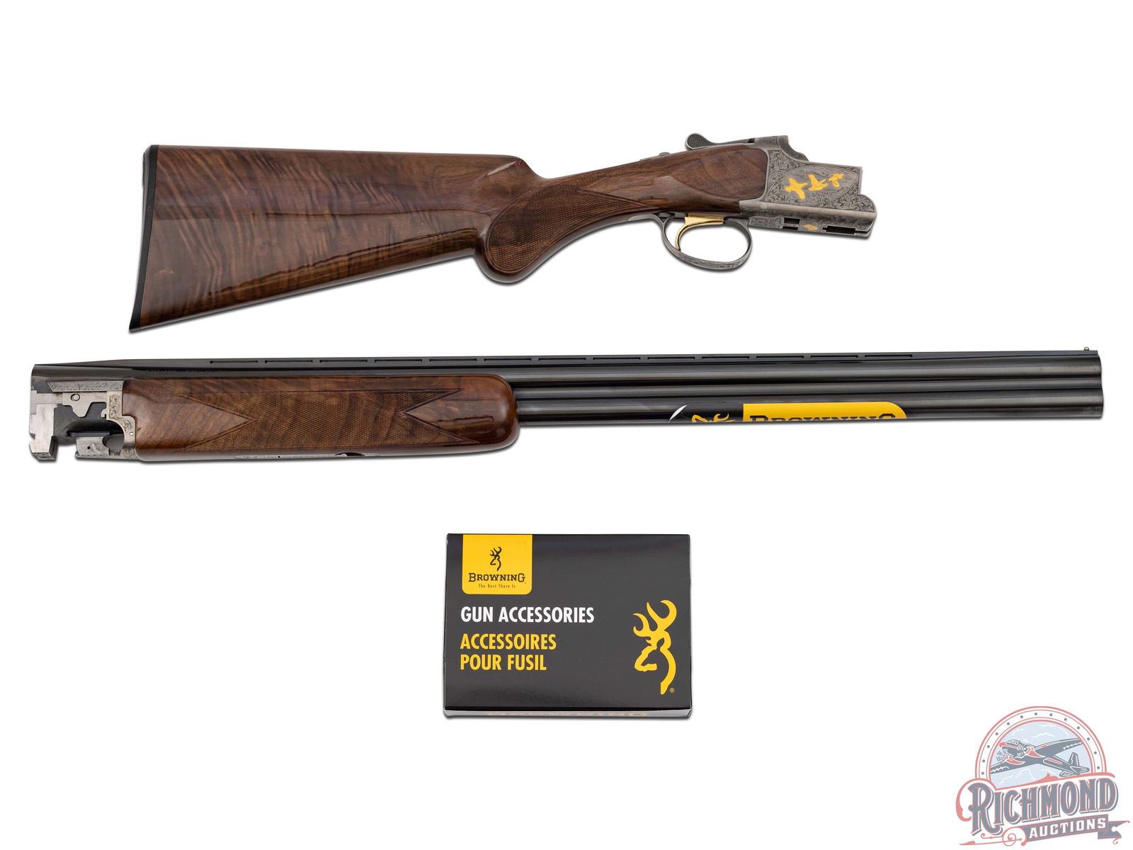 Manufactured in 2012. O/U with standard markings on the barrel. Matching serials on the frame, barrel and forearm. 28" barrels with full vent rib and steel bead front sight. Grade 7 engraved receiver with gold inlay grouse on either side. Pointer dog inlaid in gold on the underside. Factory gloss finished walnut stock and forearm. Fine checkered pistol grip wrist and forearm. Original black plastic butt plate. Single gold washed trigger with a tang safety/selector. 2-3/4" chamber. Invector choke tubes (full and modified tubes installed) with improved cylinder included (only chokes included). Weight: 7lbs. Wall thickness at 9 inches from breech .0505/.0505". Bore diameter is 9" from the breech. .659/.659". Includes lock, manual, choke tube wrench and serial matching box. LOP: 14-1/4". DAC: 1-1/4". DAH: 2-1/4". CALIBER: 16 GA. S/N: 23159ZY131. FFL STATUS: Modern.