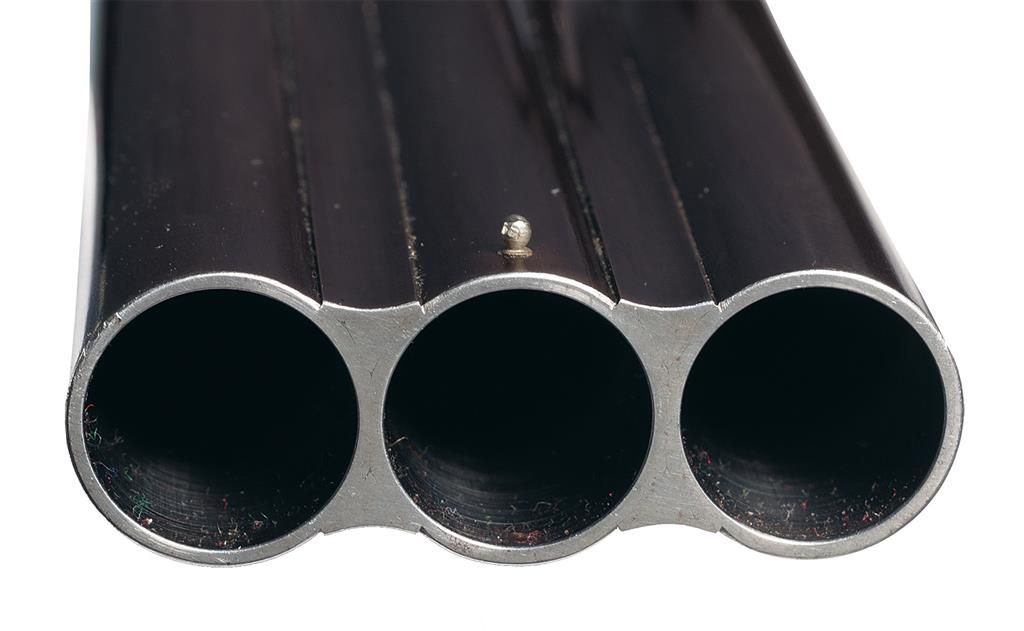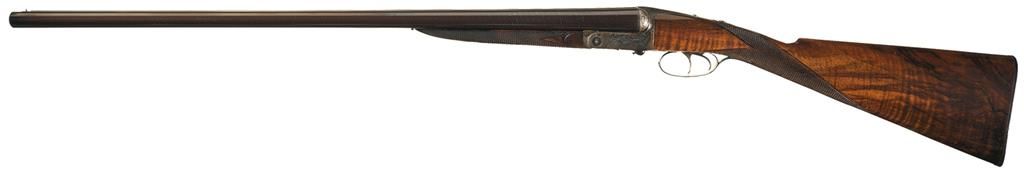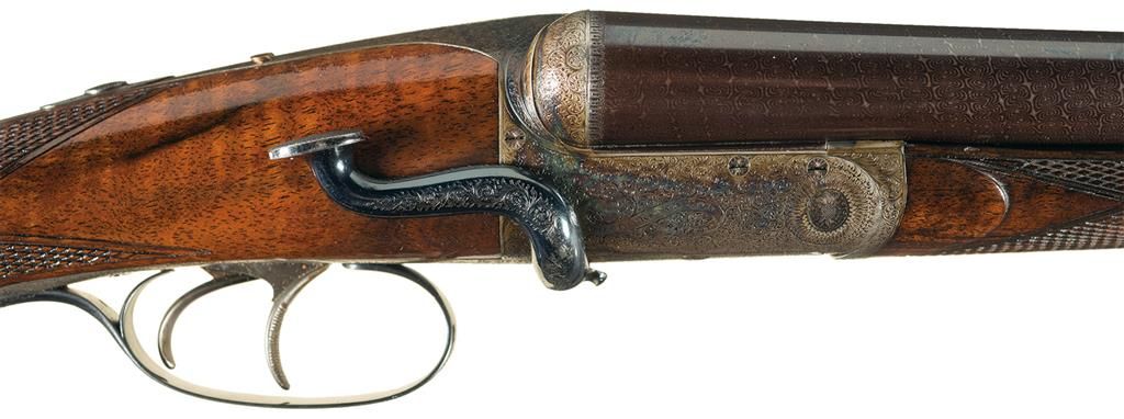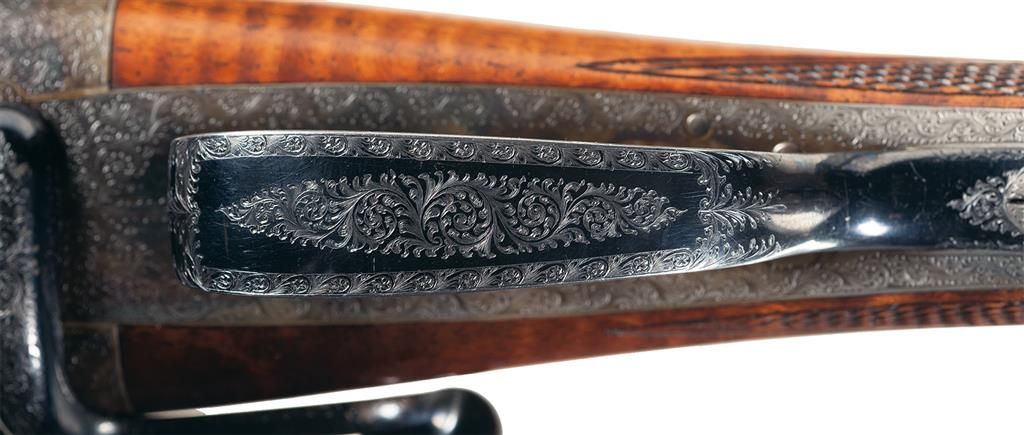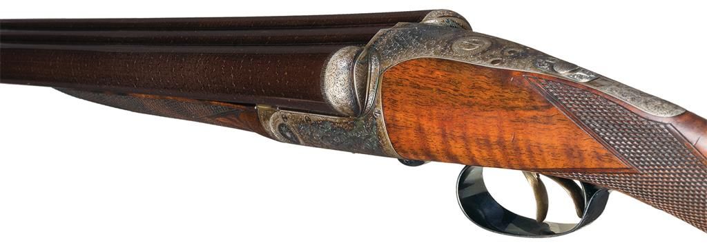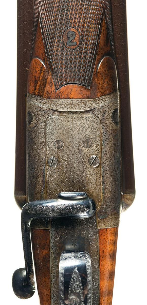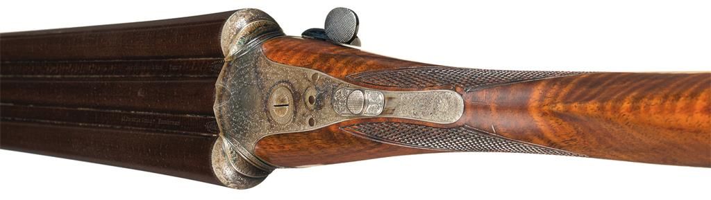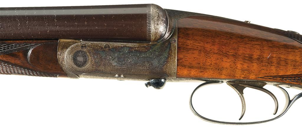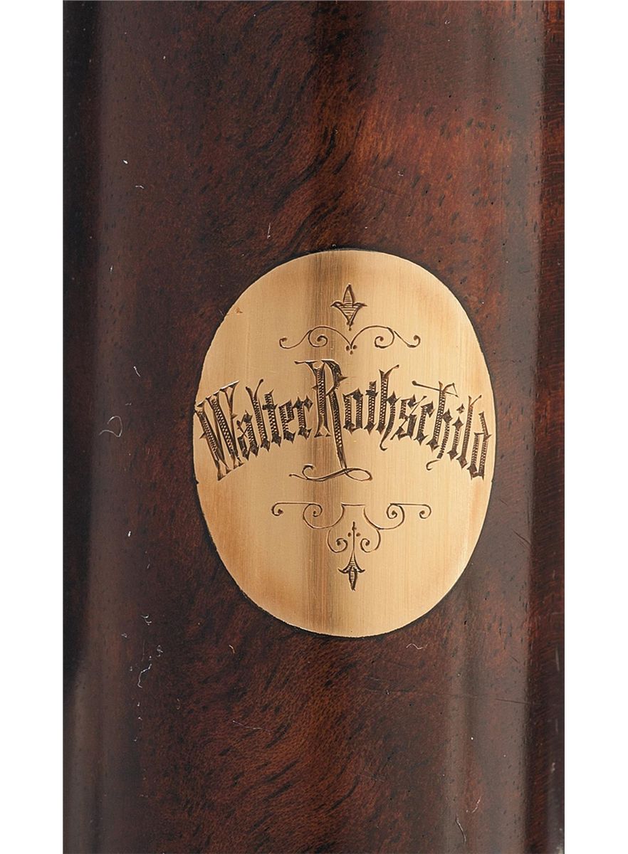 Manufactured circa 1886, this unique and rare John Dickson shotgun features three 16 gauge barrels, a side lever and a round action. The middle barrel has a bead front sight. The right rib is marked "JOHN DICKSON & SON" followed by "PATENT" and the left rib is marked "63 PRINCES STREET EDINBURGH". The breech end of each rib is engraved with a small wedge of fine scroll. The top of the middle barrel is marked with the number "2". The underside and the barrel flats are marked with the matching serial number and various proofmarks. The water table is also marked with the matching serial number and "PATENT/J.D & S". The initials "RLR" and a social security number have been scratched into the water table. The action, trigger guard, trigger guard plate, break lever and forearm hardware are engraved with fine English scroll designs. Each side of the action is marked "JOHN DICKSON & SON PATENT" in a banner. The serial number is engraved on the lower tang. The number "2" is also marked on the forearm and on the inside of the forearm hardware. Writer believes this shotgun may have been one of a two gun set at one time. The unique action has two triggers and three cocking indicators. The forward trigger fires the middle barrel, the rear trigger fires the right barrel and the forward barrel then fires the left barrel. Tang mounted automatic safety with gold "SAFE". Mounted with a nicely figured checkered walnut forearm with a horn forend insert and a straight grip stock and checkered horn buttplate with "Walther Rothschild" inscribed initial oval. 2 3/4 inch chambers, choked improved cylinder/full/full with ejectors. 14 3/4 inch length of pull. Walter Rothschild (1868-1937), 2nd Baron Rothschild was a scion of the Rothschild family. He was a British banker, a politician and a zoologist. At 21 he went to work in the family bank, N.M. Rothschild & Sons in London. He worked there from 1889 to 1908. He was a Conservative Member of Parliament for Aylesbury from 1899 until January 1910 when he retired from politics. He studied zoology at Magdalene College in Cambridge. He had an interest in bird and butterfly taxonomy. He opened a private museum in 1892 which housed one of the largest natural history collections in the world. At one point his collection included 300,000 bird skins, 200,000 bird eggs, 2,250,000 butterflies, 30,000 beetle and thousands of mammals, reptiles and fish. In 1932 he was forced to sell the vast majority of his bird collection to the American Museum of Natural History after being blackmailed by a woman. Rothschild died in 1937. The shotgun comes with a later production contemporary replacement hard leather case with brass corner protectors and leather straps and handle. The interior is lined with red felt with a John Dickson & Son label affixed to the inside of the lid. In the case are a two-piece nicely figured wooden cleaning rod with screw on ivory handle, three ivory handled screwdrivers, a nickel plated oiler, two wooden containers with screw on lids, three nickel 16 gauge snap caps, a nickel plated container with screw on lid, cleaning rod attachments, game bird counter and a nickel 10 gauge snap cap.