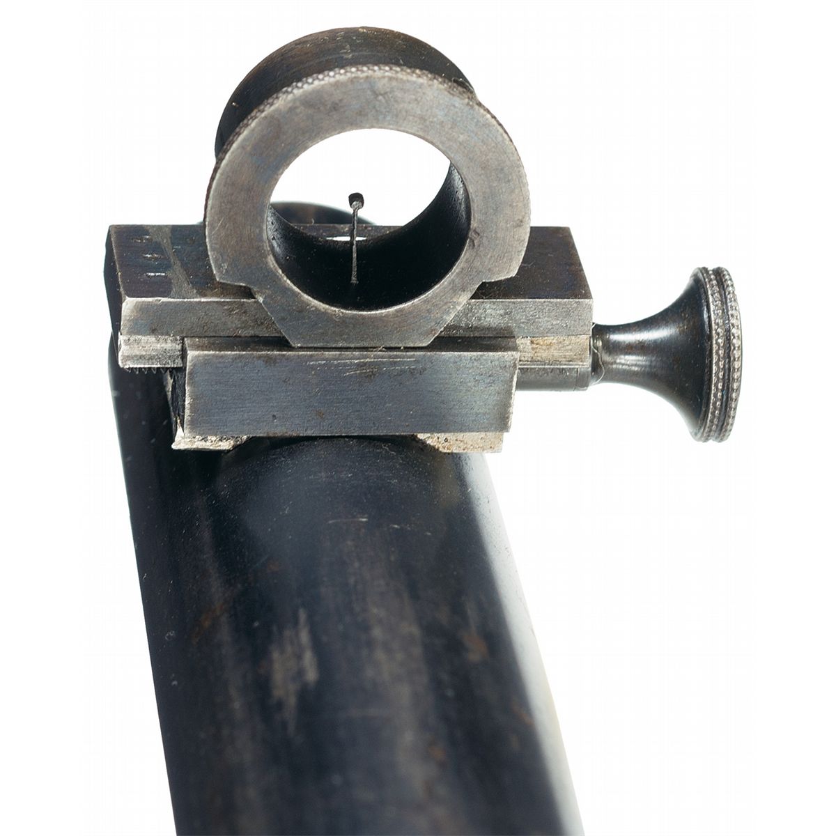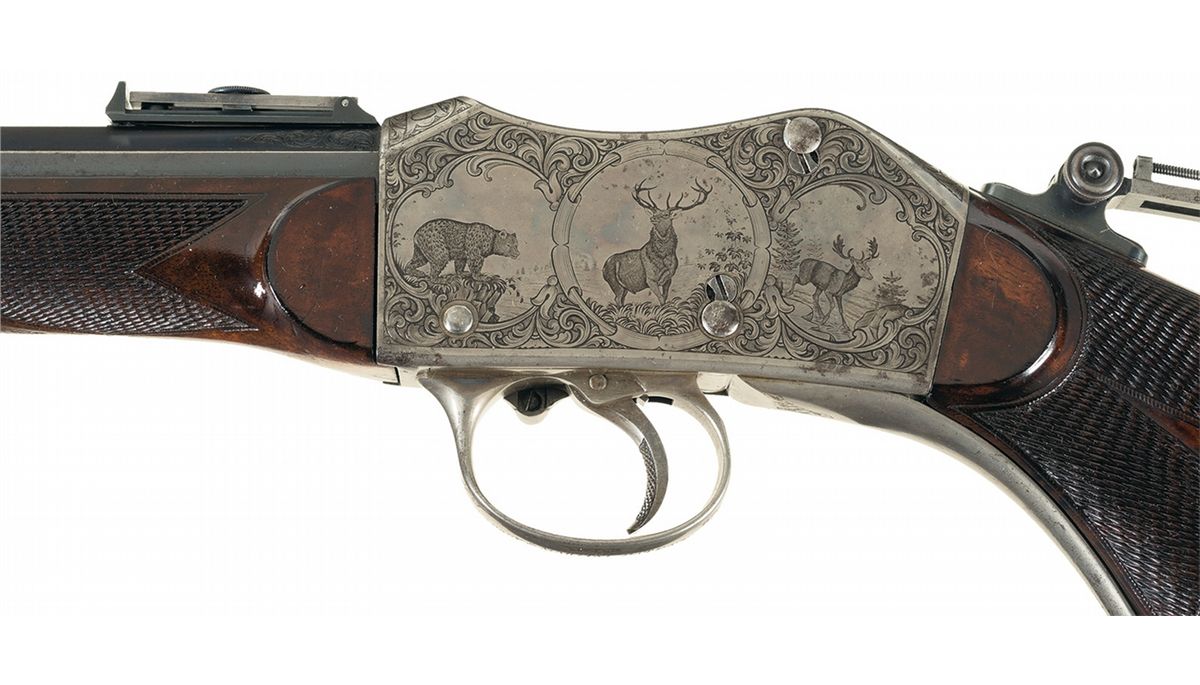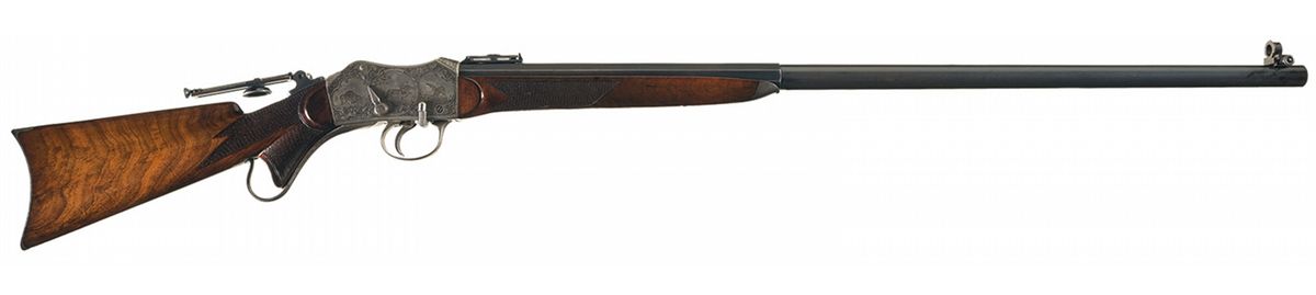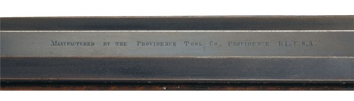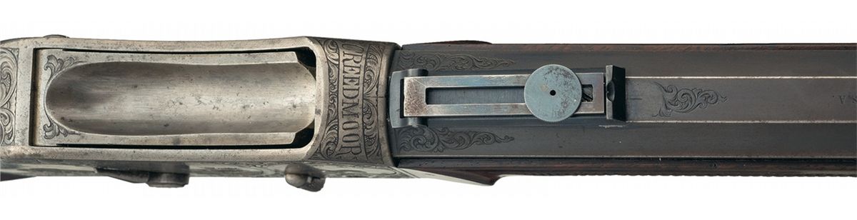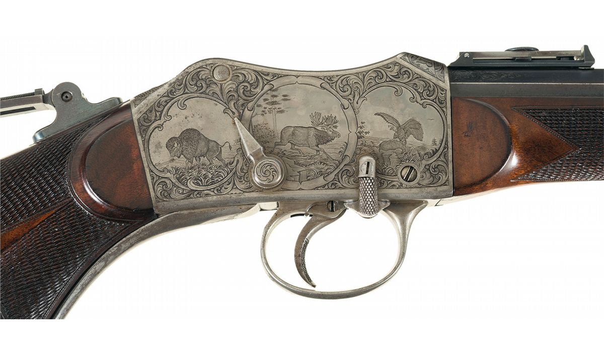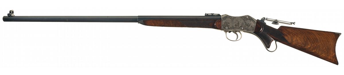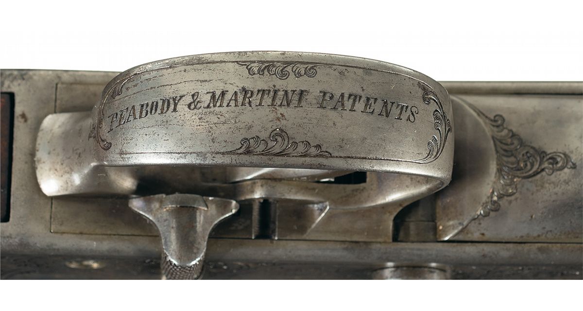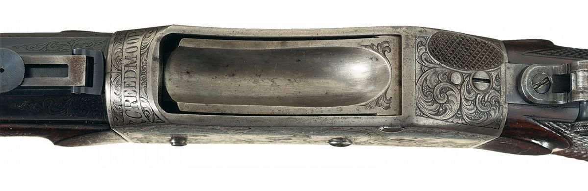 This is an outstanding all original and seldom seen, extremely early (serial number 93) factory engraved, special order, exhibition grade, Peabody-Martini single shot Creedmoor Target Rifle. This beautiful rifle was manufactured by the Providence Tool Company of Providence, Rhode Island, circa 1875 to 1880s, for use in the "long-range" Creedmoor style target rifle matches. Several variations of Peabody-Martini style rifle were actually made by this company however it is estimated that no more than a handful of this super high end, deluxe factory engraved "Creedmoor" style rifle were ever manufactured. The original Creedmoor matches were established by a group of early NRA members trying to generate interest in long-range rifle marksmanship. The original 1000 yard rifle matches were first held in Creedmoor Farms in New York, circa 1876/77. This beautiful Creedmoor rifle was factory engraved on over 85% of the receiver with both side of the action being engraved in "three different" panel scenes that depict different game animals, surrounded by a very nicely engraved scroll pattern. The left side of the action shows a large bull elk in the center flanked by a grizzly bear on a cliff, with a large buck deer on the right side. All three as noted are framed in a circular picture/panel scene with all of them having a woodland scene. The right side shows a large bull moose in the center scene with a large American buffalo on the left and a large American eagle on the right side. As previously stated, all three of these animal scenes are set in a beautiful woodland/prairie scene. The receiver ring is also engraved with: "CREEDMOOR" in a Roman lettering with serifs. The trigger guard is also engraved with "PEABODY & MARTINI PATENTS". This rare rifle is fitted with its original 32 inch long, half-round, half-octagon barrel chambered in 45 caliber. The barrel is fitted with a very rare early, windage adjustable and very heavy duty, globe front sight with the pin-head front sight post, and a barrel mounted, short staff, factory folding target rear sight. Additionally this rare rifle is also fitted with the ubiquitous, tang mounted, mid-range target peep sight with a hadley eye-cup. The rear sight is graduated on the side of the staff from 1-6 (100-600) yards The top of the barrel is marked in one line "MANUFACTURED BY THE PROVIDENCE TOOL Co. PROVIDENCE RI U.S.A." with no visible caliber markings, however we assume it is 45 caliber. The receiver has a checkered thumb panel on the upper right side and an engraved loaded indicator and sliding safety lever. The exceptionally rare rifle is stocked in beautiful English walnut with a checkered pistol grip and wrist area and it fitted with a crescent style steel buttplate. It is if fitted with a standard forearm with a steel, Schnabel forearm tip with a short checkered panel on each side. This rifle has a blued finish with a color case hardened action, trigger guard and loading lever.
