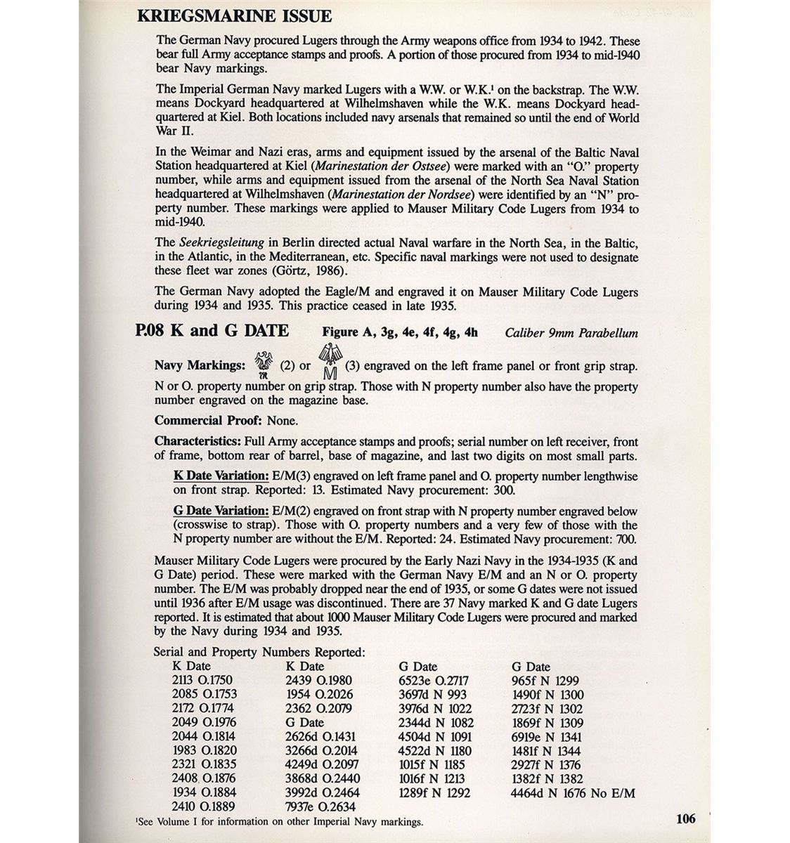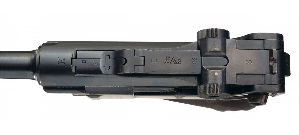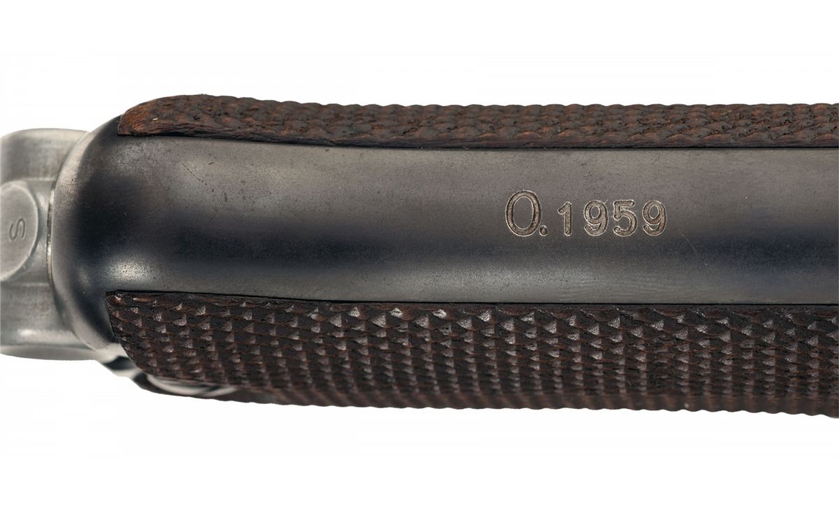 This is truly a rare example of an excellent, original 1934 Mauser production, "K" date "S/42" code military Luger pistol with very rare "Kriegsmarine" Navy proofs marks. The "K Date" P.08 Lugers were manufactured in 1934 and represent the very first true German Army Luger contract pistol. This specific example is even rarer in that it has the very desirable engraved "Eagle/M" Navy proof on the left side of the frame with the Naval property markings (O.1959) on the front grip strap. The "K" was the secret wartime code by the Mauser factory to conceal Germany's rearmament in violation of the Treaty of Versailles. These early Wehrmacht P.08 pistols have an extremely low survival rate as almost all saw extensive service use, an example in original condition are among the most desirable Nazi Luger pistols. This example is classified as a Sub-variation 2 that has the mixed script and gothic markings. There were only 3,550 total of this variation produced out of the estimated 10,930 K-Date luger pistols. This example has the standard Script "K" date mark on top of the chamber area with the mixed Script/Gothic "S/42" on top of the front toggle with the Gothic "S" marked toggle. It has standard military marked serial number on the major parts with the mixed Script/Gothic proof marks. These pistols are found in the 1,700-5,250 serial number range, putting this example about in the middle of the production. There were only about 300 Navy Lugers procured from this variation and they are found in the "1,983-2,400" number range, putting this at the end of the Navy serial number range. The front grip strap is also marked with "O.1959" property markings indicating it was issued out of the Baltic Naval station headquartered at Kiel (Marinestation der Ostsee). This serial number and production data is also listed on page 15 and 106 of Jan Stills book on "Third Reich Lugers". The left side of the barrel has the early boxed "O/37" acceptance stamps as used by the Navy along with an early Mauser Eagle firing proof, located on the right side of the barrel extension. The pistol has a "Type 1 Army" magazine with a nickel-plated magazine body with an aluminum base stamped with a Gothic "S/2182/+/O/37" acceptance proof.