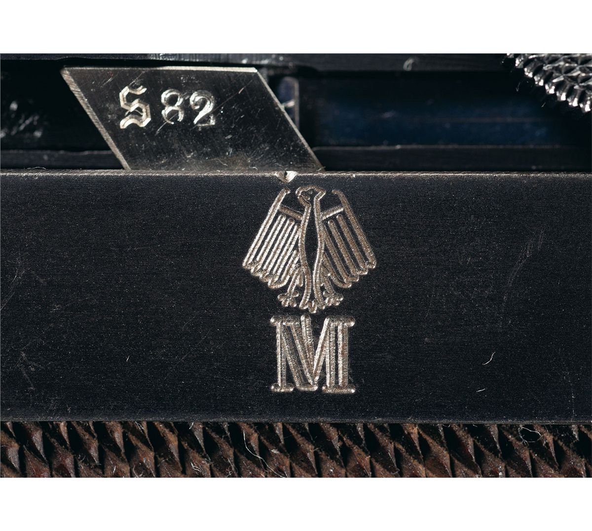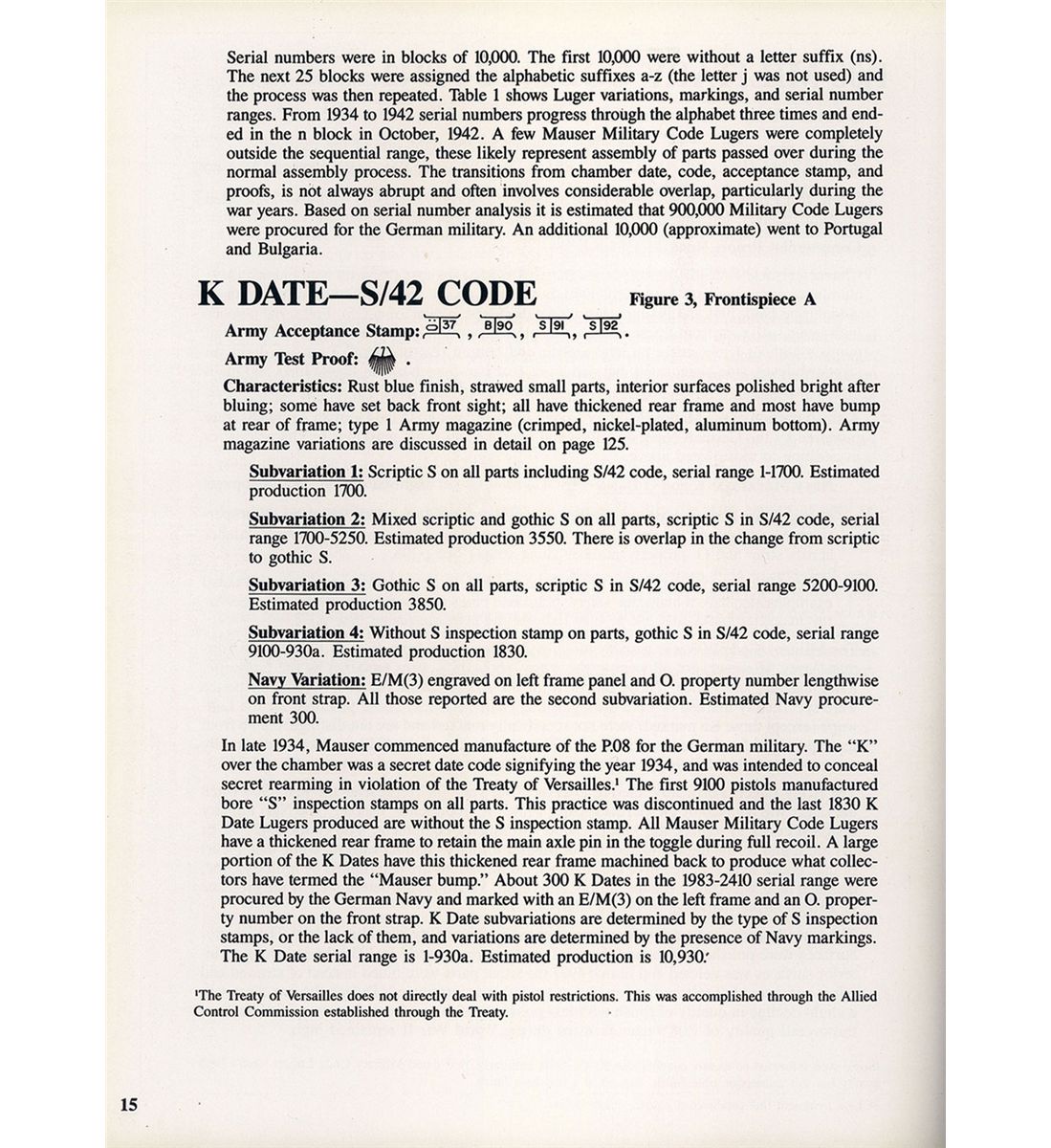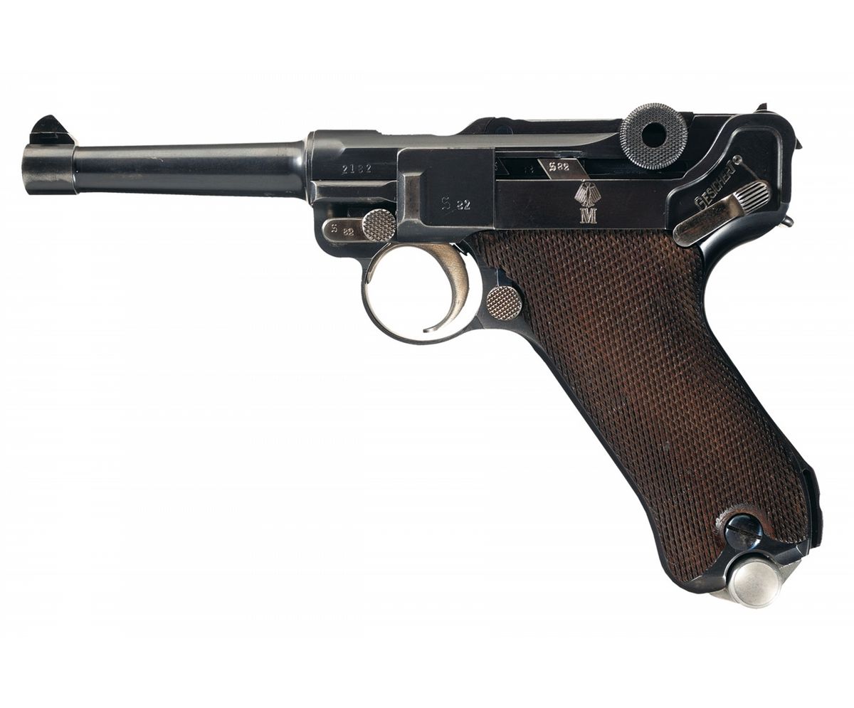 This is truly a rare example of an excellent, original 1934 Mauser production, "K" date "S/42" code military Luger pistol with very rare "Kriegsmarine" Navy proofs marks. The "K Date" P.08 Lugers were manufactured in 1934 and represent the very first true German Army Luger contract pistol. This specific example is even rarer in that it has the very desirable engraved "Eagle/M" Navy proof on the left side of the frame with the Naval property markings (O.1959) on the front grip strap. The "K" was the secret wartime code by the Mauser factory to conceal Germany's rearmament in violation of the Treaty of Versailles. These early Wehrmacht P.08 pistols have an extremely low survival rate as almost all saw extensive service use, an example in original condition are among the most desirable Nazi Luger pistols. This example is classified as a Sub-variation 2 that has the mixed script and gothic markings. There were only 3,550 total of this variation produced out of the estimated 10,930 K-Date luger pistols. This example has the standard Script "K" date mark on top of the chamber area with the mixed Script/Gothic "S/42" on top of the front toggle with the Gothic "S" marked toggle. It has standard military marked serial number on the major parts with the mixed Script/Gothic proof marks. These pistols are found in the 1,700-5,250 serial number range, putting this example about in the middle of the production. There were only about 300 Navy Lugers procured from this variation and they are found in the "1,983-2,400" number range, putting this at the end of the Navy serial number range. The front grip strap is also marked with "O.1959" property markings indicating it was issued out of the Baltic Naval station headquartered at Kiel (Marinestation der Ostsee). This serial number and production data is also listed on page 15 and 106 of Jan Stills book on "Third Reich Lugers". The left side of the barrel has the early boxed "O/37" acceptance stamps as used by the Navy along with an early Mauser Eagle firing proof, located on the right side of the barrel extension. The pistol has a "Type 1 Army" magazine with a nickel-plated magazine body with an aluminum base stamped with a Gothic "S/2182/+/O/37" acceptance proof.