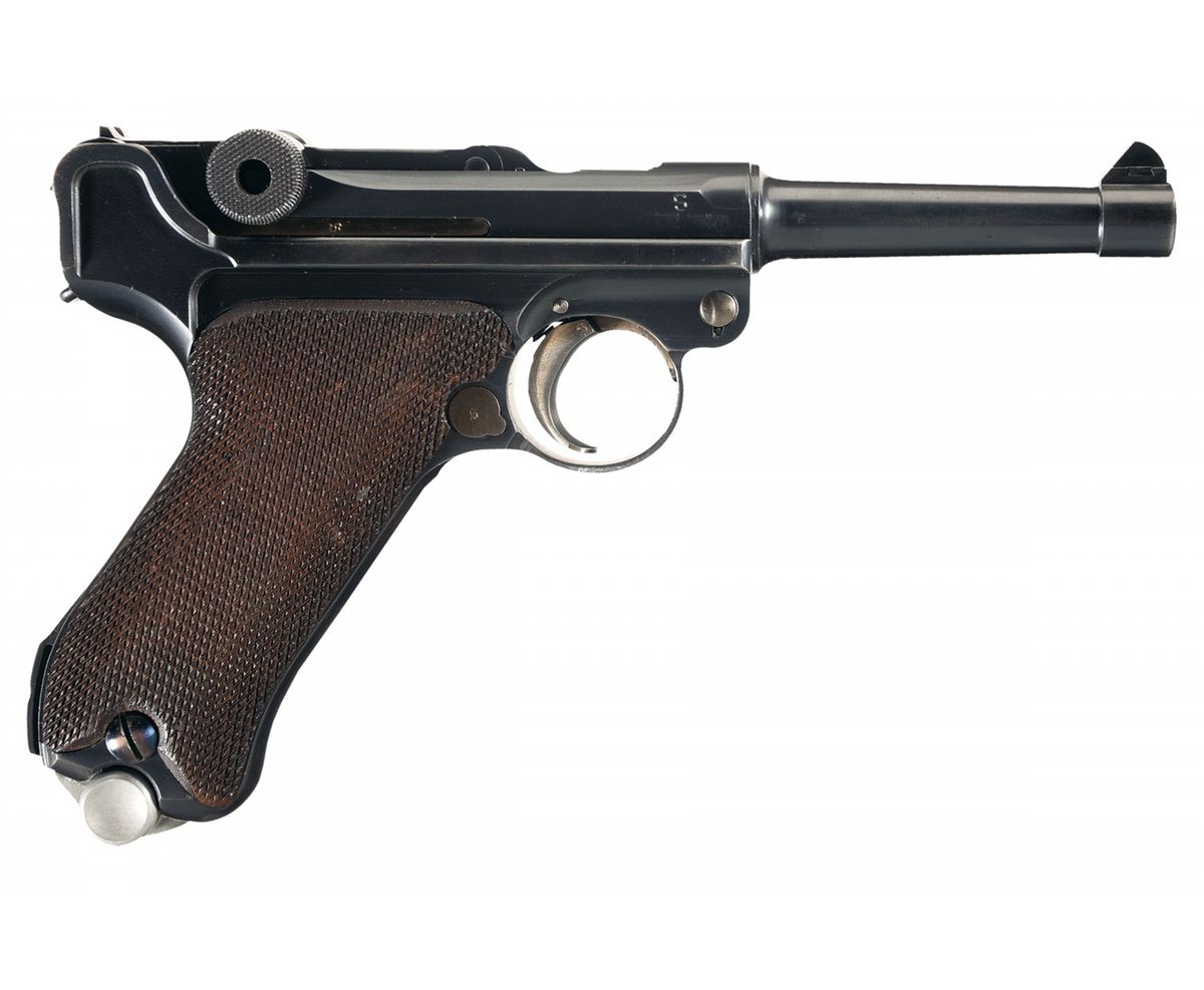 Condition: Excellent with 95% of the original blued finish overall, with wear on the edges and high spots, the sideplate hump and muzzle. The various smaller parts retain 85% of their original straw colors overall. The grips are in excellent condition with nice checkering on both side with the checkering having been carefully refreshened. An excellent early example of a 1934 date Navy "K" date Luger pistol.