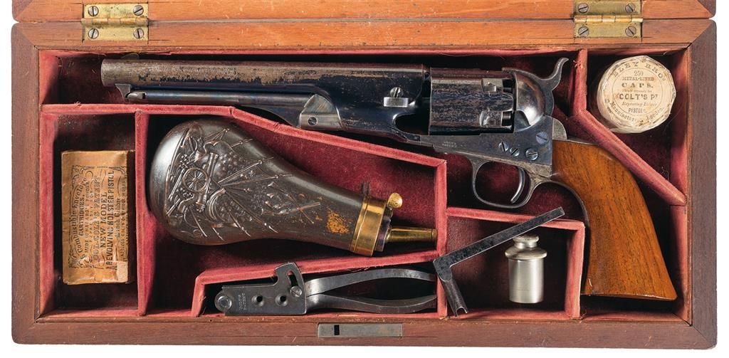First year production Colt Model 1860 Army revolver with fluted cylinder, 7 1/2-inch barrel and four-screw frame cut for a attachable shoulder stock. These features are typically found only on early production Model 1860 Army revolvers with serial numbers below 8000. The revolver is complete with a mahogany, Hartford case with six compartments lined with red felt. The case contains: (1) sealed tin of 250 Ely percussion caps, (2) packet of six Hazard's "Combustible Envelope Cartridges", (3) "COLTS/PATENT" 'Stand of Flags' powder flask with dark brown lacquer body, gold-plated top, slanted, fixed, charger and fire blue spring (Rapley #F16), (4) blued steel, bow-leg, .44 caliber double cavity bullet mold marked "COLT'S/PATENT" on the sprue cutter and "44H" on the right block, (5) Dixon marked pewter oil bottle, (6) L-shaped screw-driver and nipple wrench. The revolver has the Colt high polish commercial blue finish on the barrel and cylinder. The loading lever, frame and hammer are color casehardened and the brass trigger guard and back strap are silver-plated. The one-piece walnut grip has a high polish 'piano' finish. The top of the barrel is roll-stamped: "-ADDRESS COL. SAML COLT HARTFORD CT.-" in one line. "COLTS/PATENT" is stamped in two lines on the left side of the frame. "PATENTED SEPT. 10th 1860" is stamped in one cylinder flute. The full serial number, "1732" is stamped on the bottom of the barrel lug, frame, trigger guard and back strap. All of the visible serial numbers match. Colt manufactured an estimated total of 4000 Model 1860 Army revolvers with fluted cylinders in the serial number 3-8000 range. Factory cased fluted cylinder model 1860 Army revolvers are scarce.