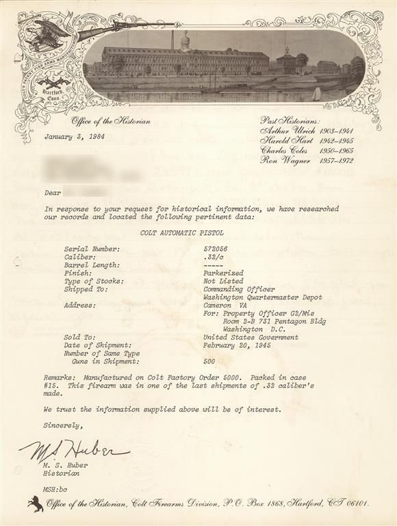 Colt .32 ACP Automatic Pistol with factory letter that indicates it was one of 500 pistols shipped to the Commanding Officer, Washington Quartermaster Depot in Cameron, Virginia on February 20, 1945. "U.S. HANDGUNS OF WWII" states that the 504 .32 ACP Pistols in the February 20, 1945 order were intended for issue to Army Military Intelligence (page 197). This late production pistol has a Colt "Parco-Lubrite" finish on the slide and frame, blue barrel with polished chamber and checkered walnut grips inlaid with nickel-silver Colt medallions. The pistol has a full blue magazine. The pistol has the late production, square-top, rear sight and ramp front sight with serrated face. The right side of the frame is roll stamped "U.S. PROPERTY". The left side of the frame has the Ordnance escutcheon lightly stamped behind the slide lock safety and the serial number "572056" roll stamped above the trigger cut-out. The Colt "Triangle/VP" proofmark is stamped on the left side of the trigger guard bow. The right side of the slide is roll stamped "COLT AUTOMATIC/CALIBRE 32 RIMLESS SMOKELESS". The left side of the slide is roll stamped with the Colt Hartford address and 1897 and 1903 patent dates in two lines. The Rampant Colt is roll stamped on the left side of the slide behind the grip serrations. The base of the magazine is roll stamped "CAL.32/COLT". The pistol is accompanied by a reproduction kraft box that contains an instruction sheet, a parkerized cleaning rod and a russet leather shoulder holster in a cardboard box stenciled "HOLSTER, SHOULDER/CAL. 32&380 COLT/1095-141-9494". The consignor notes state that this pistol is pictured in "OSS WEAPONS II, SECOND EDITION" by Dr. John W, Brunner.