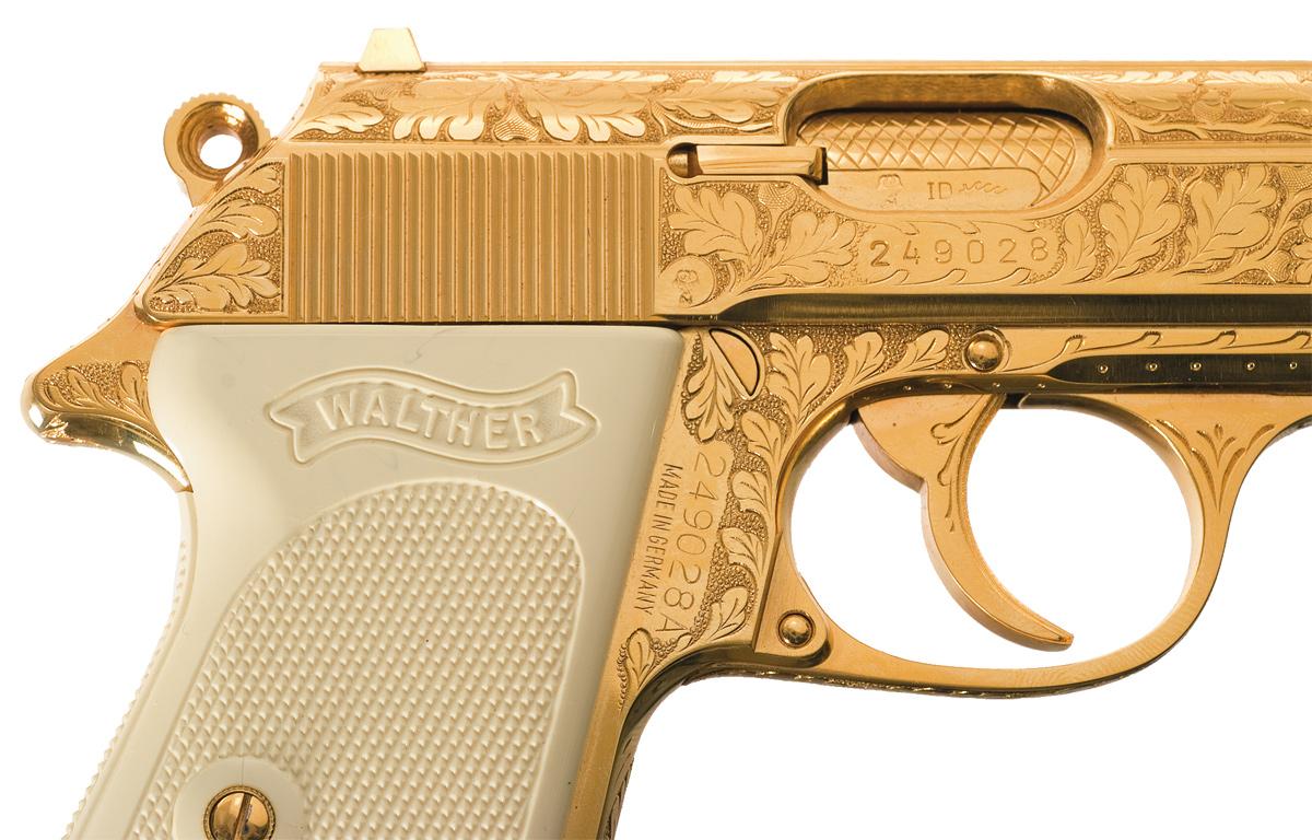 This pistol is fully covered with oak leaf pattern engraving with a punch dot background and has a gold-plated finish with no import marks. The wrap-around grips are white plastic with checkered panels and the Walther Banner at the top and "MADE IN GERMANY" on the bottom of the left panel. The sides of the trigger are lightly engraved and the right side of the chamber is cross-hatched as well as being marked with the Eagle "N" and Ulm antler on each side of "ID". The Walther Banner and the factory legend, caliber and model designation are marked in a panel on the left side of the slide. The commercial "Eagle/N" proof mark and the serial number are surrounded by raised panels on the right side of the slide. The serial number is marked vertically on the right side of the frame behind the trigger above "MADE IN GERMANY". The magazine in the pistol is gold plated and unmarked with a white plastic extension. Complete with a factory case that is covered in blue leatherette and lined with wine colored velvet and an extra gold plated magazine that is unmarked and has a diamond pattern engraved on the floor plate. The exterior of the lid is decorated with the Walther Banner and it has the original factory test target.