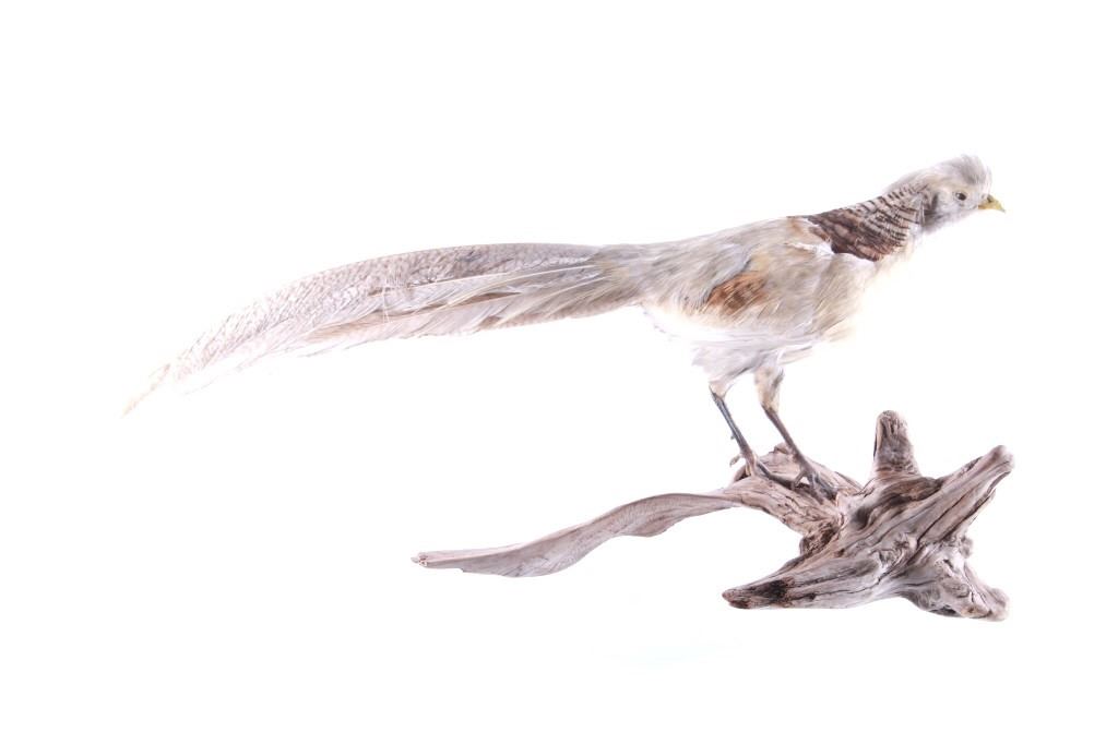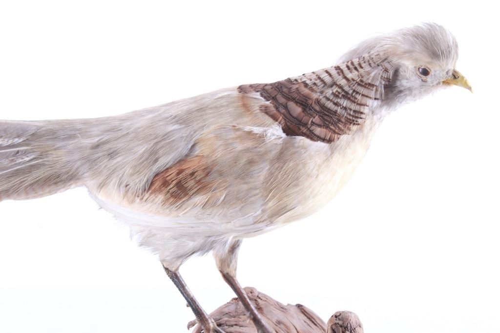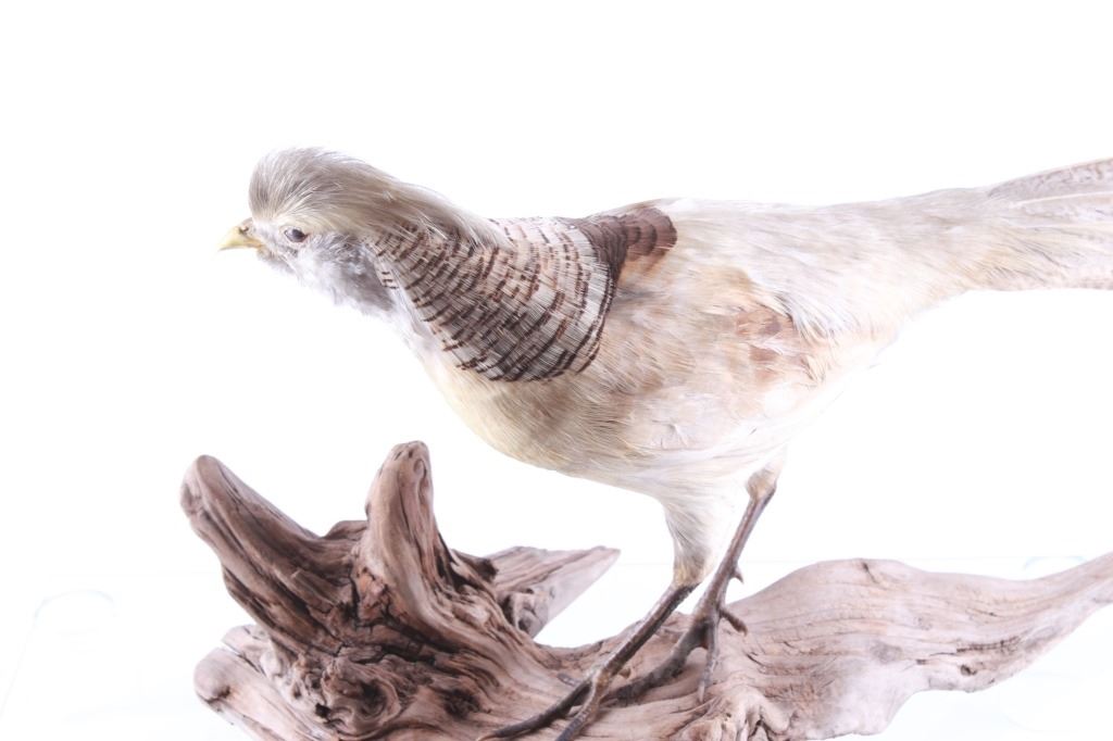 Featured in this lot is this outstanding full standing female pheasant taxidermy mount. The pheasant taxidermy mount shows a wonderfully and professionally crafted with a female pheasant standing on a juniper base with coloration of beige, off white, and brown, and shows a full tail with great craftsmanship to the taxidermy. The condition of this taxidermy mount is good with no obvious signs of damage with good overall condition. The measurements of this pheasant is 13 1/2" x 12" x 19".