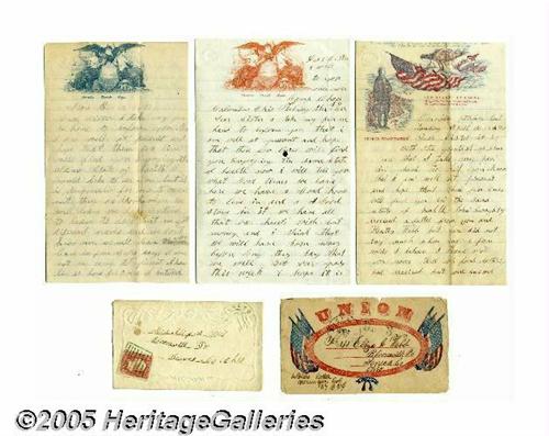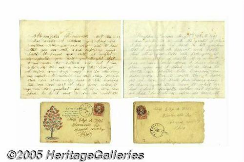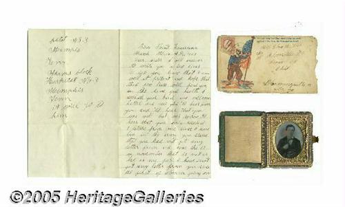 <B>Outstanding Group of Civil War Soldier Letters With Photo, 57th Ohio Volunteer Infantry</B></I> All from Pvt. John Webb of "B" Company of the 57th Regiment, Ohio Volunteer Infantry. Included in this historical lot are eleven letters written by Webb to his sister, Miss Eliza A Webb, of Bloomville, Ohio. The 57th was organized February 10, 1862, under Colonel William Mungen, and entered the field soon after, moving up the Tennessee River. It participated in the battle of Shiloh with credit, against overwhelming numbers, and advanced with the army against Corinth. One of these letters was written just after the Battle of Shiloh, and reads in part (as written): <I>"...tell you about the fight that I was in I suppose you heard of the great battle that was fought on the Tennessee river at pits burg landing it was one of the greatest battles ever fought in the South western states it commenced in the morning about six oclock we fought all day a Sunday and monday about three oclock the Rebels commenced to retreat we followed them til night tuesday we advanced after them about five miles and had another small battle I captured a nice Secess blanket worth about five Dollars I saw some prety a hard sights there was a cannon ball Struck a man about ten feet from me... I saw hundreds of dead men in the there was 7 wounded and one killed in the company that I am in as noble a boy as we had in our company was killed while Standing by the read white and blue the company mourns his loss very much he lays on the banks of the tennessee where many more of the brave..."</B></I> The letters date from November 24, 1861 through April 5, 1863 and some are written on patriotic stationery and mailed in patriotic covers (most present). Private Webb gave his life for the Union cause on May 19, 1863 at Vicksburg. Also included in this lot is a 1/9th plate ambrotype of John Webb (civilian clothes) in a fancy case. Excellent grouping, letters in fine condition. See lot # 25128 for a 1/9th plate ferrotype of this soldier. Lot:251