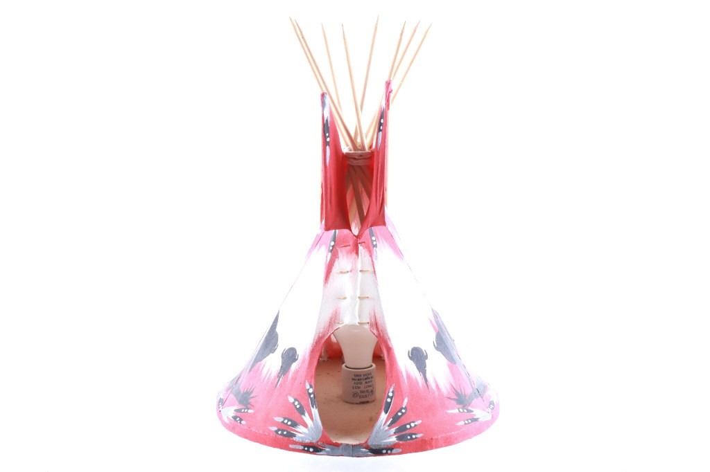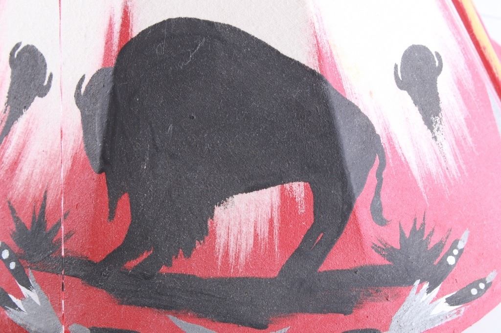 Featured in this lot is this outstanding handmade teepee or Tipi light fixture. The lamp features a wonderfully and professionally hand crafted teepee design to the construction with cloth material adorning the walls of the teepee and is beautifully painted with buffalo adorning the outside walls of the teepee with a red decoration set as a backdrop to the hand painted decoration. The condition of this of this teepee lamp is good with no obvious signs of damage and in good overall condition. The lamp has been tested to work. The measurements of this lamp are 16" x 11 1/2" x 11 1/2".