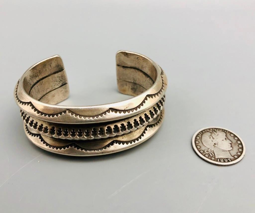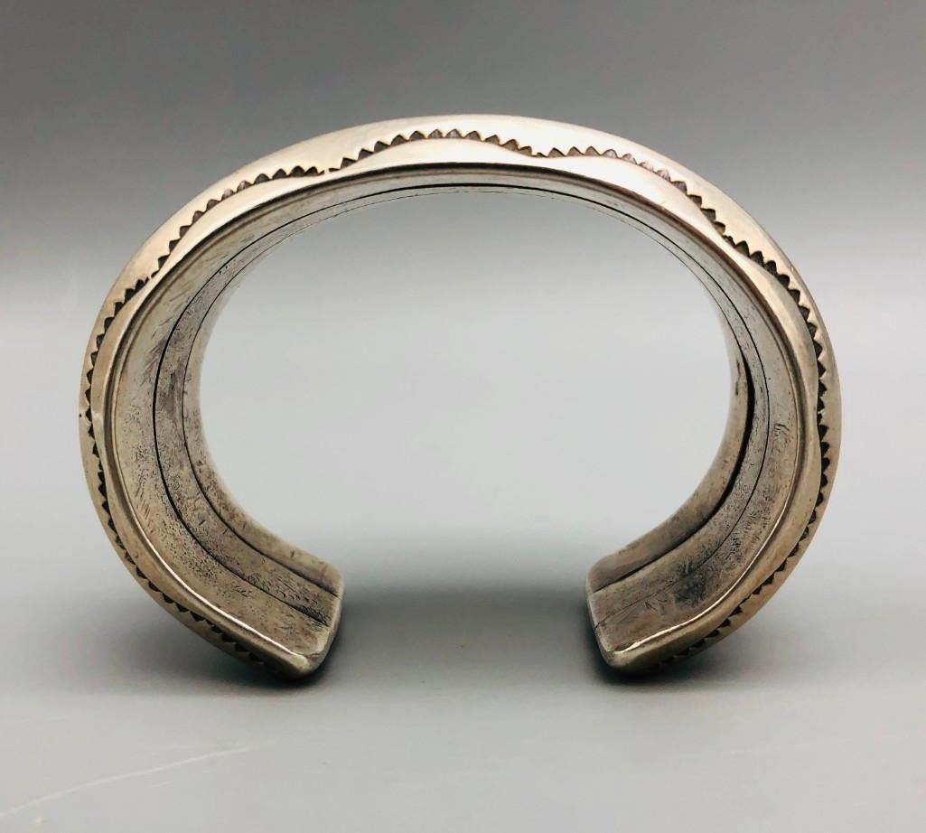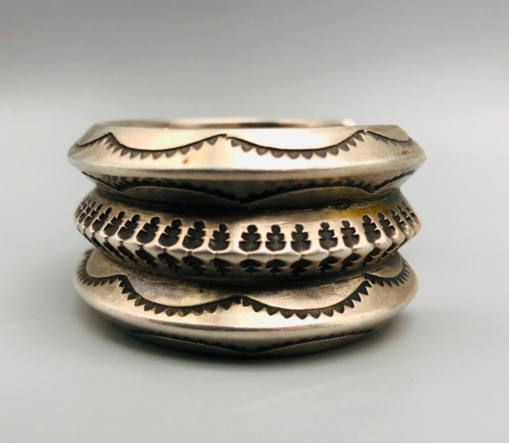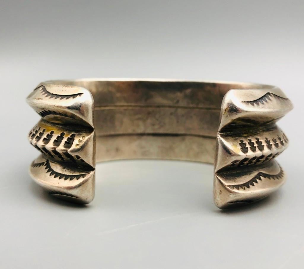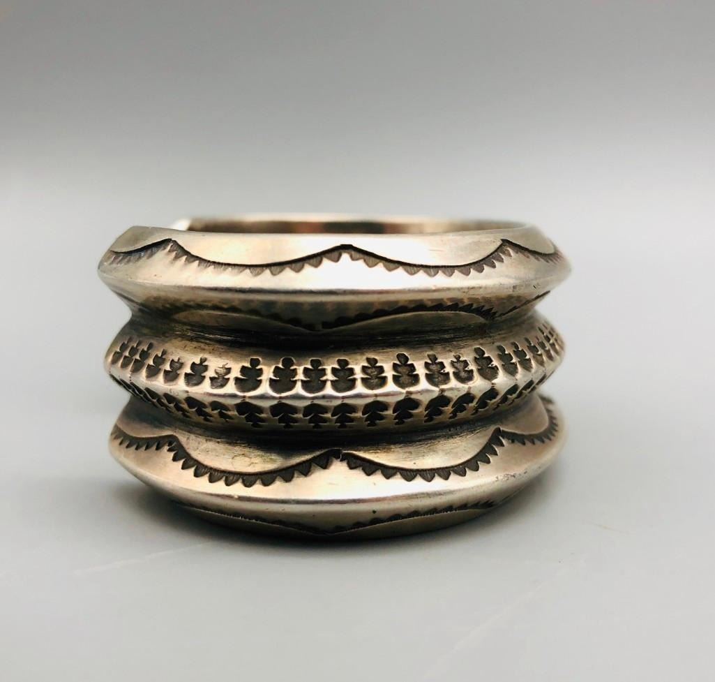 Here is an outstanding, heavy, ingot bracelet. This bracelet features fabulous hand stamped designs throughout and has substantial weighted feel to it. This is a great bracelet to wear alone as a statement piece or to stack with other bracelets. MARKER: Unmarked. APPROX. AGE: Circa 1920s-1930s. SIZE: Inside circumference measures approx. 5-1/2 inches with an additional 1-1/8 inch opening (making it fit an approx. 6-5/8 inch wrist.) It is 1-1/8 inches wide at its widest part and weighs 149.5 g. CONDITION: Good for its age, normal wear expected. Please look closely at the pictures as they are an important part of our description and are hereby incorporated into the description, specifically with regards to condition. SHIPPING: There will be a $5 handling / packaging fee for shipping this lot. The actual cost of postage will be added on top of that. BUY IT NOW: If you would like to buy this item now, without waiting for the auction day to bid on it, we do offer this option (which is available up to 48 hours before the actual auction starts). The “Buy it Now†price is the high estimate of this lot (plus applicable fees and the Buyer's premium is discounted to 10% when using the Buy it Now option). If you would like to exercise this option, you must contact us by email (or phone as long as you talk to someone live). Reference this lot number and your intention to "Buy it Now."
