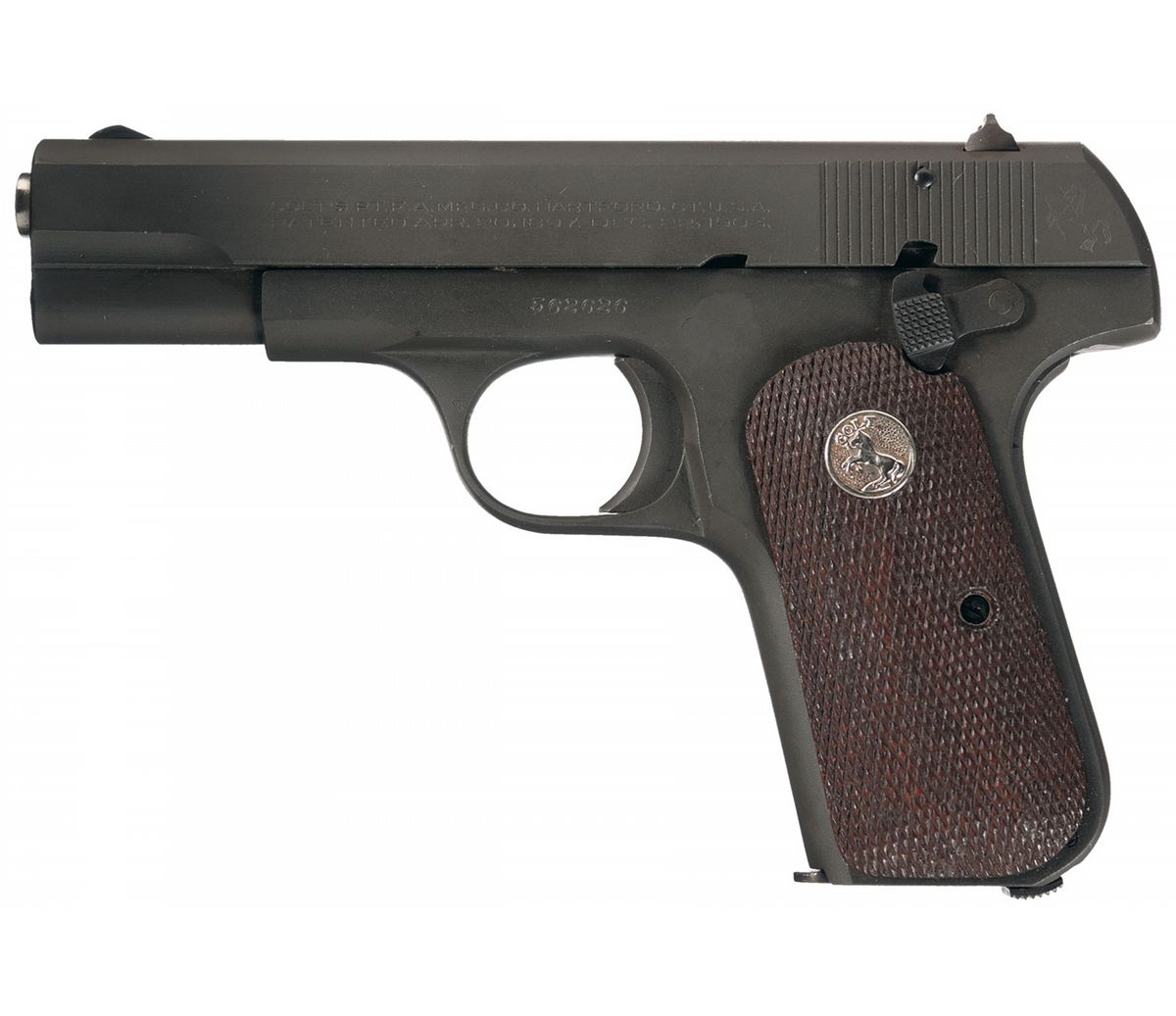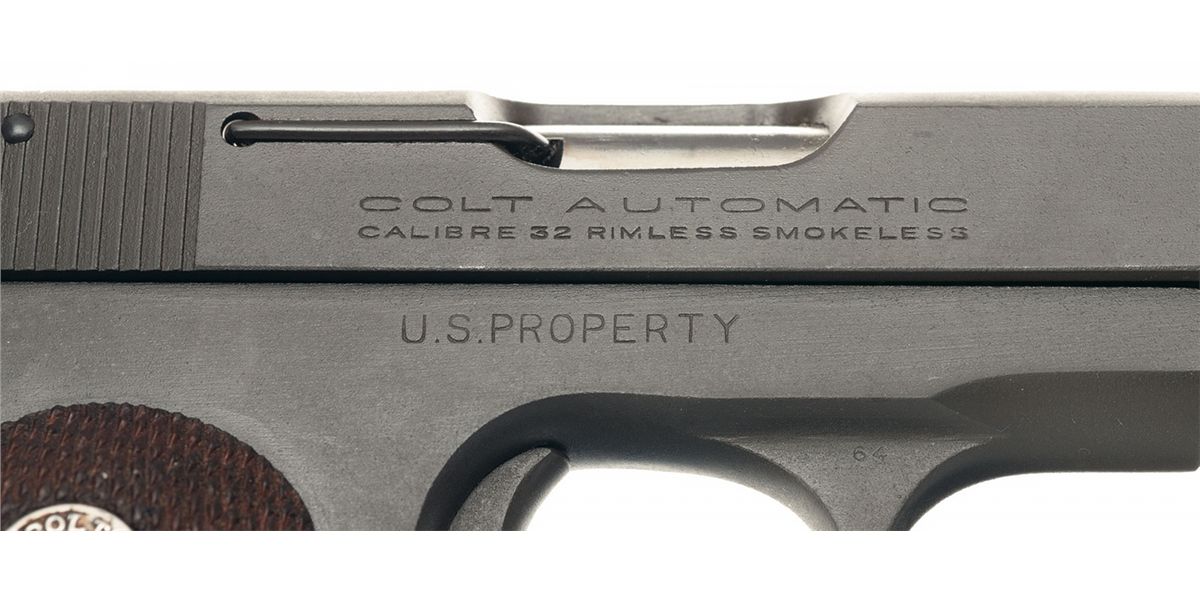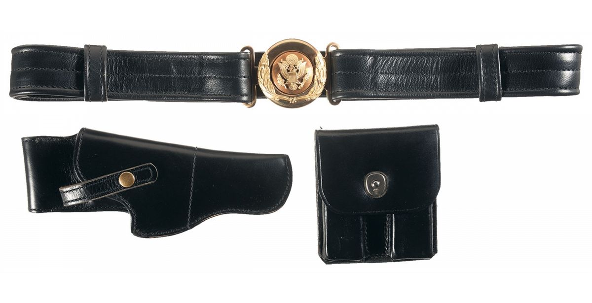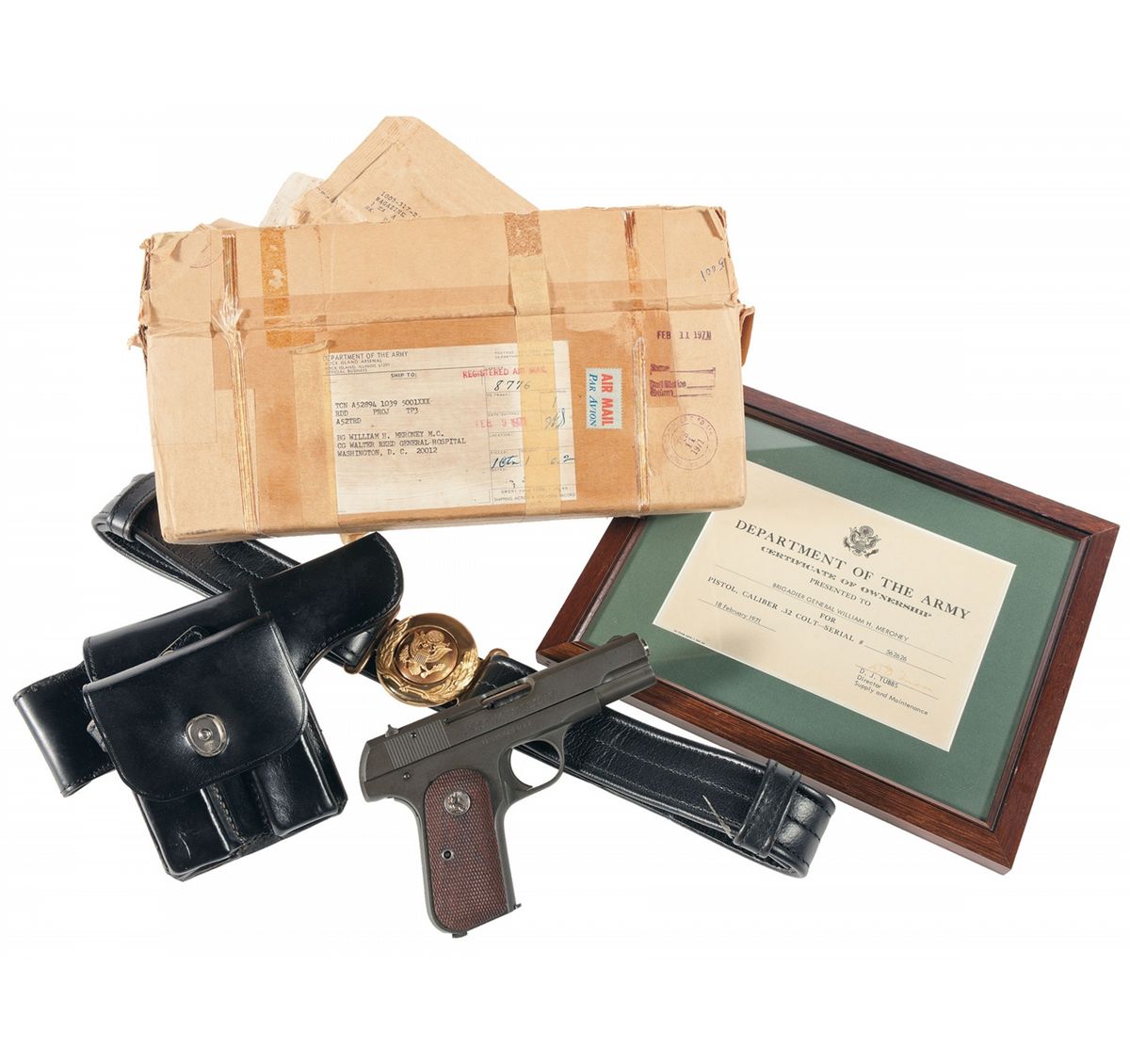 Condition: Near mint as arsenal refurbished with 99% of the (Rock Island Arsenal) parkerized finish overall, with absolutely no wear on the pistol, since the General was in the Medical Corp. the pistol was probably never fired after being refurbished. The grips are like new with nice original distinct checkering. The original GO leather holster, GO belt and buckle and accessories are also like new. A fabulous example of a highly desirable, well documented U.S. Property Marked Colt Model 1903 General Officer's complete pistol rig.