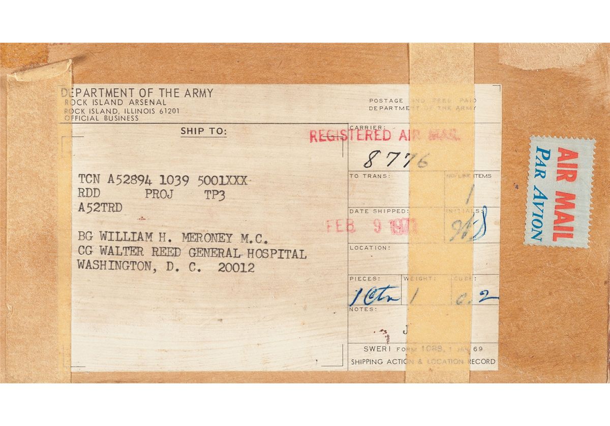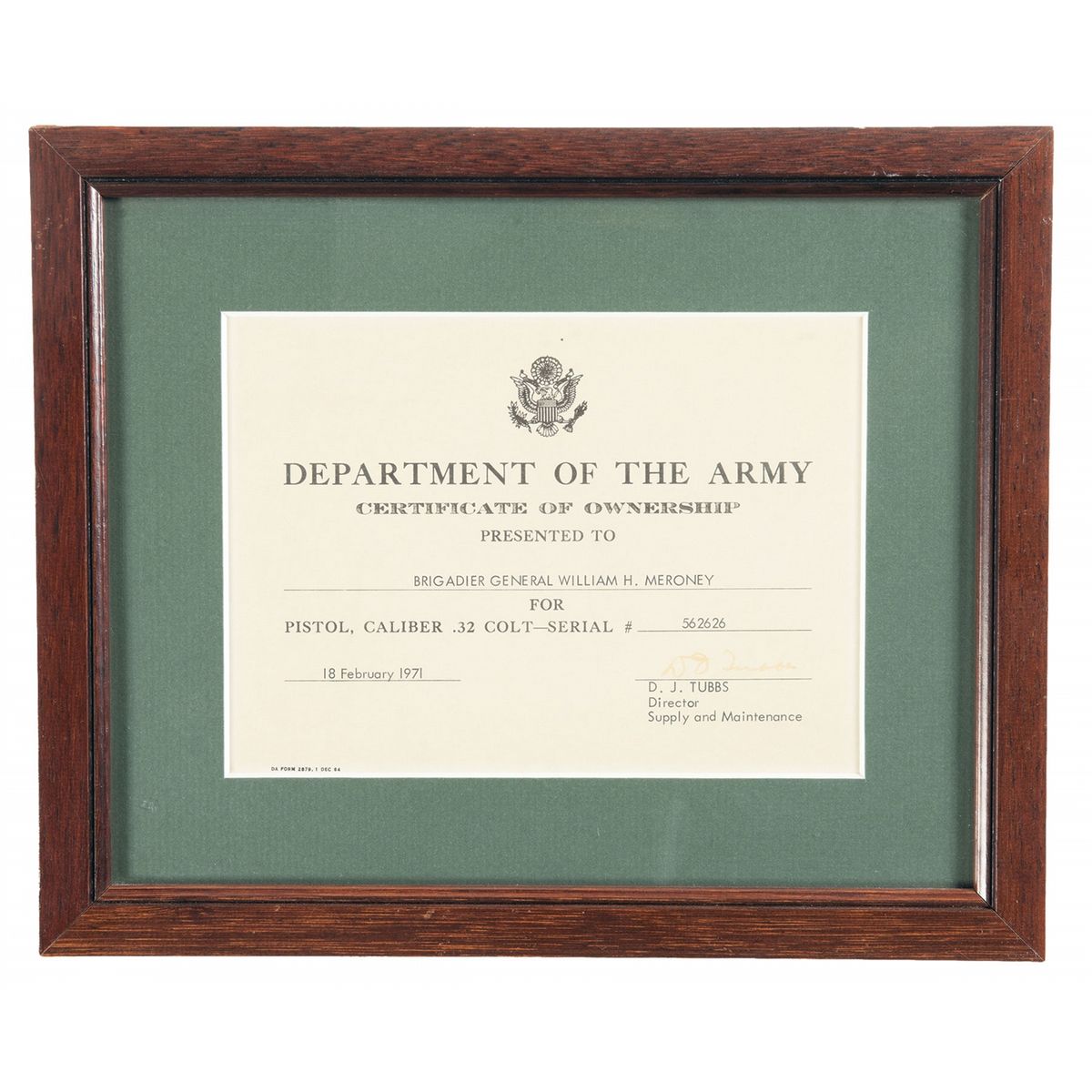 This is a beautiful example of a documented General Officer's, U.S. Colt Model 1903 Semi-Automatic Pistol that was issued to General William Meroney. It is accompanied with a copy of ownership registration/bill of sale, dated Feb 1971, and a framed DA Form 2879, Certificate of Ownership, issuing the pistol to General Meroney, also dated Feb 1971. General Meroney was a member of the U.S. Army Medical Corp and was stationed at Walter Reed when this pistol was issued. The pistol has the two line marking on the left side of the slide with the 1903 patent date followed by "COLT'S PT. F. A. MFG. CO./HARTFORD. CT. U.S.A." in two lines on the left side of the slide with the Rampant Colt behind the slide serrations. The right side of the slide is marked, "COLT AUTOMATIC/CALIBRE 32 RIMLESS SMOKELESS" in two lines below the ejection port. The left side of the trigger guard bow is stamped with a Colt "VP/Triangle" proofmark, while the right side has only a single number "64" inspector mark. The pistol has the late style semi-ramp front sight and rounded rear sight, with the all parkerized finish, blued barrel with polished chamber, and checkered walnut grips with German Silver Colt medallions. The pistol has one all blued magazine marked "Cal-32/Colt" on the floor plate and one spare magazine that is still sealed in the brown wrapping paper. The pistol is complete with a regulation U.S. Army issue U.S. General Officer's black leather holster for the Colt Model 1903 pistol. This style of holster, as noted on page 303 of the book "US Military Holsters" by Scott Meadows, was produced by the Atchison Leather Products Company and was in use by the military from 1956 until 1972. The holster is constructed of high polished brown leather with gold plated snaps and rivets. Also accompanying this holster is an original U.S. Army issue General Officer's issue black leather belt and brass buckle, a double pocket black leather magazine pouch, a spare magazine, as noted, cleaning rod and cleaning brush. The back side of the magazine pouch is marked "BAUER BROS MFG. CO./ST LOUIS MO.". This complete pistol, belt and holster rig is accompanied by the original shipping box and all the original packing material for each individual piece along with the white VCI pouch serial numbered to the pistol.