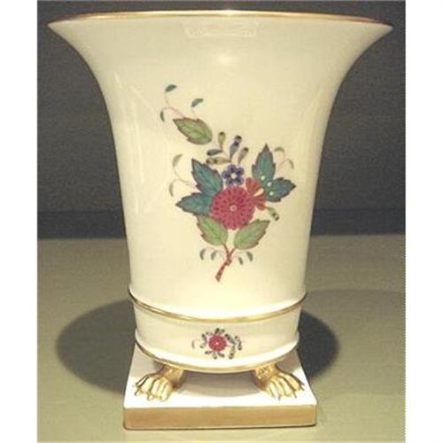 I purchased this hand painted Herend vase in Europe about 10-15 years ago. It is in excellent condition with no chips, cracks, or gold rubbing. It features the beautiful "Chinese Bouquet" pattern in multicolor. The piece stands 7" tall. The flared top is 6" in diameter. The pedestal base is rimmed with gold. The rim and the lower band enclosing small flowers are gold. The paw feet are gold, as well. The pattern number on the base is 6433. AF is the artist, I believe.