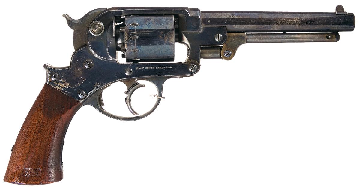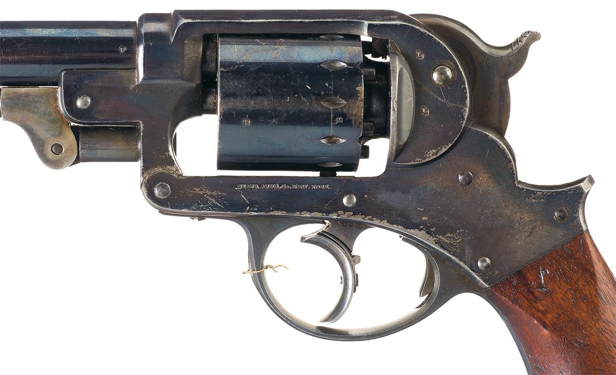 This excellent original Civil War Model 1858 double action revolver was manufactured under government contract by the Starr Arms Co., of New York, New York between January 1862 and May 1863. The revolver has a six-shot cylinder, solid frame, and one piece, oil-finished walnut grip. The barrel, frame, cylinder and trigger guard have a high polish blue finish. The loading lever and short spur hammer are color casehardened. A half-moon shaped front sight is mortised on the barrel and the rear sight is a shallow notch in the hammer lip. The right side of the frame is roll-stamped: "STARR'S PATENT JAN.15, 1856" and the left side is marked: "STARR ARM'S CO., NEW YORK" in a single line. The serial number, "18079 is stamped on the front of the frame, the inside of the hammer well and on the side of the cylinder. Ordnance, single-letter, sub-inspection marks are stamped on most major components. Two script Ordnance inspection marks are stamped on the right side of the grip and a single script inspection mark is stamped on the left side of the grip at the heel. Star Model 1858 DA revolvers were widely issued to Federal cavalry regiments during the Civil War.