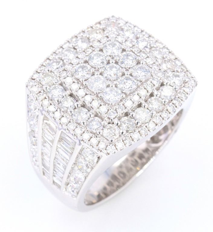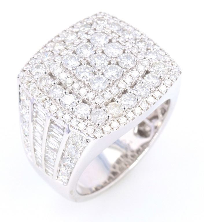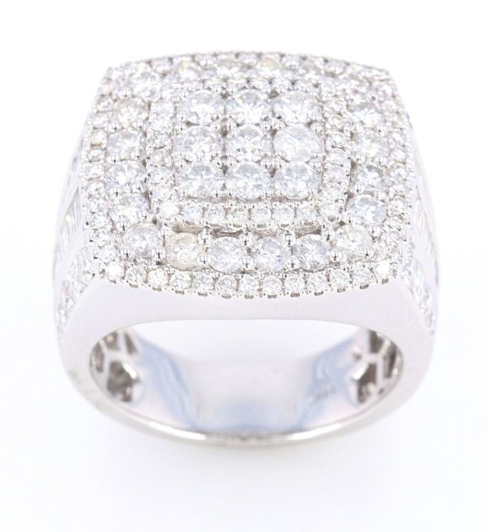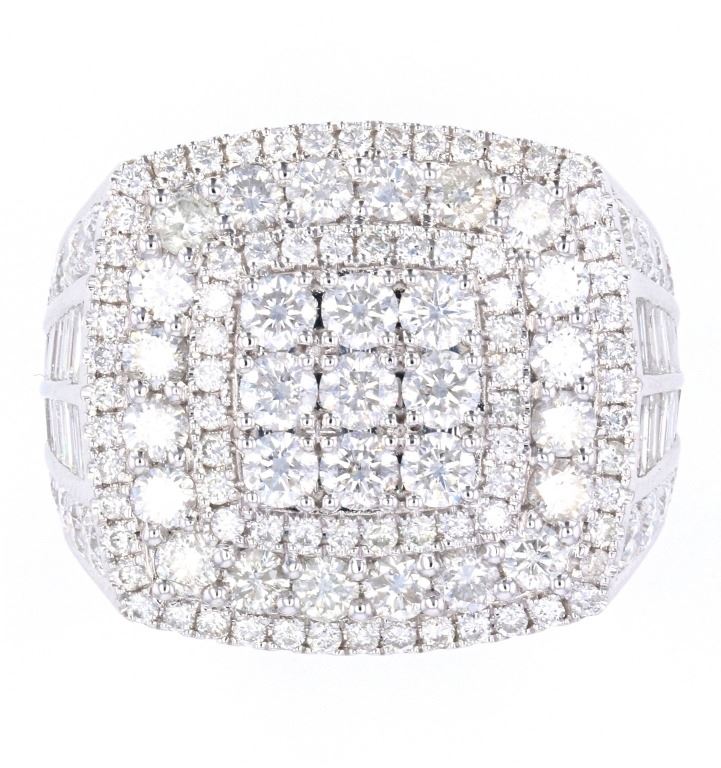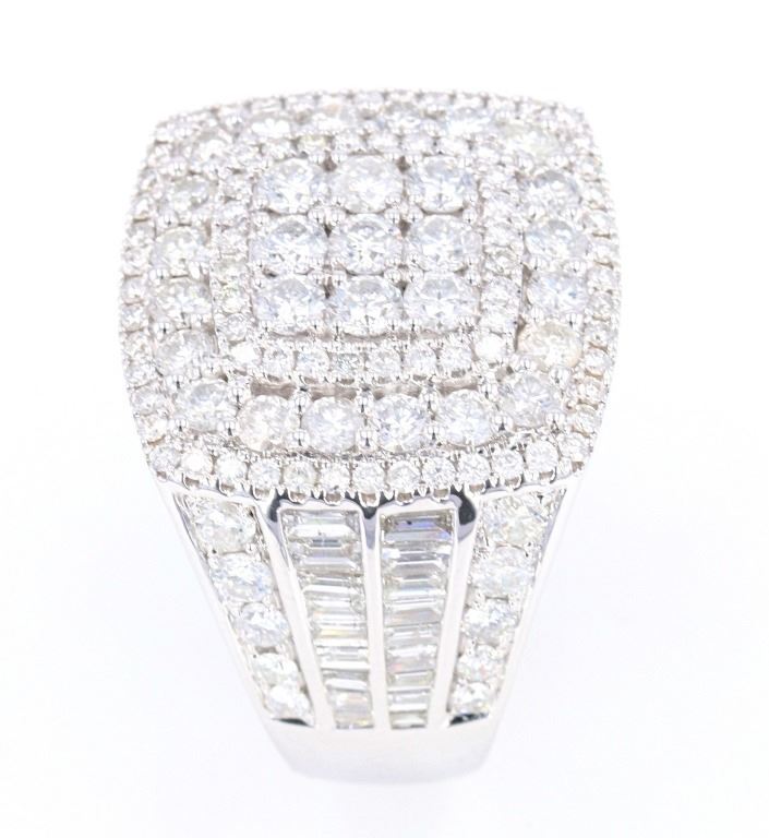 This is an outstanding men’s 14K white gold ring set with 5.56 carats of natural Diamonds. The ring shows an impressive tiered slightly curved square design showing nine larger round brilliant prong set diamonds surrounded by a stepped halo bezel of slightly smaller stones which is then stepped to a larger halo bezel of diamonds and finished by the last stepped halo bezel of diamonds. The front and rear of the tapering band has a nice high polish and the shoulders are channel and prong set with four rows of diamonds; two of round brilliant stones framing the two center sections of baguette cut diamonds (on both sides). The entire underside of the ring has a unique hexagonal honeycomb 14K gold lattice work and the band is stamped 14K CJ. In total the ring is set with 161 round brilliant and baguette cut natural Diamonds with an amazing brilliance and shimmer having a weight of 5.56 carats. This ring is truly a showstopper and “power ring”, being of a noticeable presence when worn, but not overwhelming the hand, but rather quite attractive on. The ring has a 14-karat white gold weight of 15.09 grams and is in a size of just over 11 US. Hands down the best men’s ring we have ever offered.