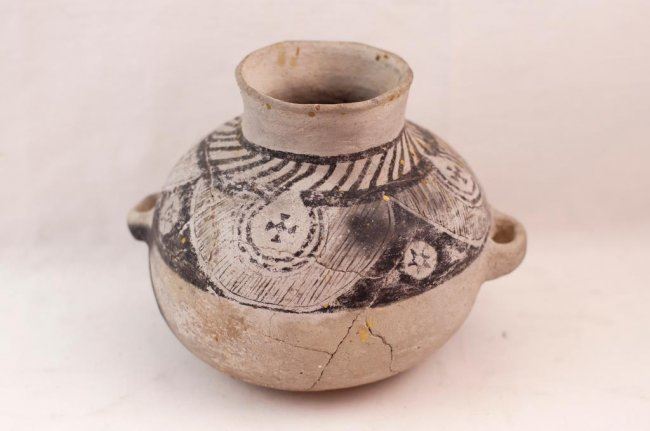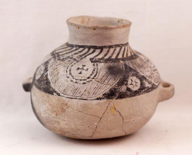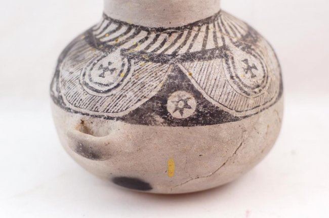 Found Mesa Verde - Dove Creek, Colorado; measures 10.5" diam 7" h - unusual four cross and star painted glyphs: Provenance: Collection acquired in the 1950's Dove Creek, Colorado