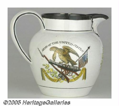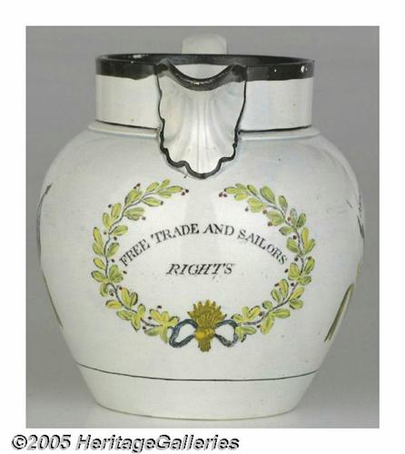 <B>Outstanding Multicolor War of 1812 Creamware Pitcher</B></I> Patriotic "Arms of the United States" vignette on either side, great "Free Trade and sailors rights" slogan under spout. The British strangle hold on trade and their policy of impressing American sailors on the high seas into the British navy were major issues of the war. Beautiful condition. Height 5.75", diameter with handle 6.5". Lot:252