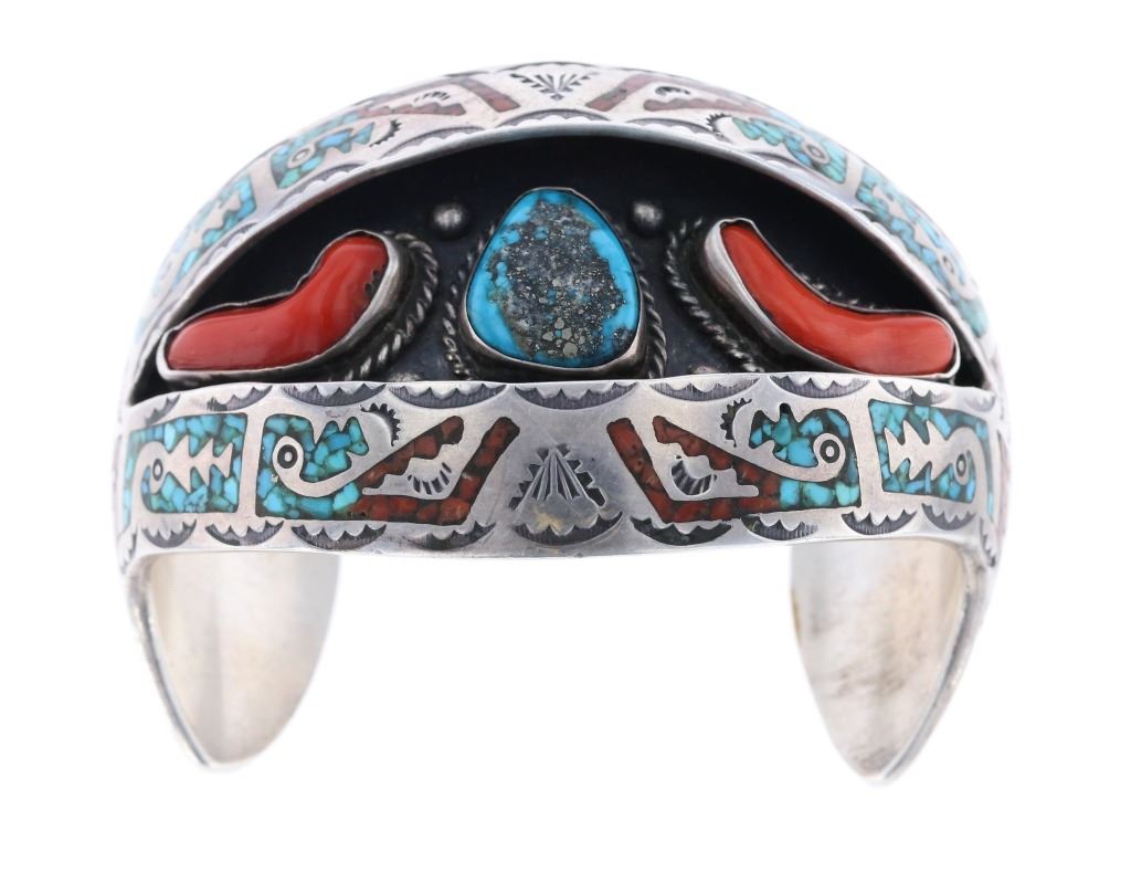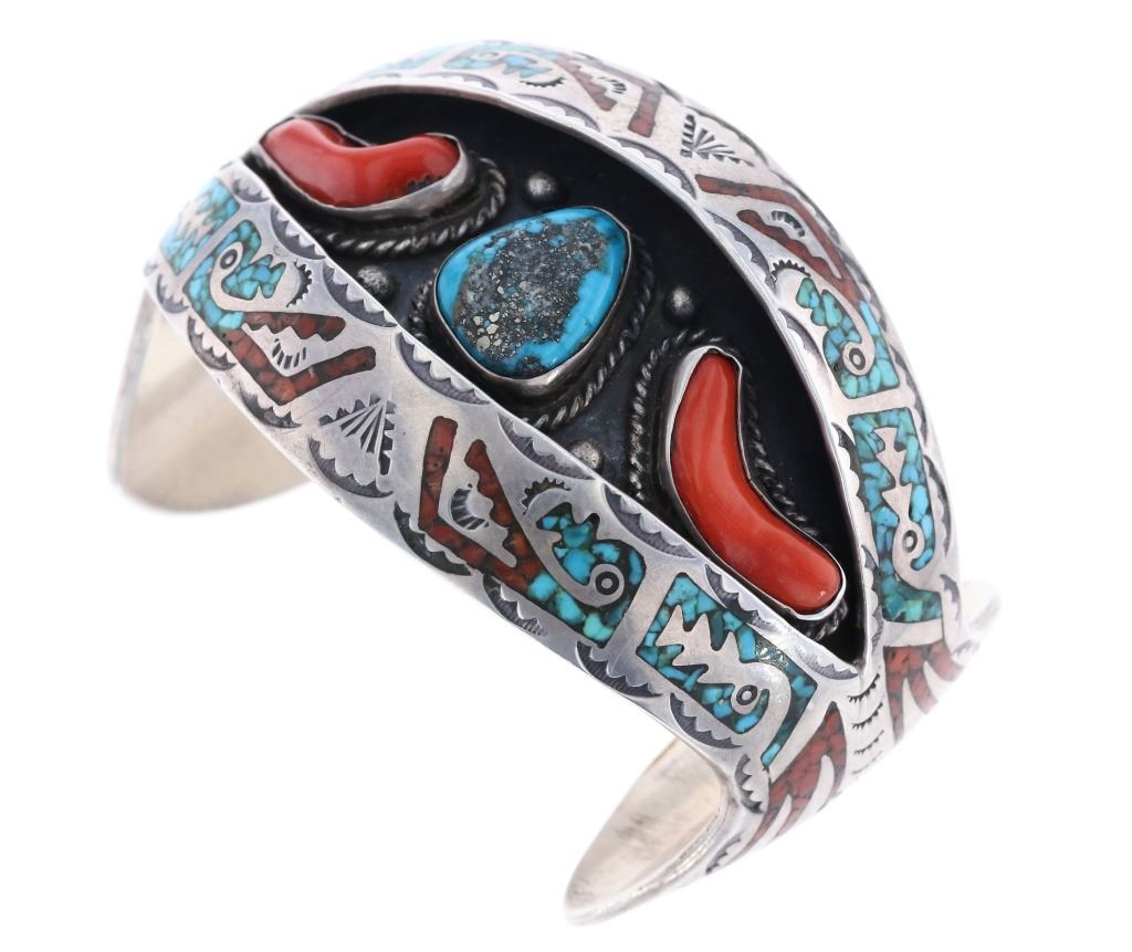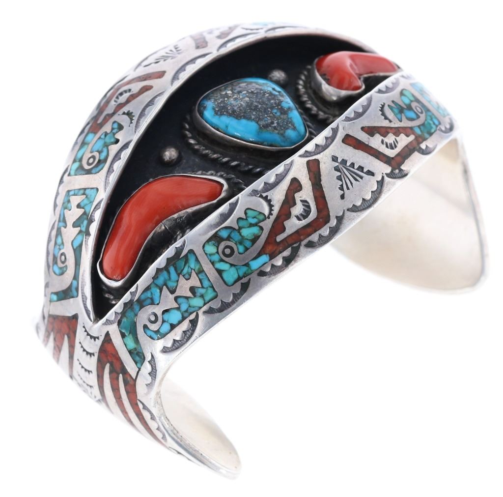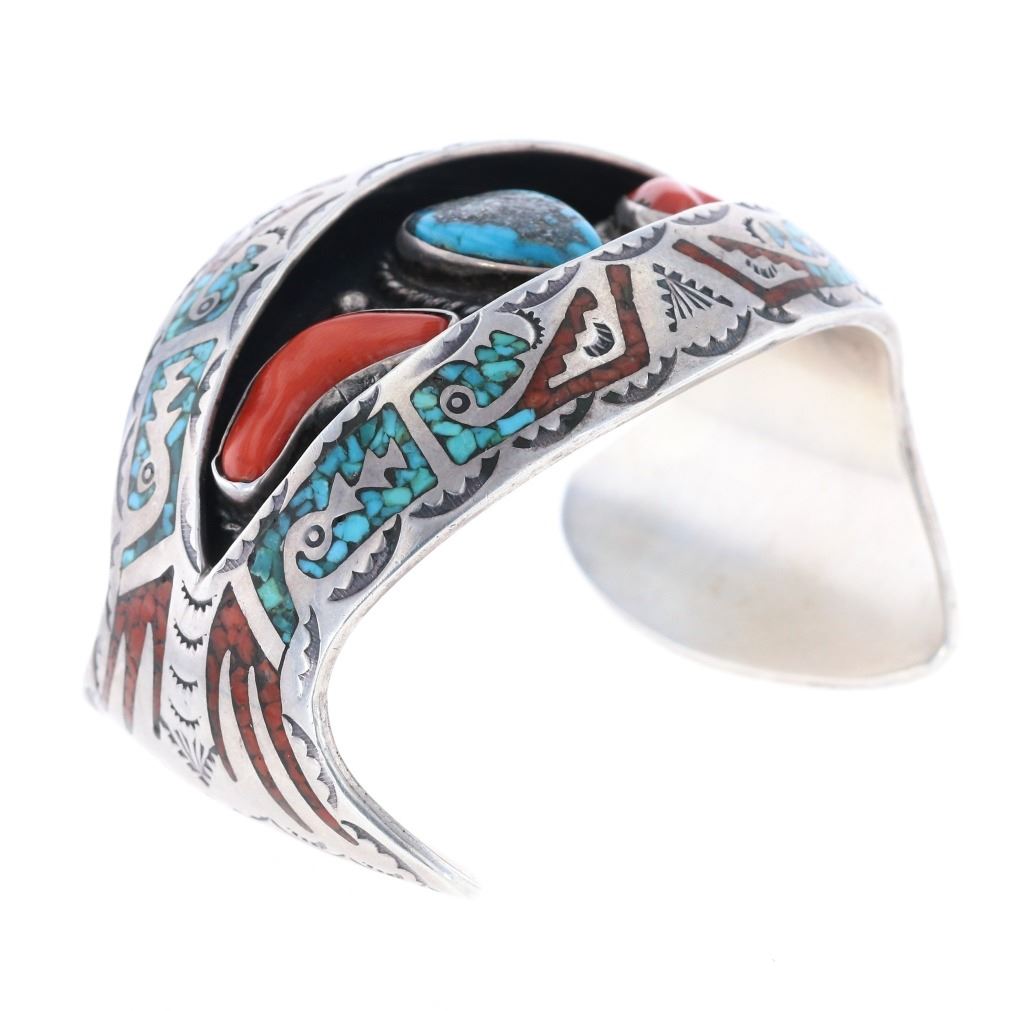 Featured in this lot is this handmade sterling silver, chip inlaid, and shadowbox bracelet from Navajo artist B. Nez. The bracelet features a wonderfully and professionally crafted, intricate, chip inlaid turquoise and red branch coral in geometric patterns and a slot of shadowbox design with two large, rough cut red branch coral and a central Morenci turquoise cabochon. The artist's signature can be seen on the underside of the bracelet and is marked 'handmade.' The condition of this bracelet is good, with no obvious signs of damage. The measurements of this bracelet are 1 3/4" x 2 5/8" x 1 3/4" and the circumference is 4 1/2". The collective weight of this bracelet is 82.1 g.