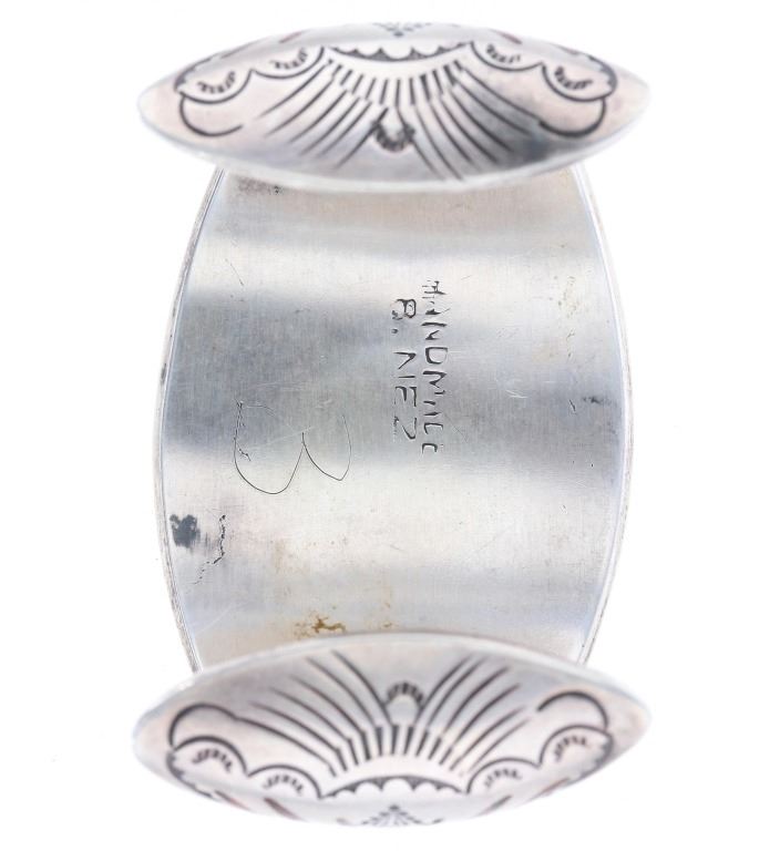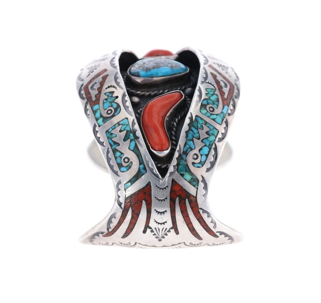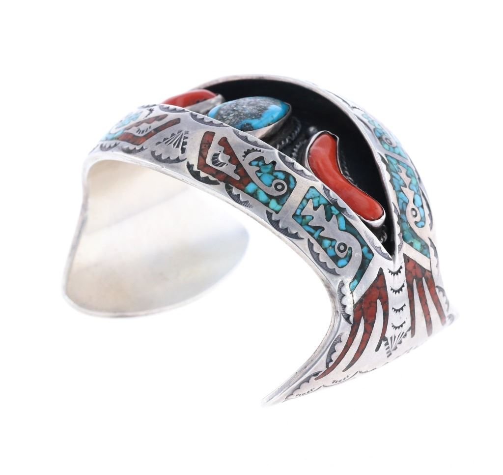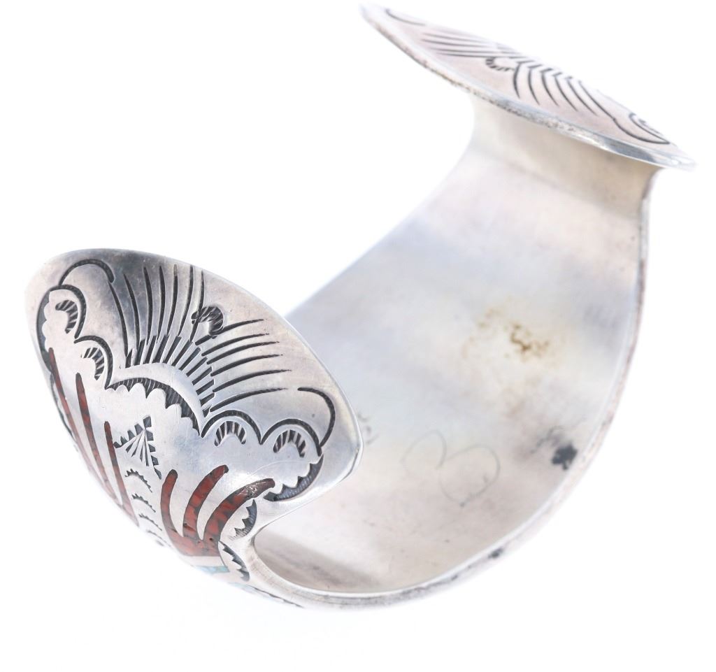 Featured in this lot is this handmade sterling silver, chip inlaid, and shadowbox bracelet from Navajo artist B. Nez. The bracelet features a wonderfully and professionally crafted, intricate, chip inlaid turquoise and red branch coral in geometric patterns and a slot of shadowbox design with two large, rough cut red branch coral and a central Morenci turquoise cabochon. The artist's signature can be seen on the underside of the bracelet and is marked 'handmade.' The condition of this bracelet is good, with no obvious signs of damage. The measurements of this bracelet are 1 3/4" x 2 5/8" x 1 3/4" and the circumference is 4 1/2". The collective weight of this bracelet is 82.1 g.