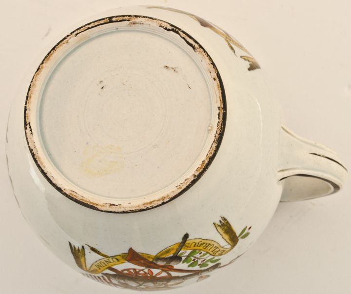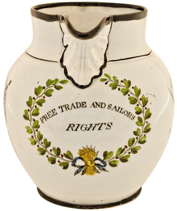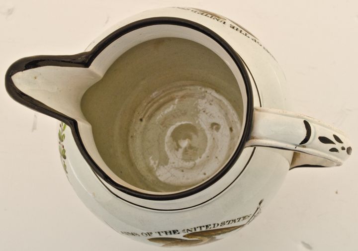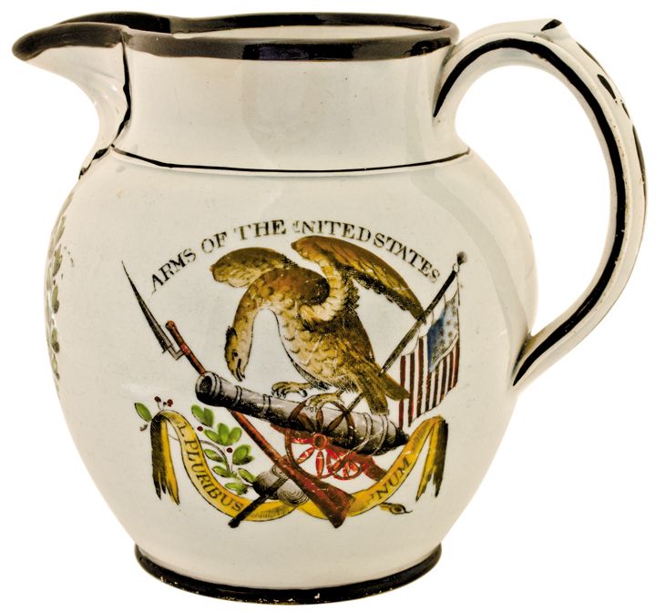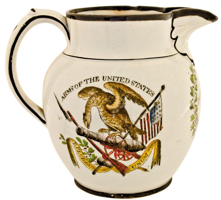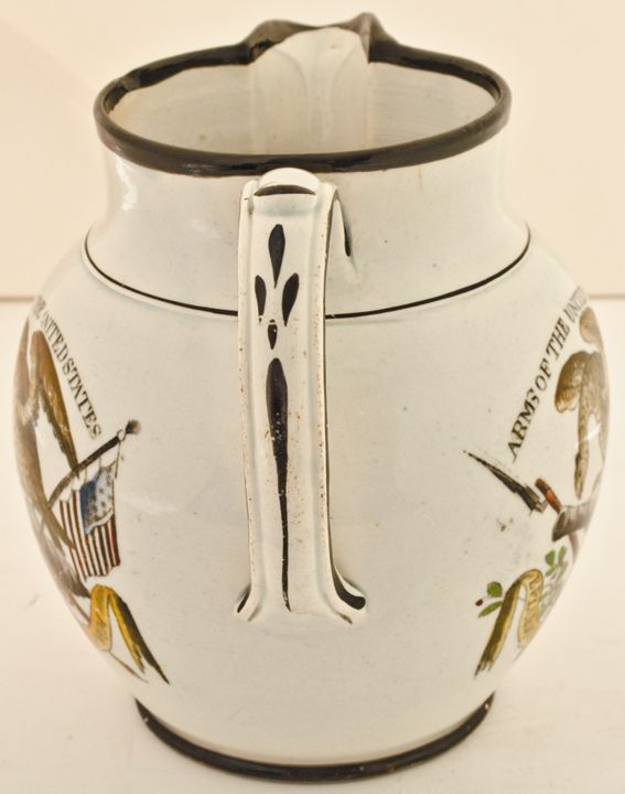 This is an extremely rare and historic 5” tall Pearlware Pitcher with black trim elements, that is outstanding in both its important design features and beautiful, highly colorful appearance. Each side has "ARMS OF THE UNITED STATES," listed as Arman “A.25” on page 67 of David Arman’s major reference book, “Anglo-American Ceramics Part I.” Arman also states that this beautiful and highly ornate, exciting design is probably by Enoch Wood and Sons, England. Under the spout within a surrounding wreath with a splay of Arrows at bottom is the legend reading, “FREE TRADE AND SAILORS RIGHTS” which is listed as “F.18” on page 98 of Arman’s reference.