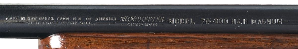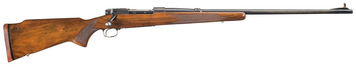 Manufactured in 1951. Standard markings including the factory proof on the barrel and receiver. Ramp front sight with custom non-factory replacement blade (hood removed), rear sight removed (filler block added), and receiver drilled and tapped for scope mounts. Checkered high comb pistol grip stock with Super Grade style sling swivel bases and a factory solid rubber recoil pad.