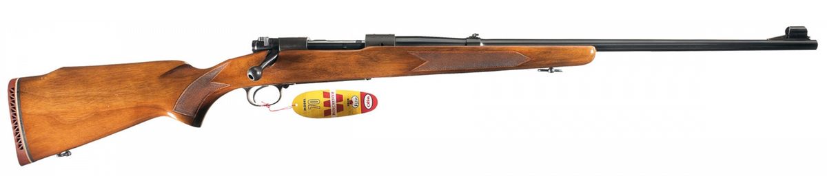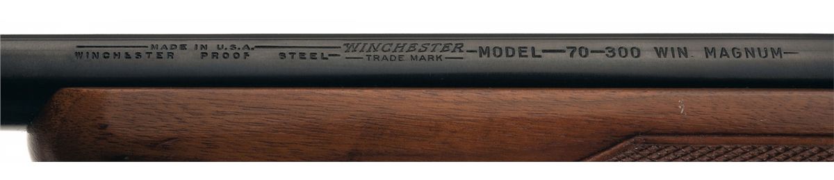 Manufactured in 1963 in the rare .300 Winchester Magnum caliber. Standard markings including the factory proof on the barrel and receiver at the breech. The bolt is numbered to the gun and has a hollow bolt knob. Receiver is tapped for sight/scope mounting and has a straight tang and late type safety. Equipped with hooded ramp blade front sight and adjustable folding leaf rear sight. Mounted on a checkered high comb pistol grip stock with sling swivels and a vented factory recoil pad.