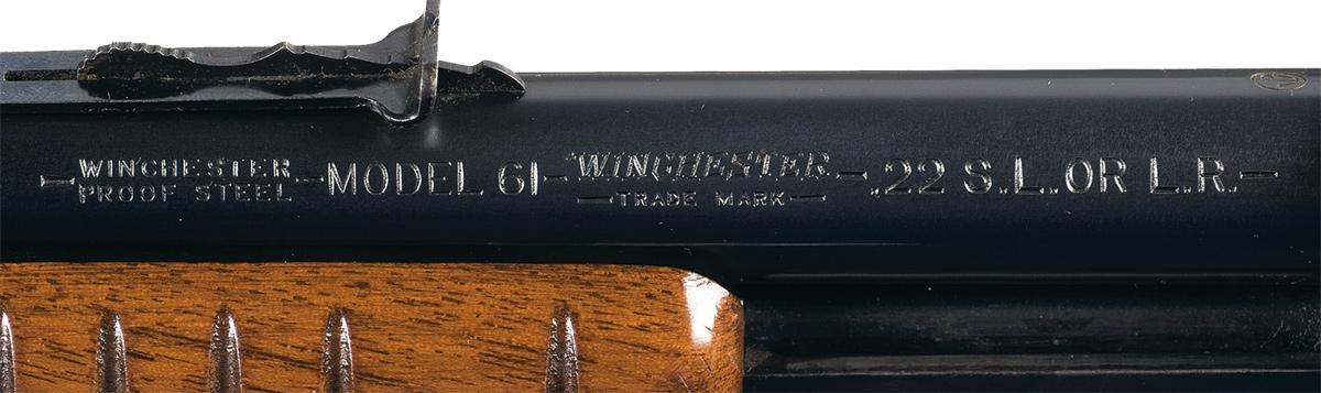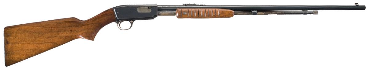 Manufactured in 1934. This rifle features a fixed blade front sight with bead and an adjustable rear sight. Standard barrel markings with the Winchester proof on the top of the barrel at the breech and on the receiver. The rifle has a 3/4 length magazine tube. Mounted with a 11 groove, flat bottom forearm and smooth pistol grip stock with a checkered metal buttplate. The bottom of the receiver is marked with the serial number as is the trigger guard plate.