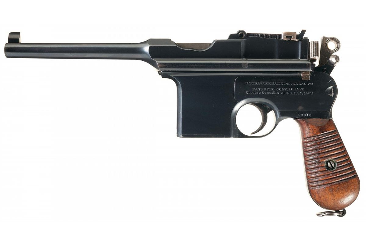 This is just a beautiful all original and very desirable Astra Model 900 pistol. These pistols were designed to capitalize on the popularity of the Mauser Broomhandle and are actually shaped to look and operate exactly like the 1896 Mauser Broomhandle. The side plate is marked ""ASTRA" AUTOMATIC PISTOL CAL 7.63/PATENTED JULY. 12. 1928/Unceta y Compania GUERNICA " with the serial number (27918) stamped directly above the left grip panel. The right side of the frame has the Eibar proofmarks that consist of a knight's helmet over a small box with an "X" inside, "Star/F" and the "Crown/circled P" firing proof for automatic pistols. This same last proof of a "Crown/circled P" proof is found on the right front edge of the barrel extension and again on the rear end of the barrel directly in front of the chamber area. It has the standard tangent rear sight graduated from 50-1,000 meters with the fixed inverted "V" front sight. The back strap is cut for shoulder stock and it has the 12 groove grip panels, and lanyard loop on the butt. Both grips are matching numbered "918" on their back sides.