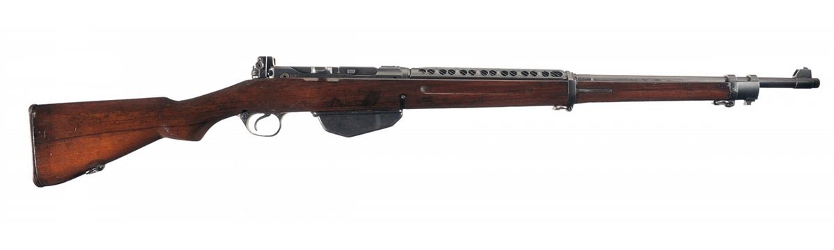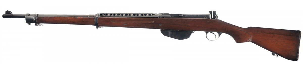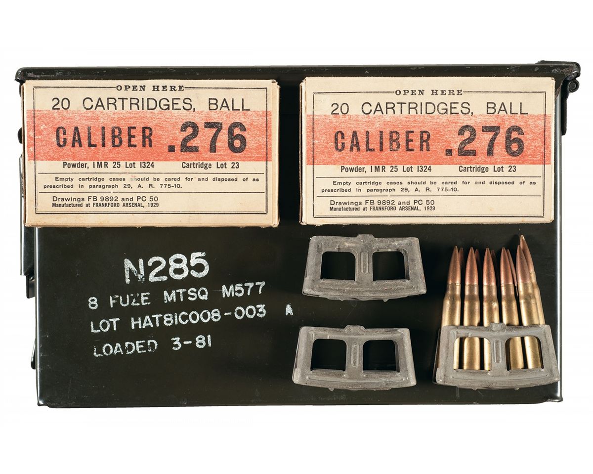 This is a beautiful example of a very rare Pedersen Self-Loading Rifle designed by John D. Pedersen made around 1930 and manufactured in England by Vickers-Armstrong. In 1923 the Army hired J.D. Pedersen to design a semi-automatic rifle as a replacement for the Model 1903 and Model 1917 rifles. The first Pedersen self-loading Rifle was approved for testing in 1924 with Springfield Armory manufacturing twenty Pedersen rifles for initial field tests in 1927. These field tests were intended to be run concurrent with the .276 caliber semi-automatic rifle developed by John C. Garand. The Pedersen rifle performed well in the initial service tests and in 1929 Pedersen contracted with the Vickers-Armstrong Company to manufacture the Pedersen Self-loading Rifle in England, so that the English-made version of this rifle could be used in the final Army tests between the Pedersen and Garand rifles. In 1932 the Army selected the Garand rifle for limited procurement and development of the Pedersen rifle for the Army ceased. Vickers-Armstrong manufactured less than 200 Pedersen Self-Loading Rifles for testing by China and Portugal. This example is chambered for a .276 caliber cartridge tentatively approved in 1927 by the U.S. Army as a replacement for the .30-06 cartridge. The rifle features a delayed blow-back action with toggling breech-block design that uses a 10-round, en-block clip similar to that used in the M1 Rifle. The left side of the receiver is roll stamped "PEDERSEN SELFLOADER PA/VICKERS-ARMSTRONGS LTD". The serial number, "124" is located on the right side of the receiver, and the top of the receiver ring is stamped with a circled "C2" marking. The rifle has a distinctive half round barrel with spiral cooling fins that is covered by a steel hand-guard/heat shield with fourteen cooling holes on each side and is fitted with a Model 1917 type pattern upper barrel band. The bolt toggle has a sliding bar safety marked "REDY" on the left side of the bar and "SAFE" on the right side. The rifle is fitted with a one-piece walnut pistol-grip stock with finger grooves on the side of the forend with a series of cooling holes on the underside of forend that extend from the upper barrel band to the trigger guard. The rifle is equipped with a unique fully adjustable rear sight, that uses a rotatory-drum mechanism for elevation adjustment with a sliding-bar/rear sight aperture for the windage adjustments. Both are graduated in half-minute of angle adjustments. Any examples of a Pedersen Self-Loading Rifle should be considered very rare and certainly a center piece of any British or early U.S. marital rifle collection. As noted this rifle comes complete with 16 full boxes of original .276 Pedersen ammunition in the red and brown boxes with 10 loose rounds and four original stripper clips, stored in a green ammunition can.