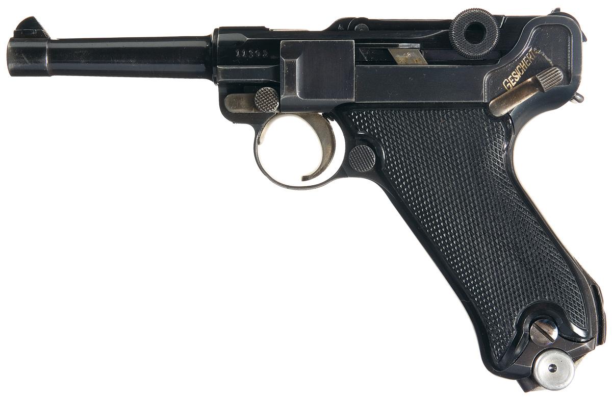 Condition: Excellent with 95% of the original blue finish with some slight blue loss on the edges and high spots, with some thinning on the lower backstrap, the front edges of the frame and the left side of the front sight base barrel ring. The smaller parts, take down lever and safety retain 90% of their straw color with the trigger retains 50% of its straw color. The holster is in excellent condition with some slight black finish loss on the lower toe and area and the front top portion of the flap itself, the rest of the holster is excellent with nice clear deep markings with all stitching intact still showing the original white color thread. As noted this pistol has all matching numbers to include the original matching magazine. An excellent example of a very rare 1943 dated Krieghoff Luger pistol.