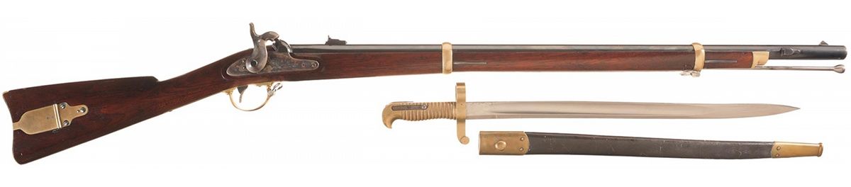 Remington Model 1863 "Zouave" Percussion Rifle manufactured in 1863. The rifle has a blued barrel, casehardened lock, hammer, and barrel tang, brass forearm tip, barrel bands, trigger guard, patch box and buttplate. The stock is oil finished black walnut. The rifle is fitted with a straight shank iron ramrod with tulip head. The barrel has a wide base iron front sight and two position Model 1855 rear sight with a lug on the right side for the sword bayonet. The lock plate is dated "1863" behind the hammer and roll stamped with the Eagle and Shield motif above "U.S." followed by "REMINGTON'S/ILLION N.Y." in two lines in front of the hammer. The top of the barrel is dated "1863" on the center line and stamped with "V/P/EAGLE HEAD", proof and inspection marks on the left side. The left barrel flat is stamped "STEEL" followed by the Ordnance sub-inspection mark "R.K.A." Single letter Ordnance sub-inspection marks are stamped on most components. The left stock flat is stamped with two Ordnance inspection marks which consist of the initials "B.H." and "HDJ" in script letters with rectangular borders. "U.S." is stamped on the heel of the buttplate. The rifle is complete with the original sword bayonet and scabbard. The bayonet has a bright finished 20 inch fullered blade with cast brass grip with down-turned quillion. The grip is stamped with a "B.H." inspection mark and small "S" sub-inspection marks. The scabbard has a black leather body with brass throat, frog stud and tip. The Model 1863 Percussion Rifle was an improved version of the U.S. Model 1855 Harpers Ferry Rifle, and has the distinction of being the last percussion rifle purchased by the Ordnance Department. Many collectors consider the Model 1863 rifle to be the best looking and best made Civil War longarm.