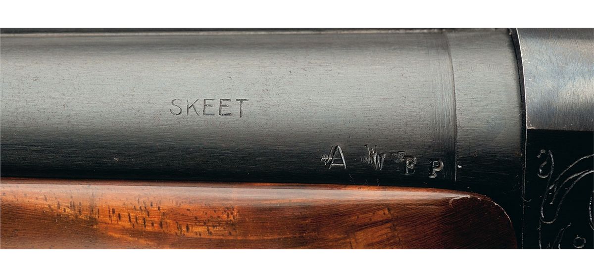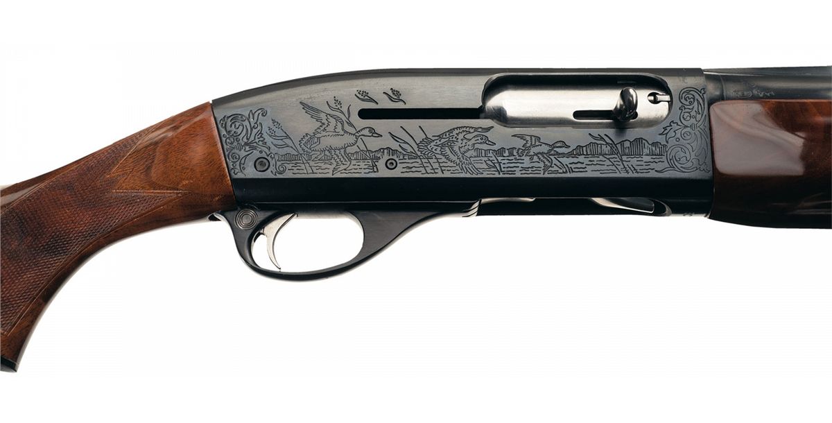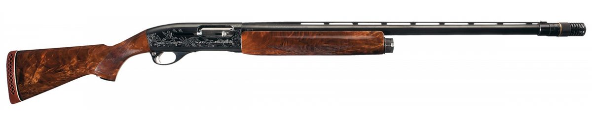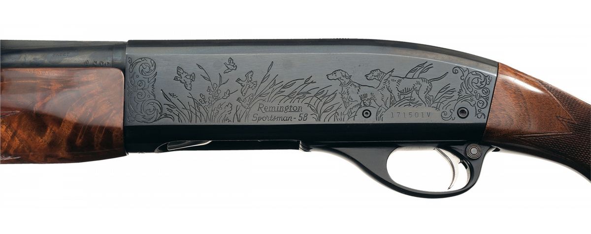 Produced from 1955 to 1964, the Model 58 was the first Remington semi-auto to move away from Browning's recoil-driven design, instead using gas operation. Brass front and nickel mid beads, with a Poly-Choke Deluxe adjustable choke fitted to the muzzle, with settings from "XTRA FULL" to "SLUG", standard markings, and the standard markings on the sides of the barrel. Both sides of the frame are roll engraved, with a pair of bird dogs flushing a group of 3 birds in a grassland scene on the left, and a group of three ducks in flight over a lakeside on the right. The front of the forearm and the underside of the receiver bear the "SC" grade mark. Fitted with an extra fancy walnut stock, with the adjustable gas port integrated into the magazine cap, fine areas of checkering on the beavertail forearm and pistol grip, a grip cap with a scene of a hunting dog clenching a pheasant in it's teeth, 13 inch pull, and a vented Pachmayr recoil pad.