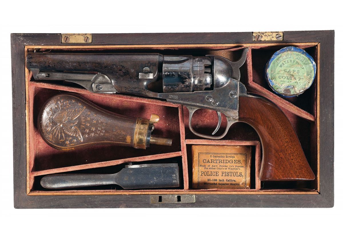 This Colt Model 1862 Police revolver was manufactured in 1863. The revolver has the Colt high polish blue finish on the barrel and fluted five-shot cylinder color casehardened loading lever, frame and hammer, silver-plated trigger guard and back strap and varnished, one-piece walnut grip. The top of the barrel is roll-stamped "ADDRESS COL SAML COLT NEW-YORK U.S. AMERICA" in one line. "COLTS/PATENT" is stamped in two lines on the left side of the frame. "PAT.SEPT.10th 1850" is stamped in one cylinder flute and "36 Cal" is stamped on the left shoulder of the trigger guard. The full serial number "20755" is stamped on the bottom of the barrel lug, frame, trigger guard and back strap. All of the visible serial numbers match. The rosewood case has a scalloped silver plate inlaid in the lid. The interior is lined with red felt and has five compartments. The case contains a full set of accessories that include: (1) a 250 cap tin of Eley Bros., percussion caps with green label and blue wrapper, (2) "COLTS/PATENT" Eagle and Shield Colt Police Model powder flask with fixed charger, niter blue spring, gold-plated top and brown lacquer body, (3) blue iron double cavity straight leg bullet mold marked "COLT'S/PATENT" in two lines on the sprue cutter and "36B" on the right block and (4) sealed package of five American Powder Co., "Combustible Envelope Cartridges" for "Police Pistols".