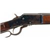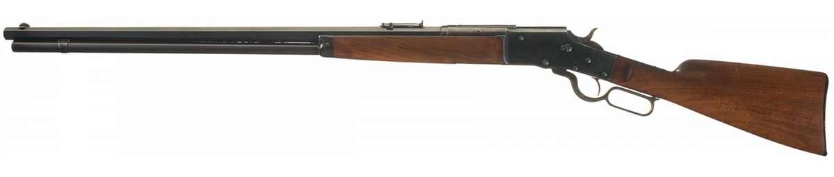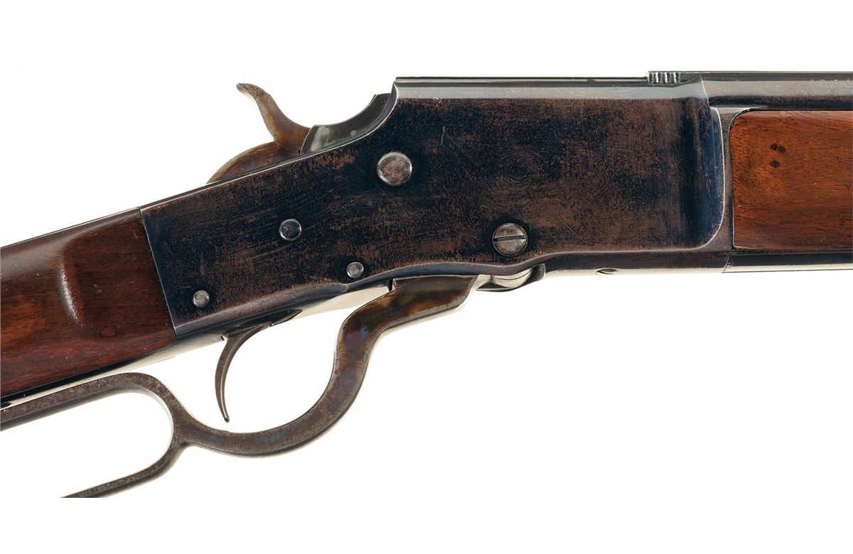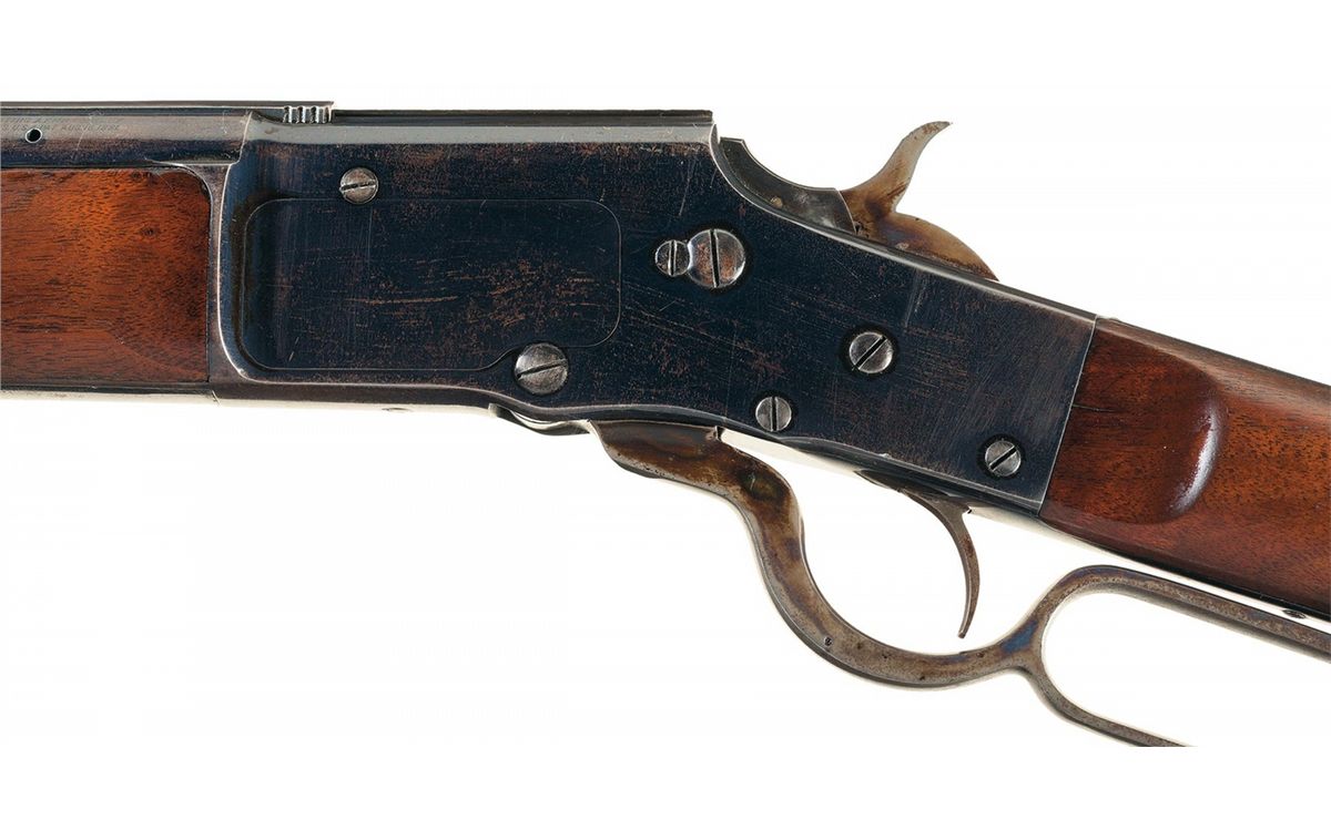 Bullard rifles are considered very rare on the collector market today as they were produced only from 1886 to 1890. They competed for sales directly against the Winchester, Marlin and Whitney lever actions rifles also produced during this time. This fierce competition really stymied their sales creating a very limited production of Bullard rifles (approximately 10,000 to 12,000). This rifle employs a very long receiver/action that houses a brass cartridge lifting mechanism, (very similar to the Winchester 1876 rifles) to accommodate the larger and longer cartridges. It has a 6 1/4 inch straight cylindrical bolt (similar to the 1873 and 1876 Winchester rifles). This bolt has a unique two tooth gear mechanism at the rear that engages a similar two tooth geared mechanism on the front of the breechblock. This geared mechanism is operated by the loading lever and basically acts as the locking lug for the rifle bolt which gave it far more strength to withstand higher pressure of the larger cartridges. The left side of the receiver has a small side plate that allows access to the mechanism inside and the loading gate for the tubular magazine is located on the under side of the receiver. The rifle features a full magazine and is equipped with a Lyman ivory bead front sight, rifle style ladder rear sight and the upper tang has been drilled and tapped for a tang sight. The left side of the receiver is marked "BULLARD REPEATING ARMS COMPANY/SPRINGFIELD MASS. U.S.A. PAT. AUG. 16. 1881." marking and the right side is marked "Model 1886". The top front of the receiver is marked "Cal/45." The serial number is on the rear of the frame just behind the hammer slot and also found inside top and bottom tangs at the tips and on the face of the buttstock inside the action. Straight grain smooth American walnut straight pistol grip stock featuring an iron end cap and checkered hard rubber Bullard buttplate.
